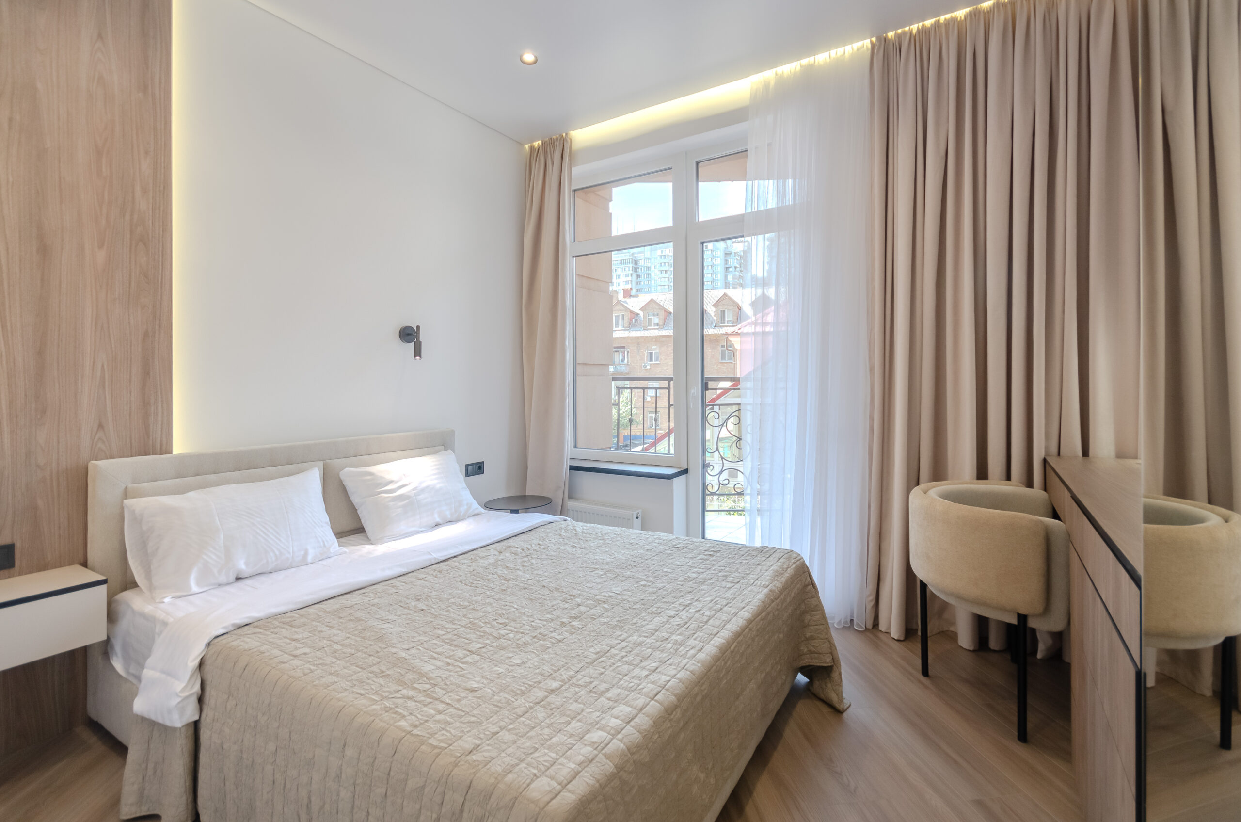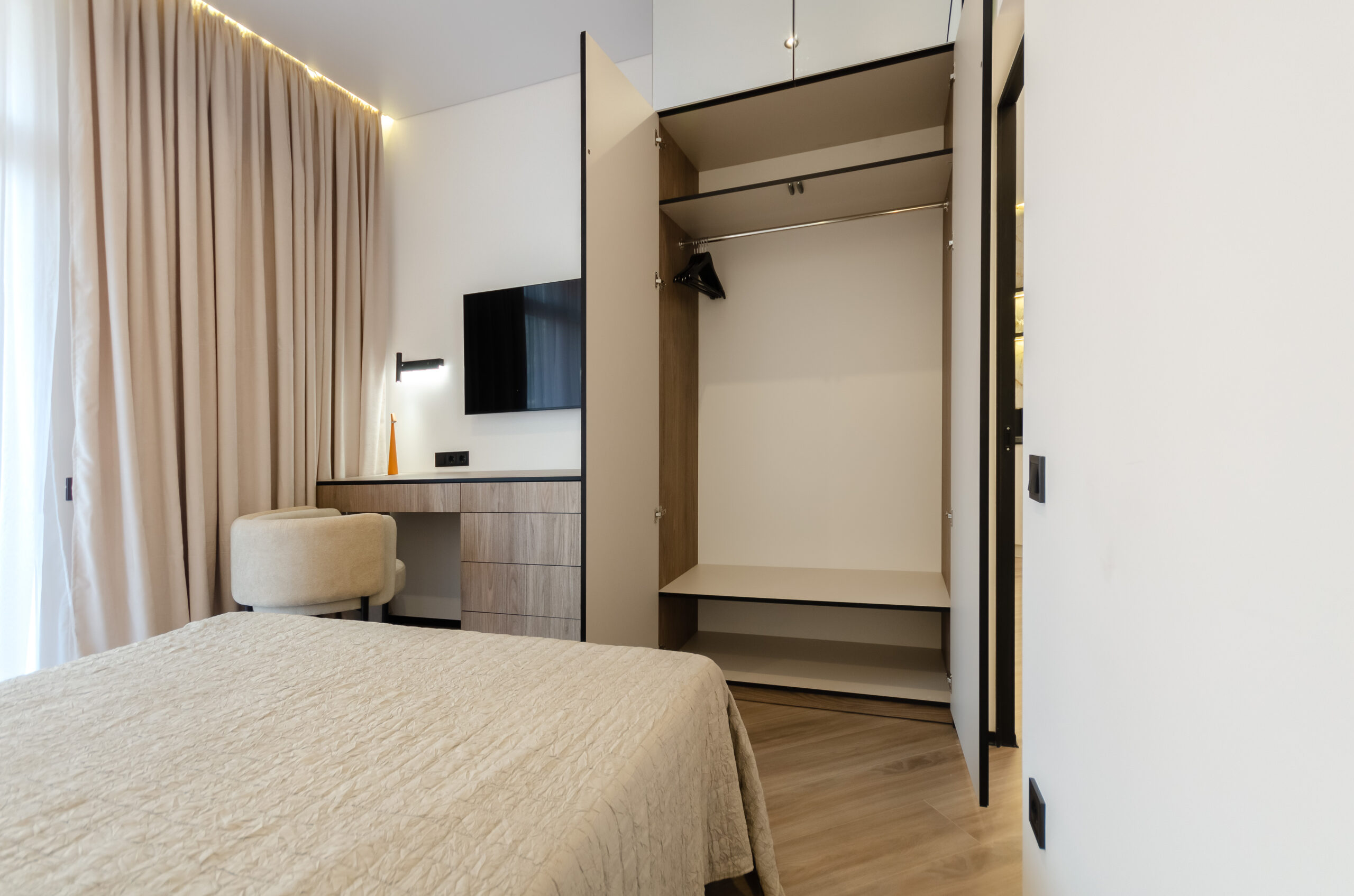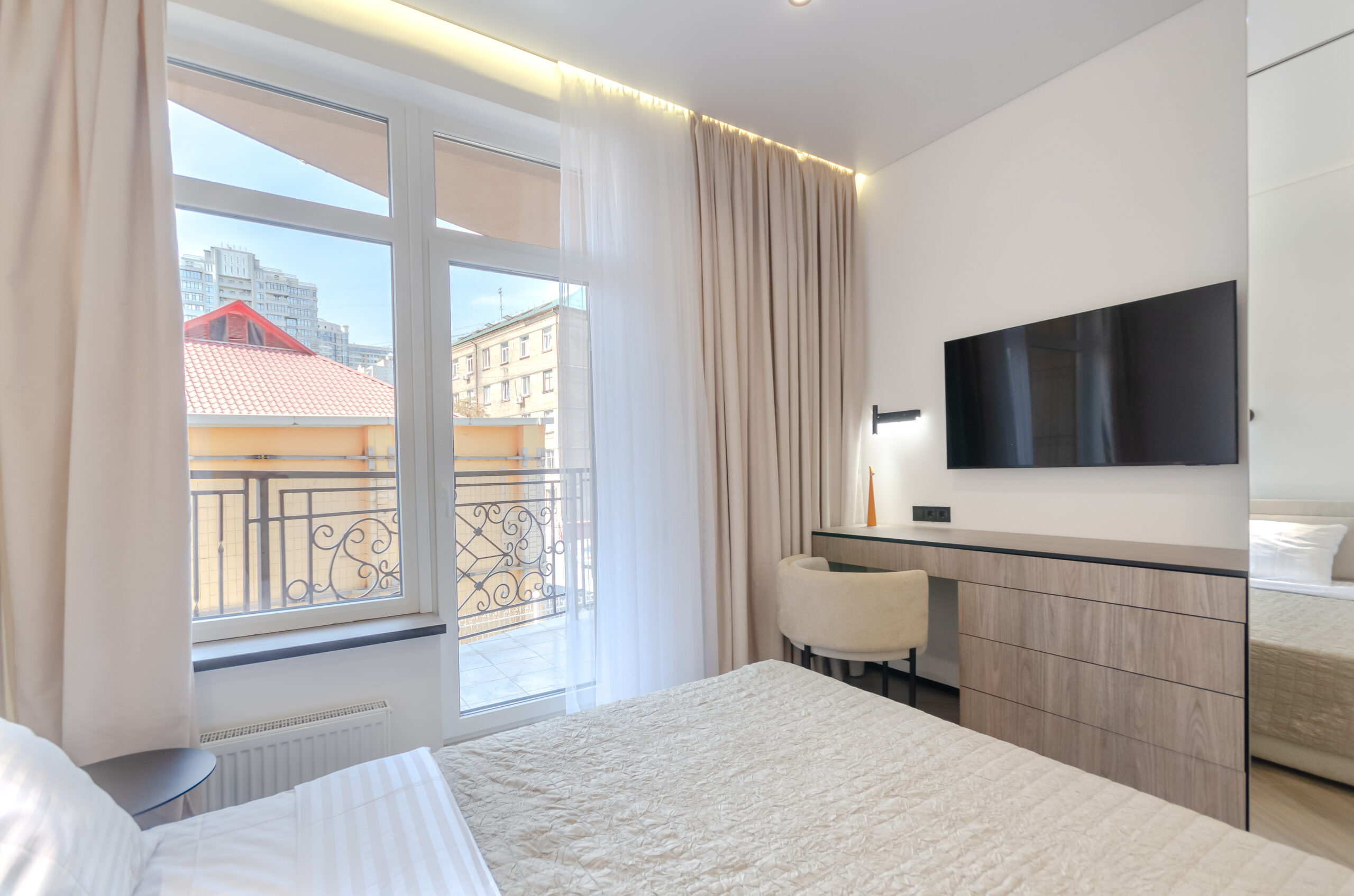 *Separate bedroom: comfortable bed 160*200 cm, smart TV, wardrobe, dressing table, desk with a comfortable stylish chair, access to the balcony.