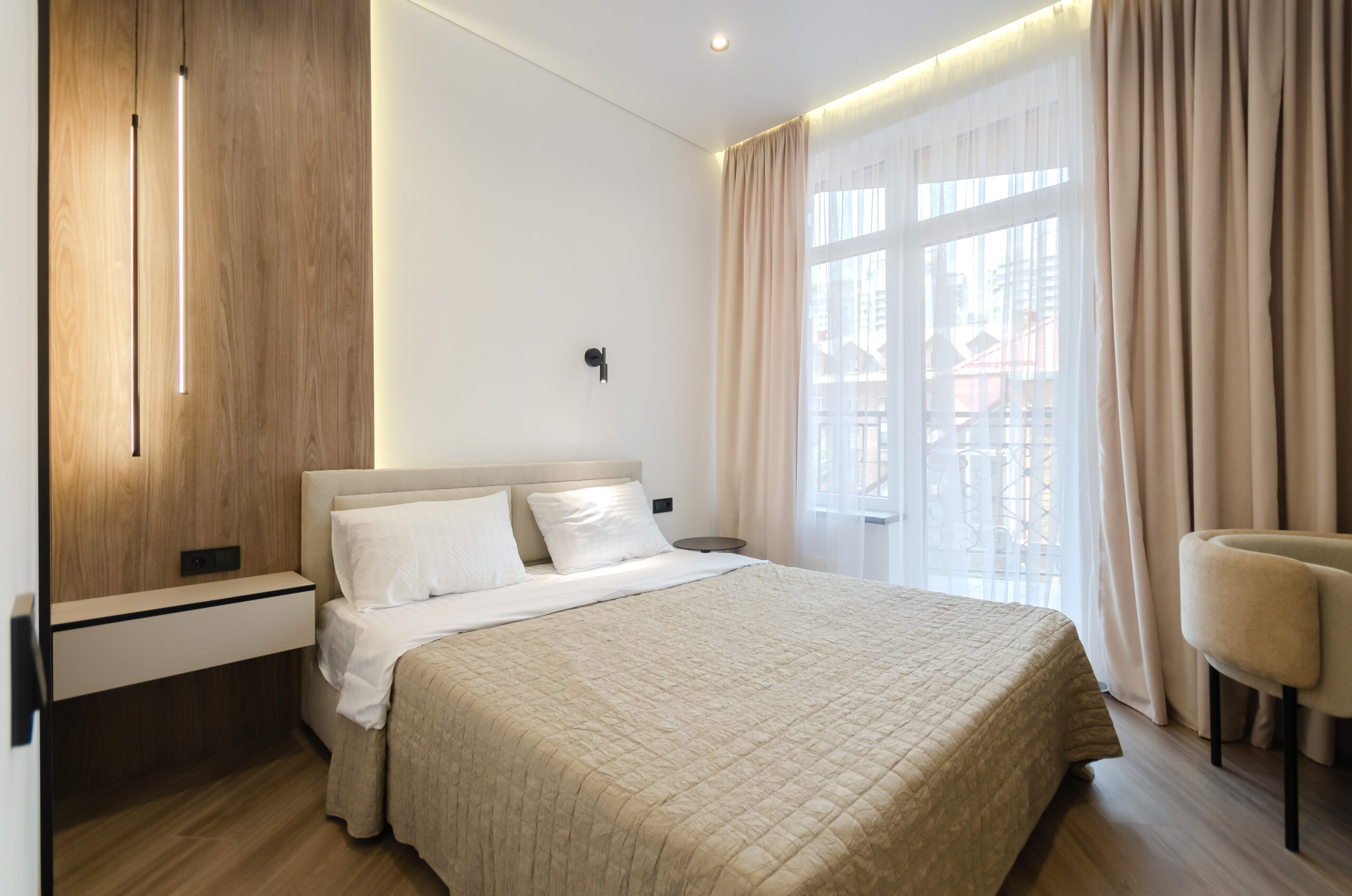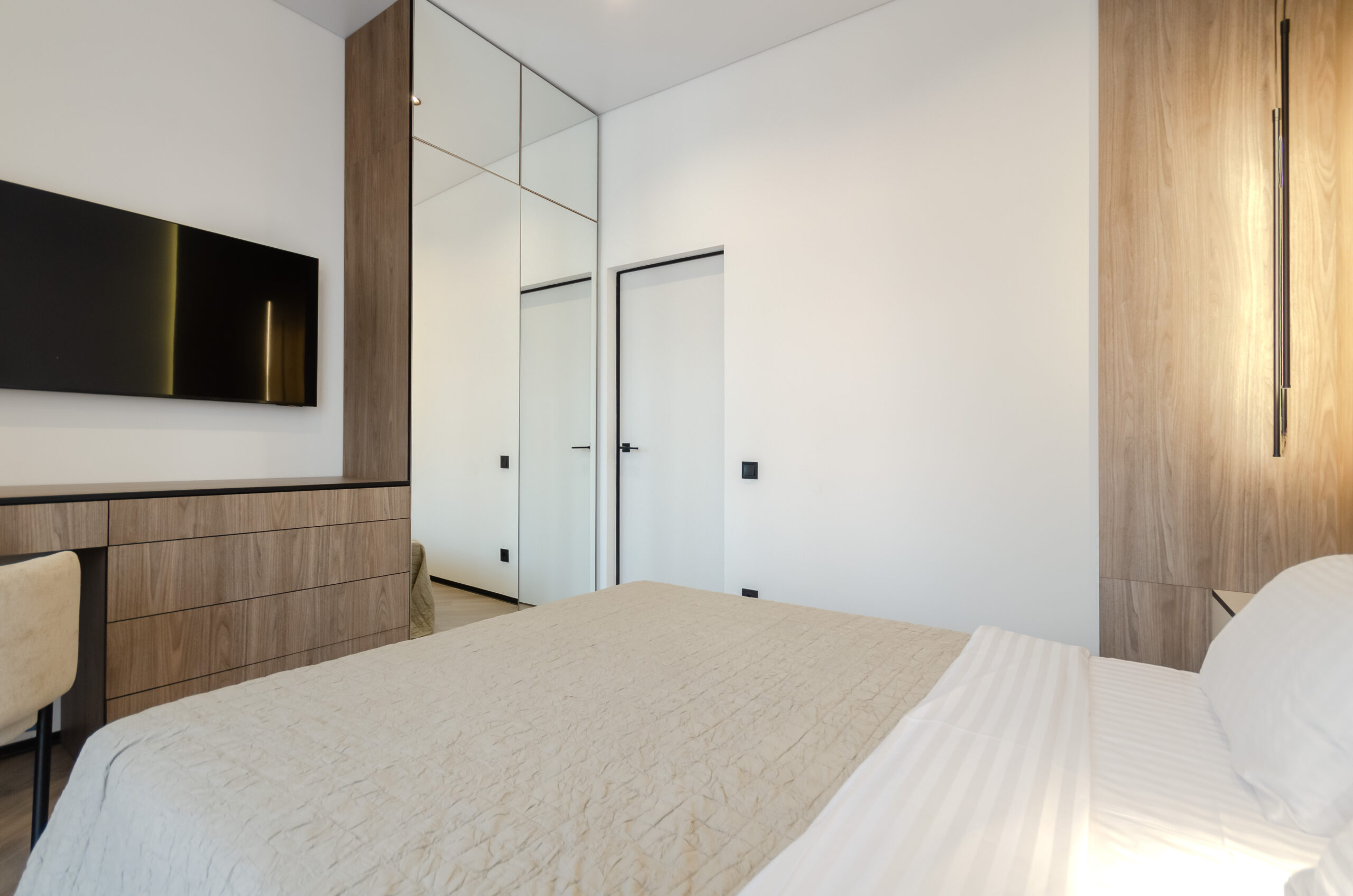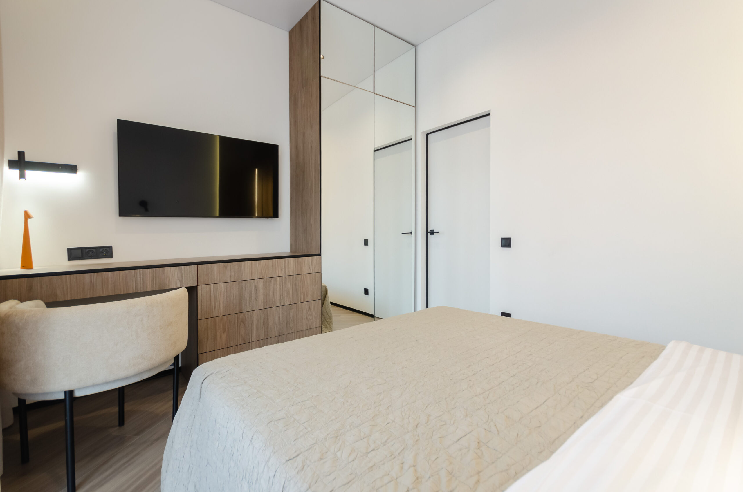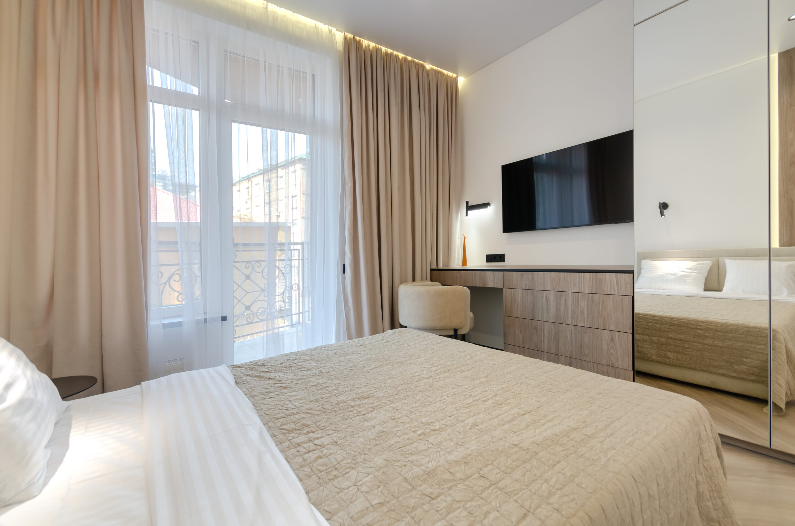 *Separate bedroom: comfortable bed 160*200 cm, smart TV, wardrobe, dressing table, desk with a comfortable stylish chair, access to the balcony.