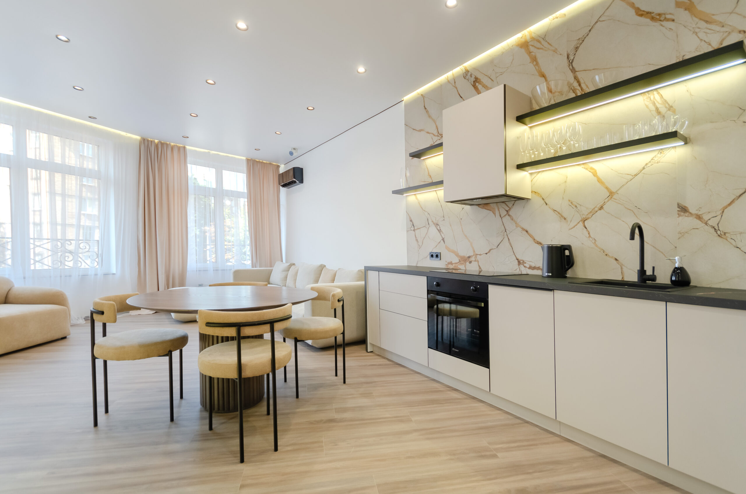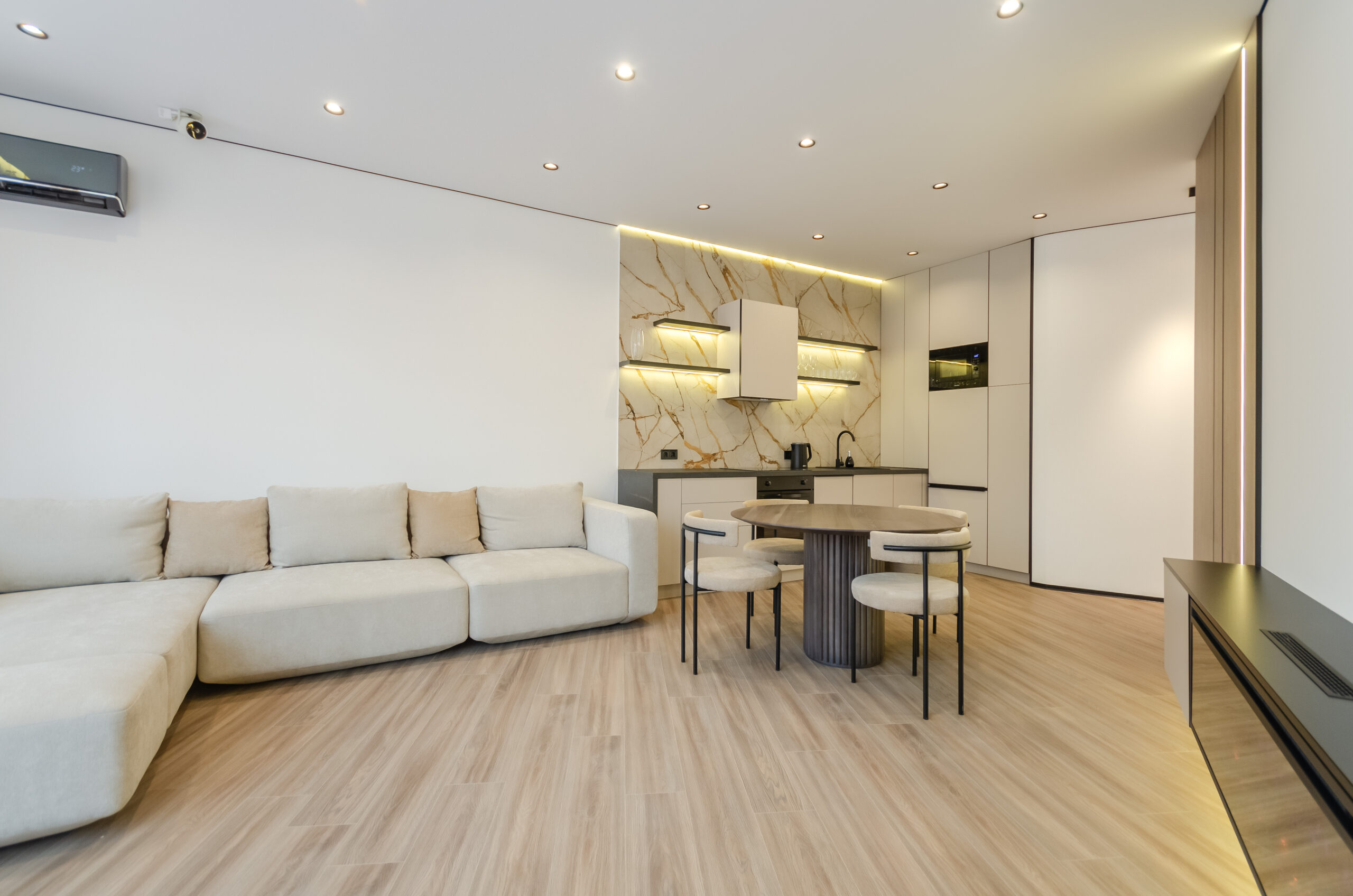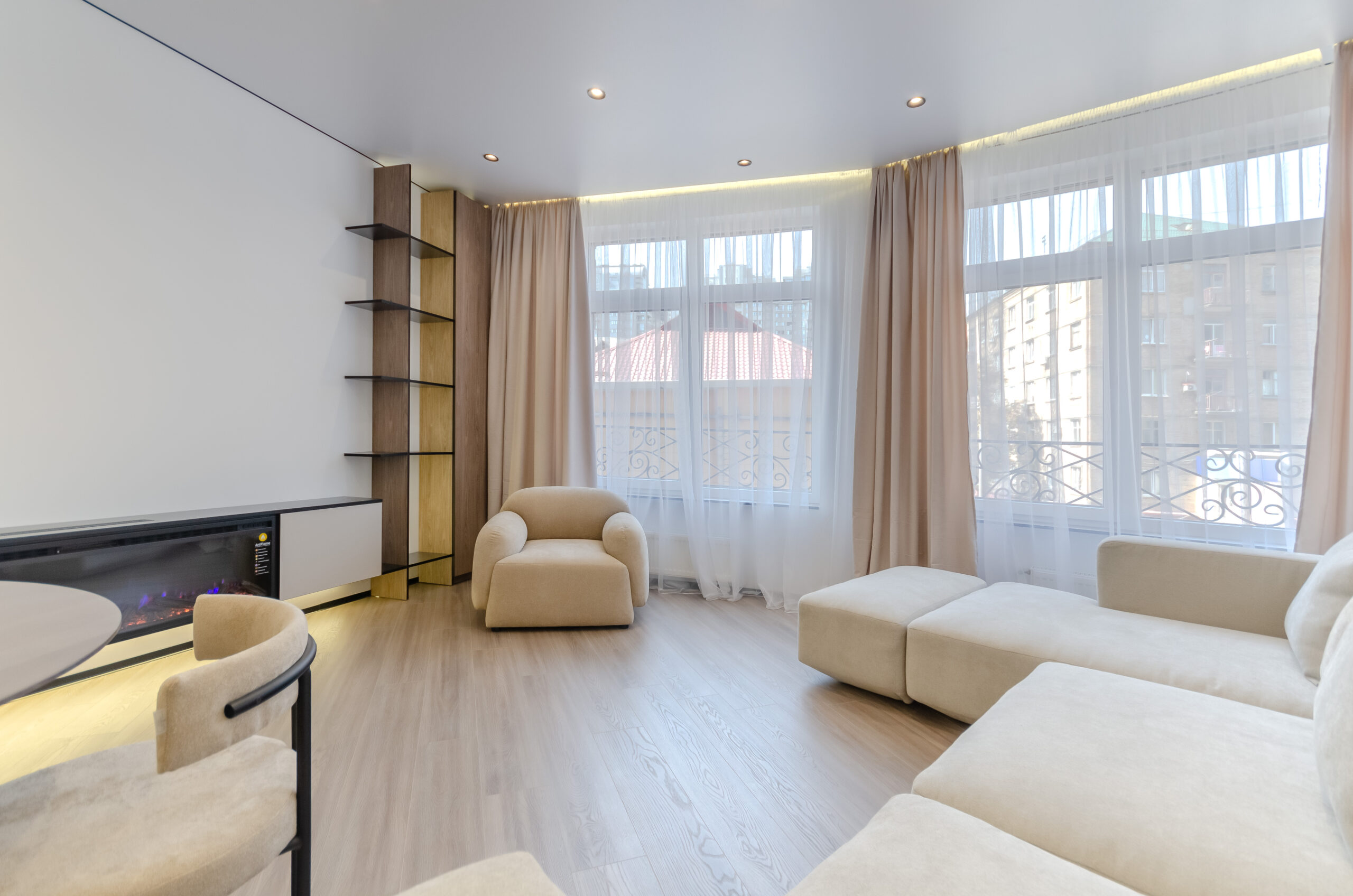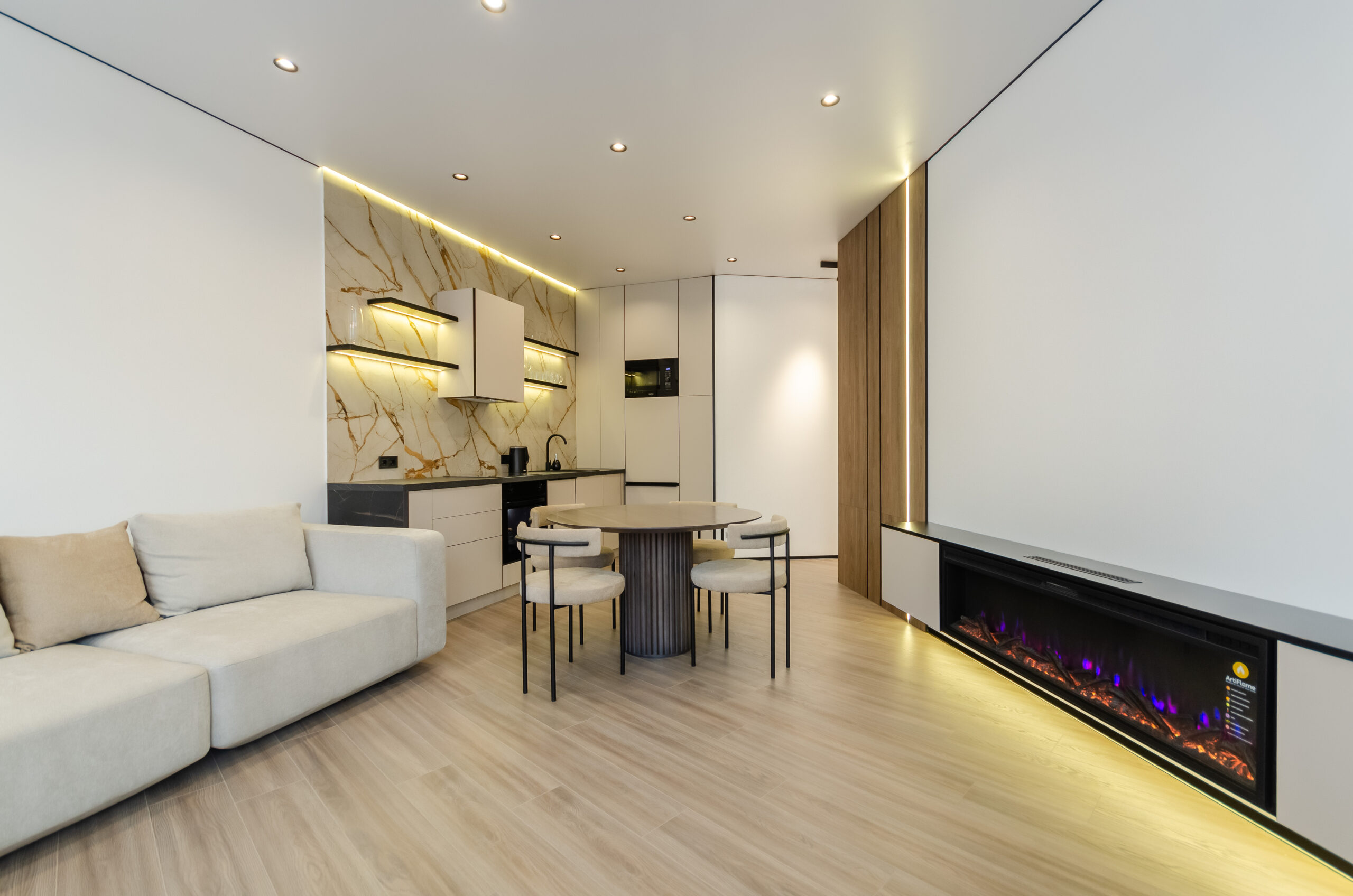 *Living room (divided into zones, including kitchen): soft large sofa ( berth160*200 cm),built -in projector to watch your favorite movies and series on the big screen board, an electric fireplace that adds a cozy atmosphere, an electric fireplace that adds a cozy atmosphere, air conditioning.