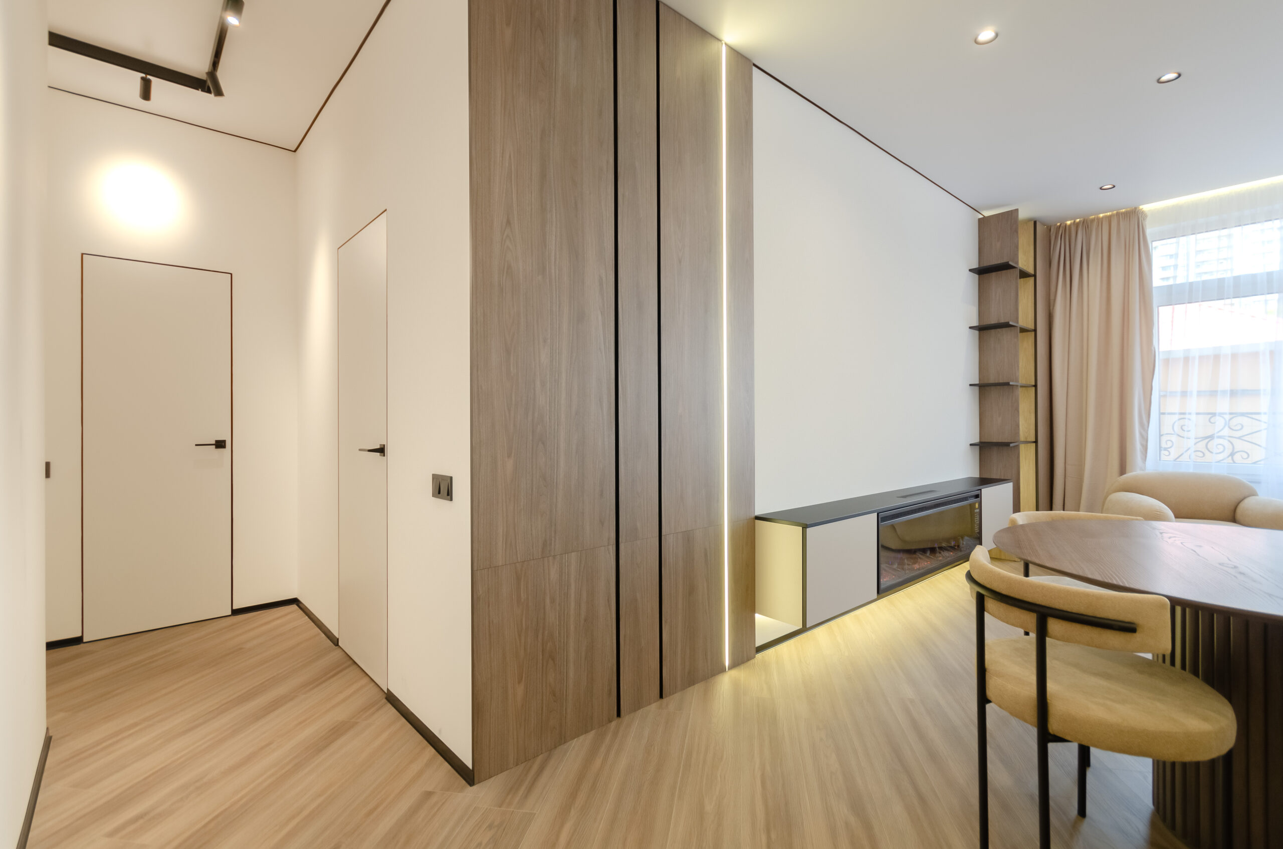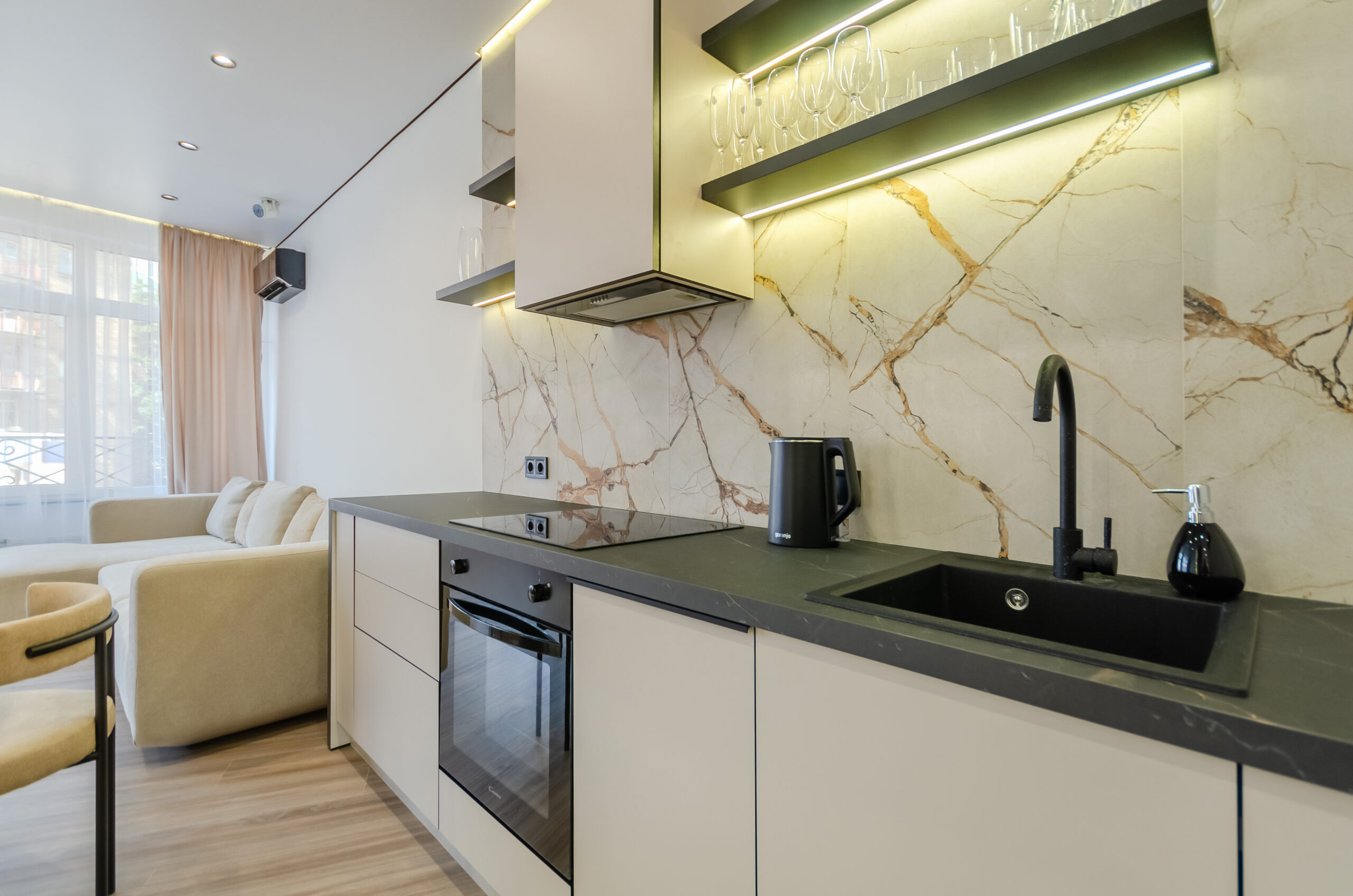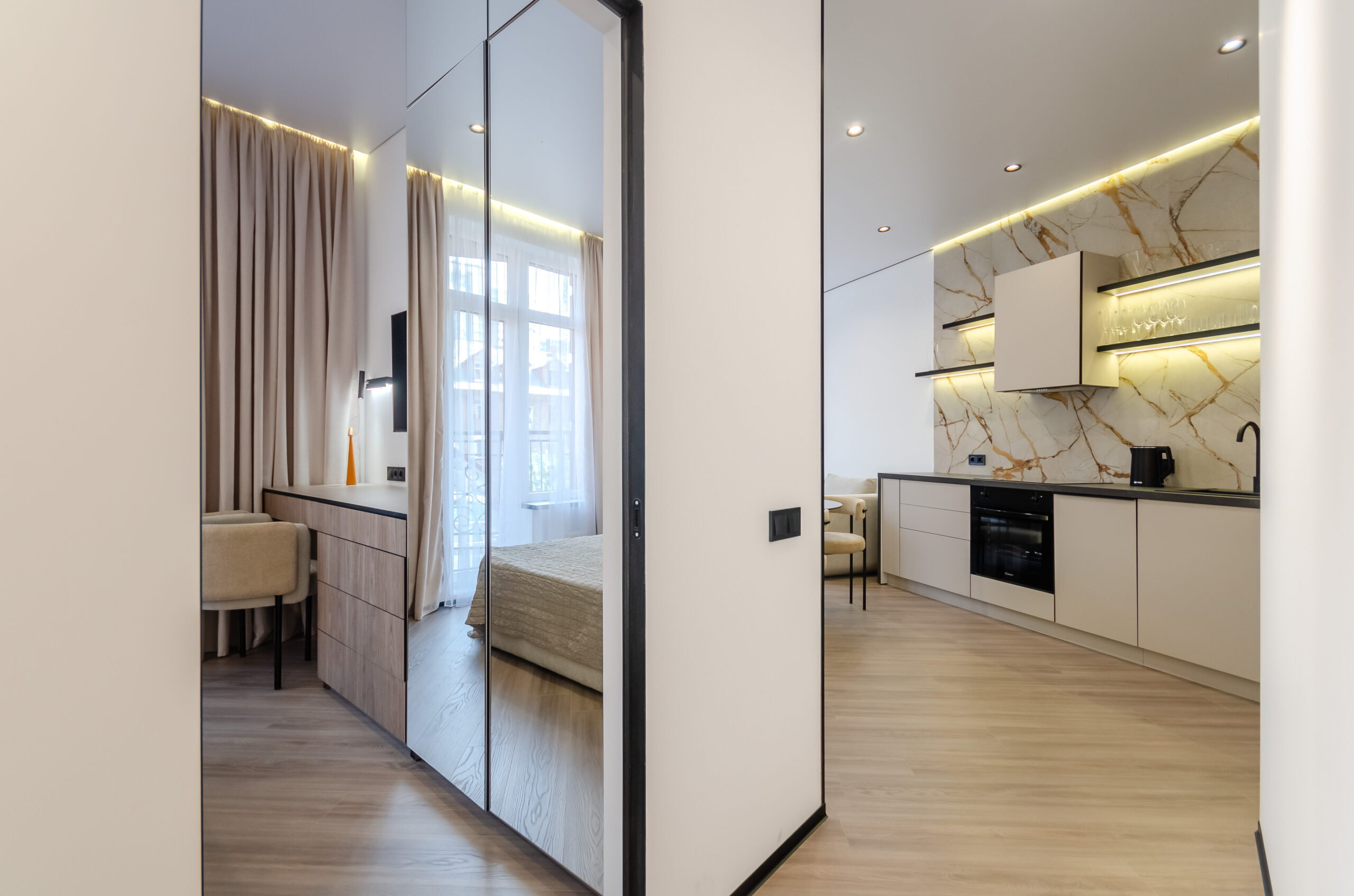 *Living room (divided into zones, including kitchen): soft large sofa ( berth160*200 cm),built -in projector to watch your favorite movies and series on the big screen board, an electric fireplace that adds a cozy atmosphere, an electric fireplace that adds a cozy atmosphere, air conditioning.