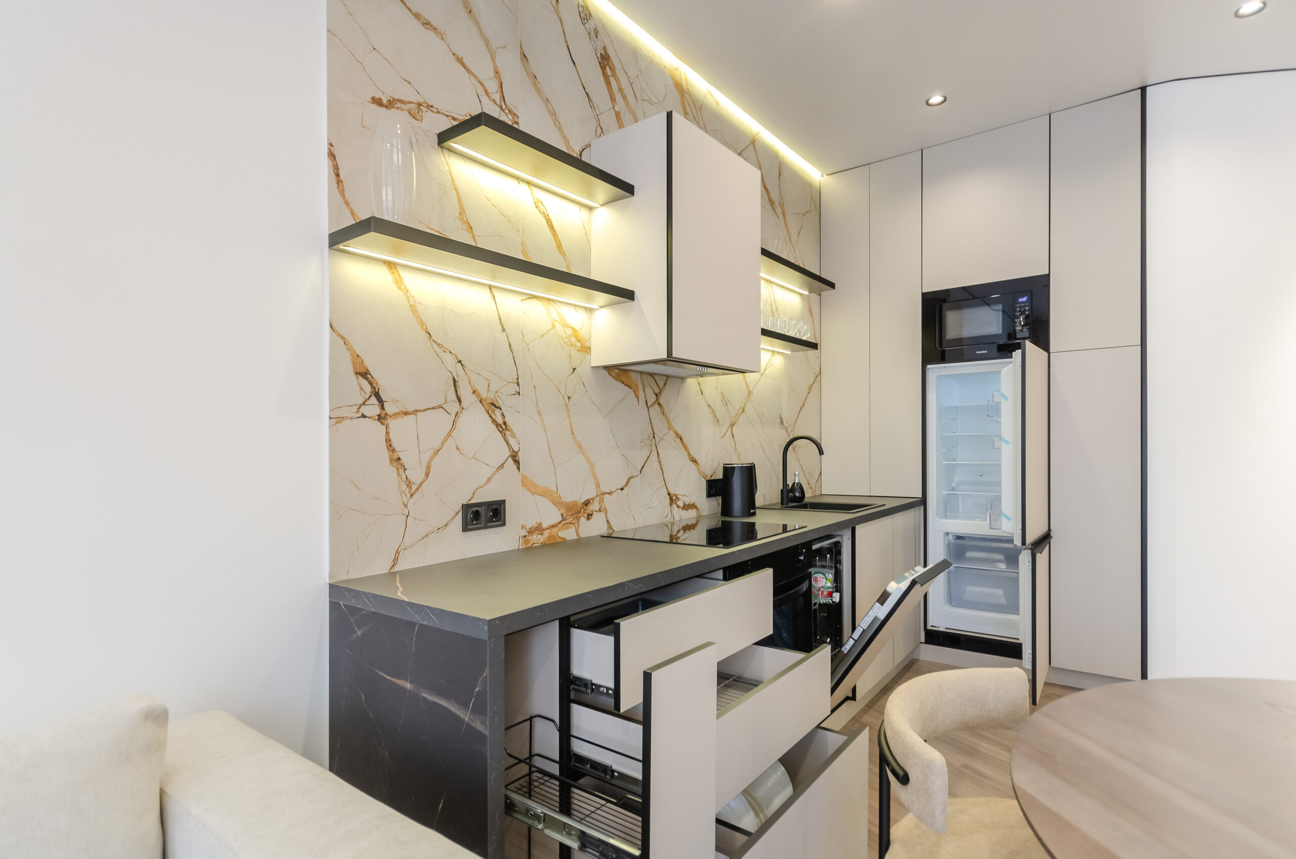 *Fully equipped kitchen (located in the living room): wooden dining table with cute soft chairs, refrigerator, microwave, kettle, electric stove, oven, dishwasher, boiler, pots, pans, and all the necessary utensils: plates, cups, glasses etc.