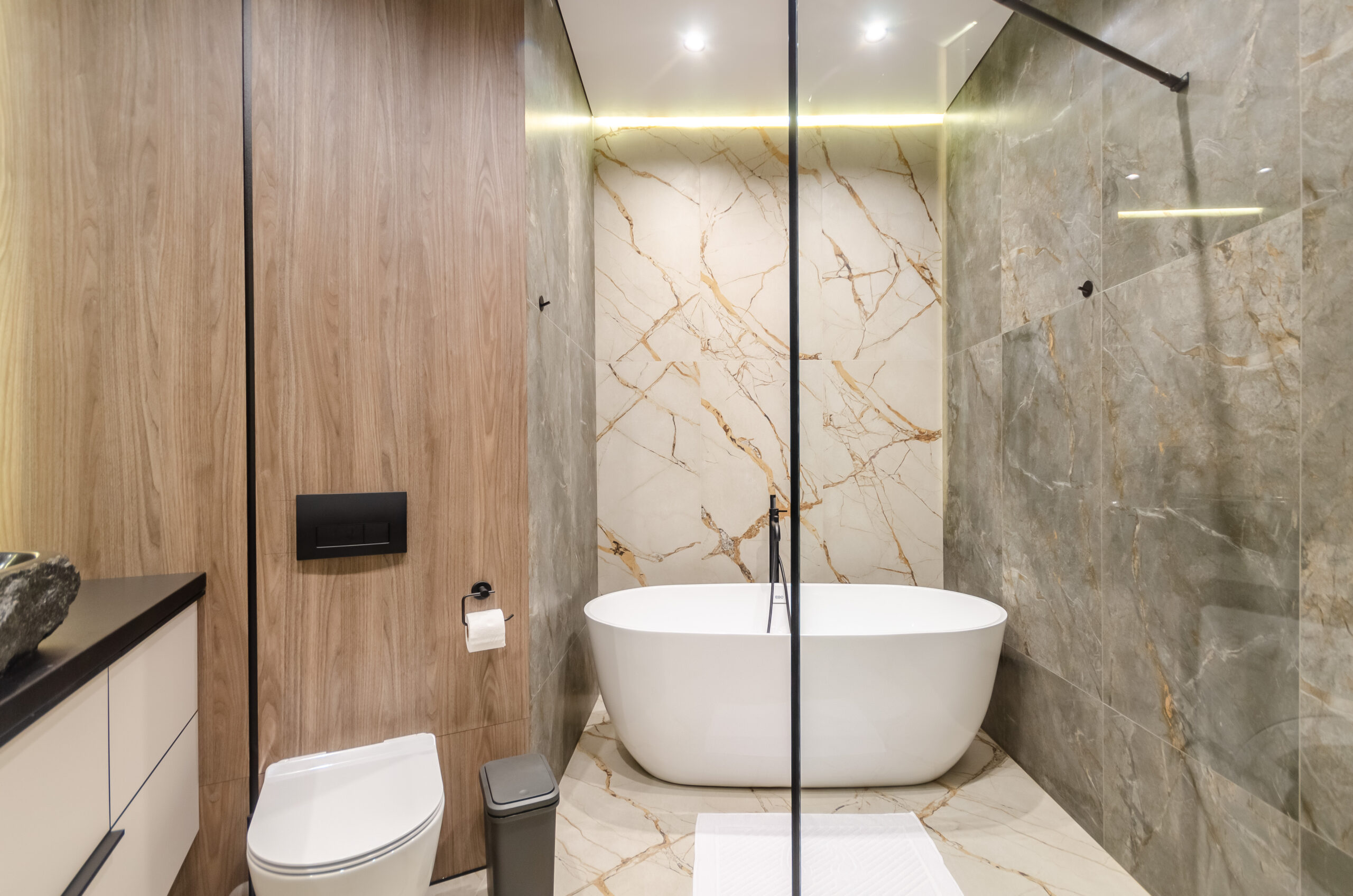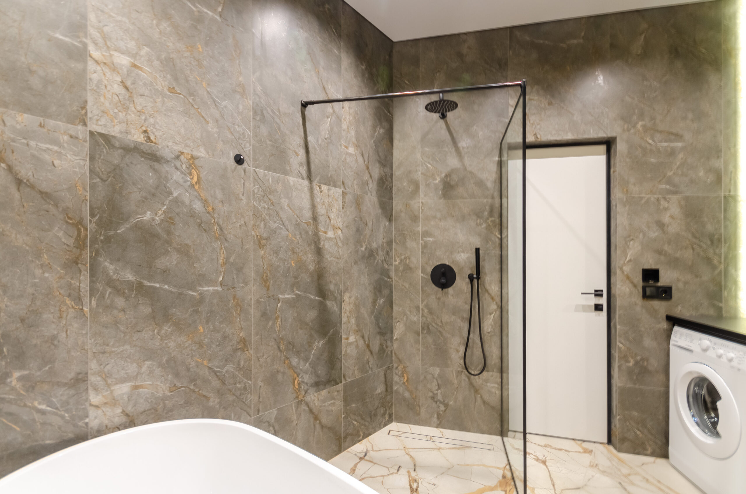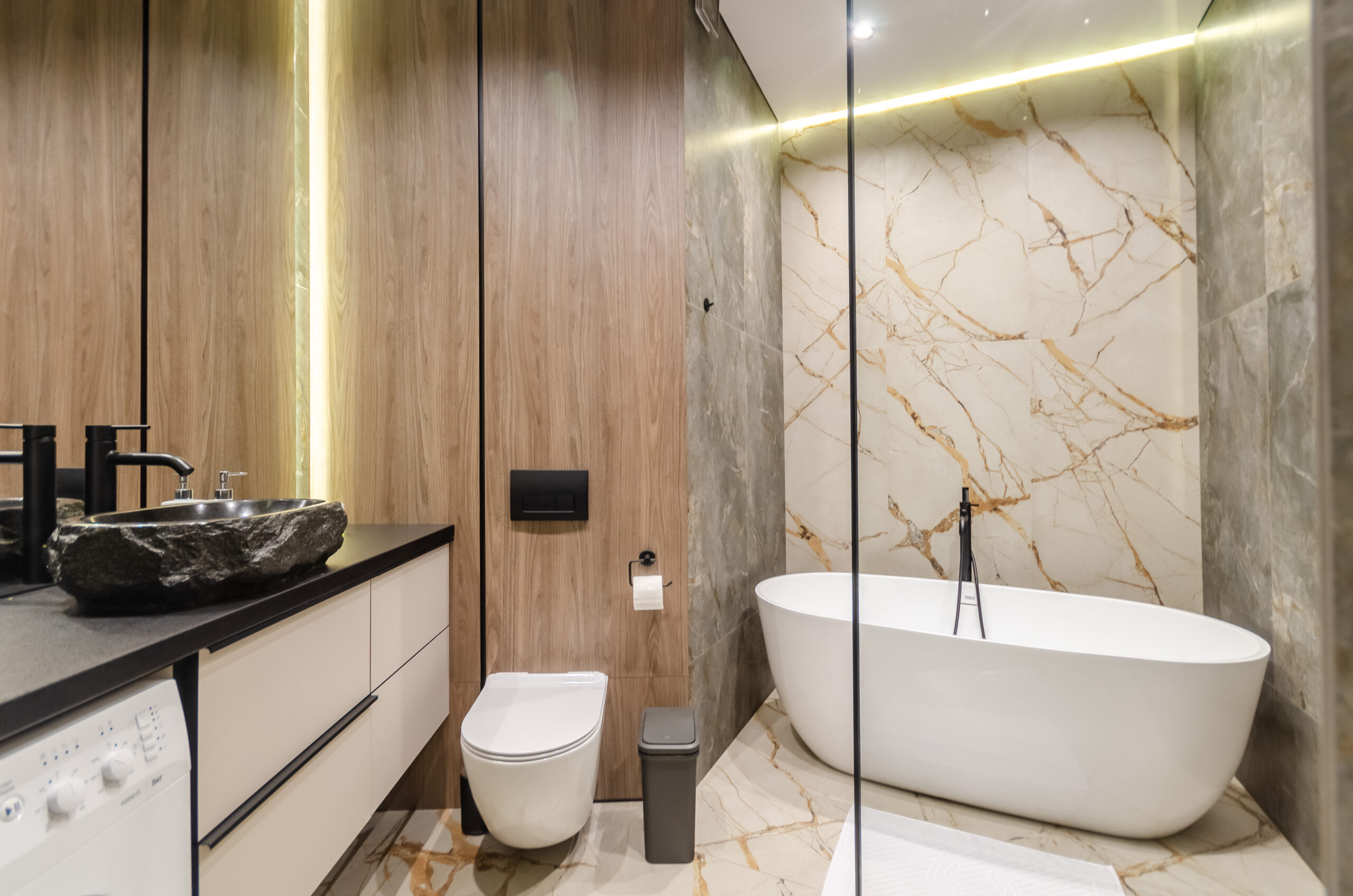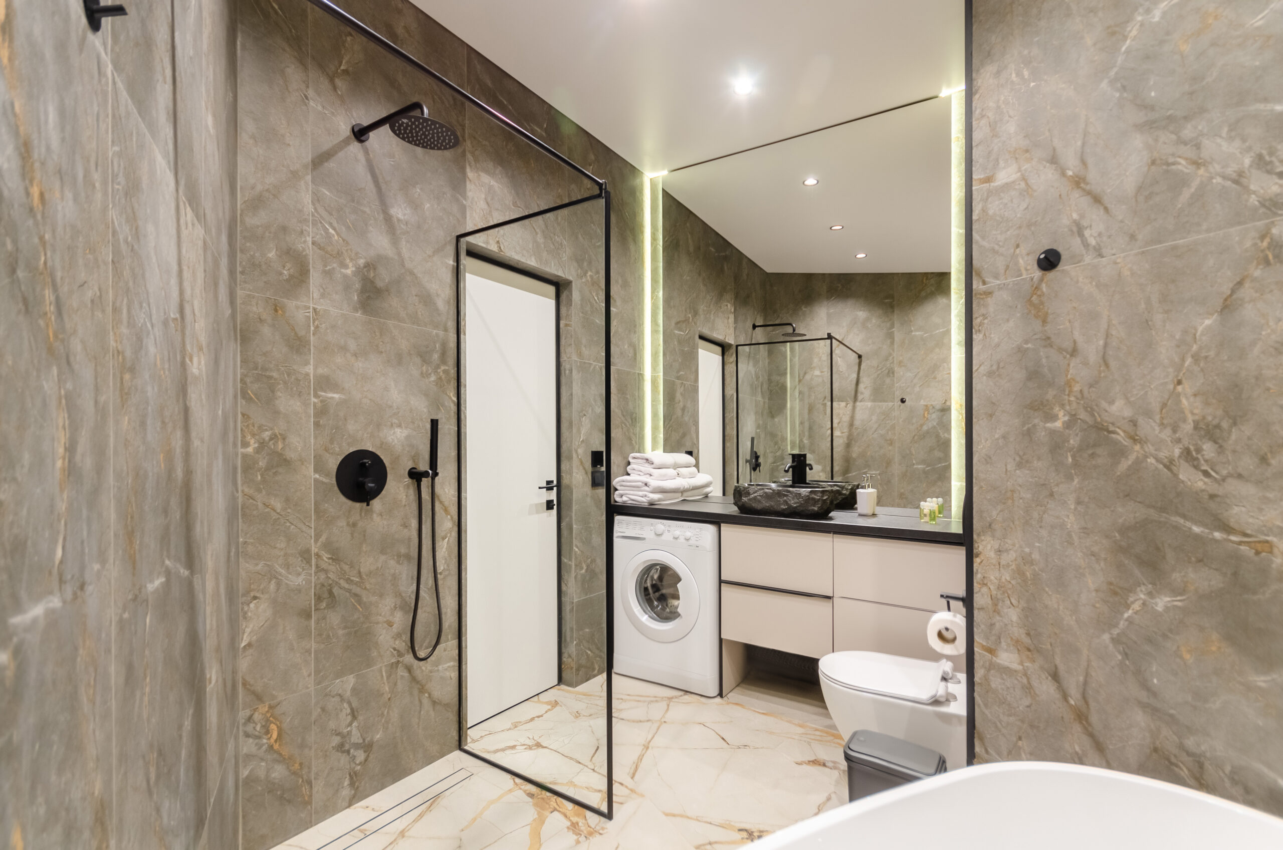 *Bathroom: shower and bath, natural stone washbasin, washing machine, toiletries, hair dryer, towels.