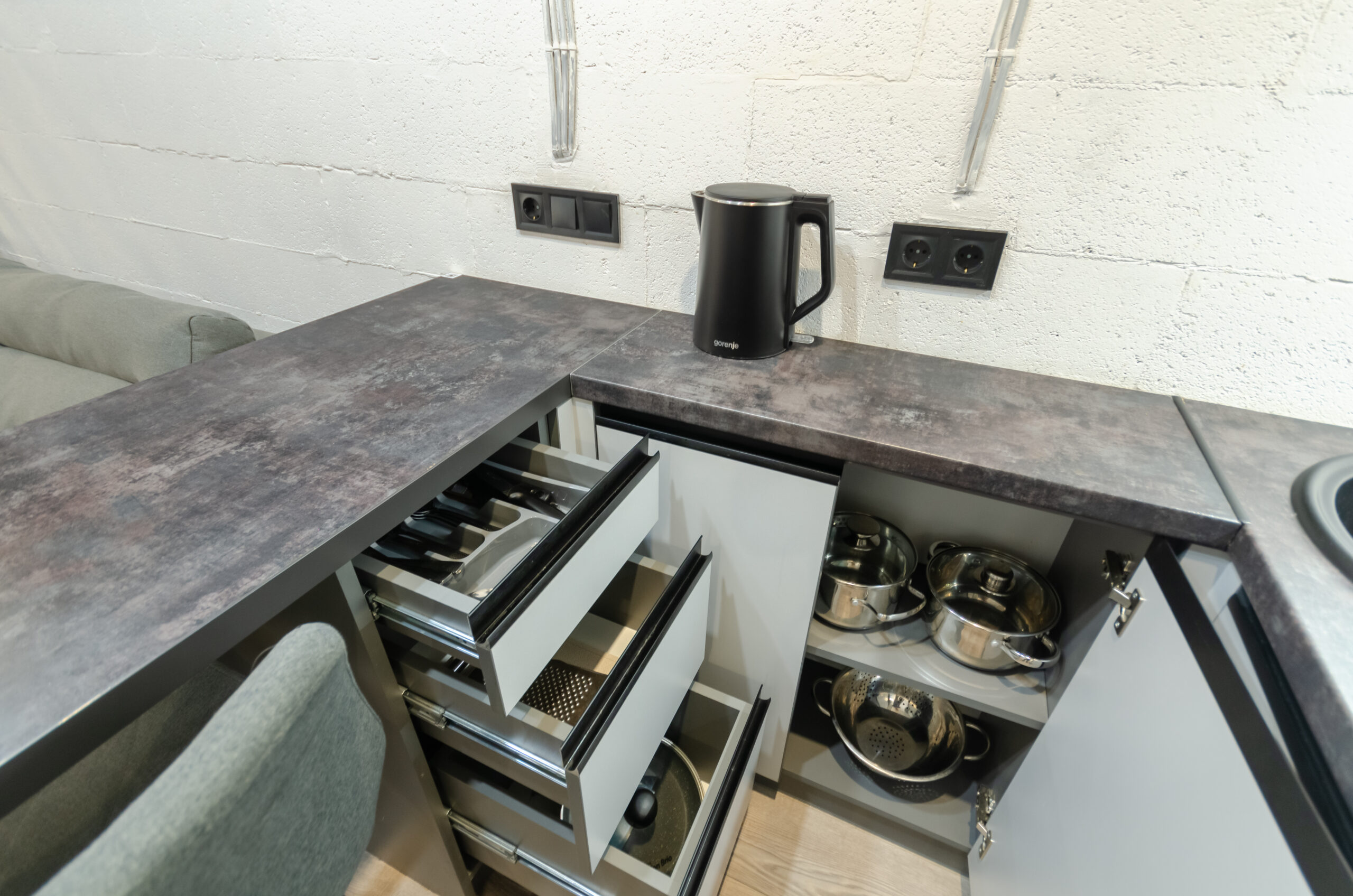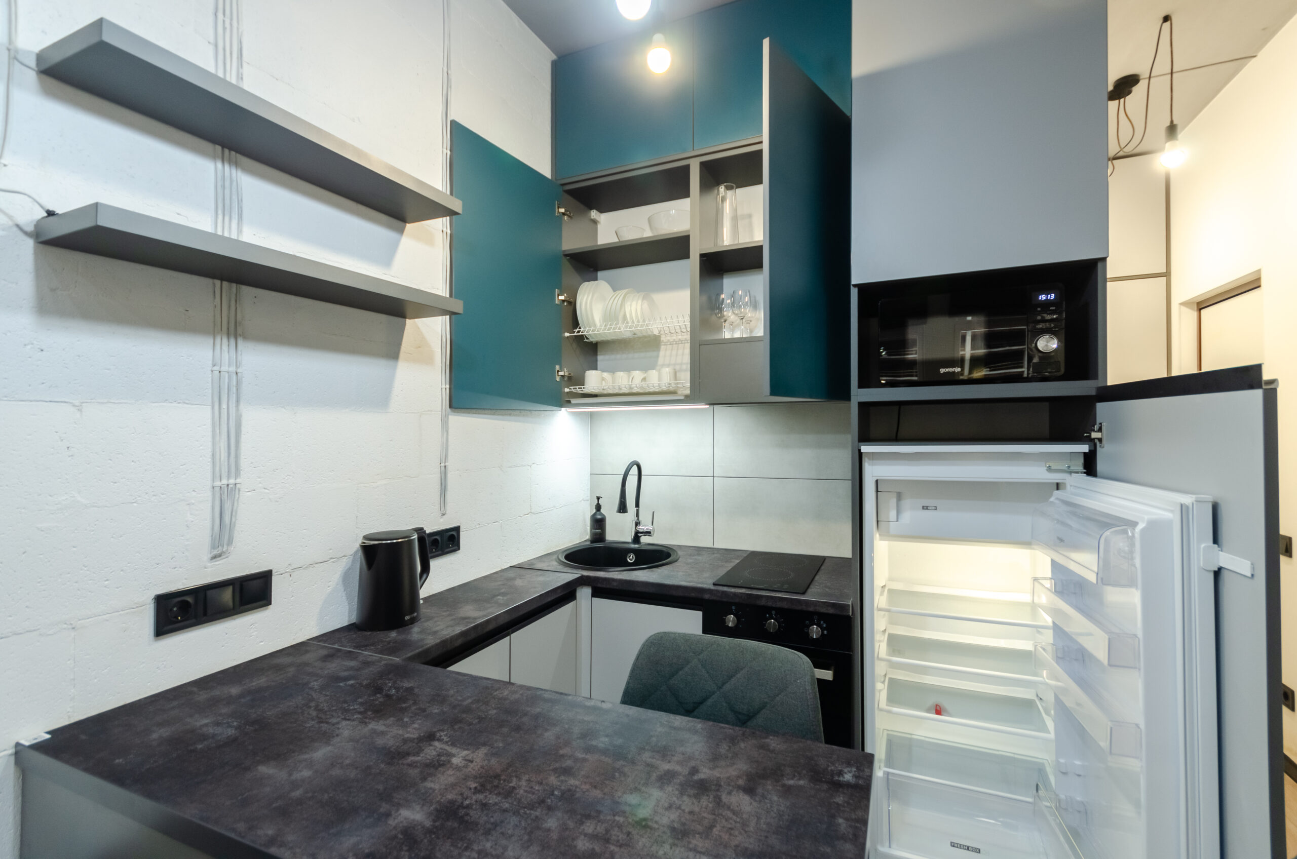 *kitchen area: (refrigerator, microwave oven, kettle, electric stove, pots, pans, all necessary dishes, cups, glasses, dining area).