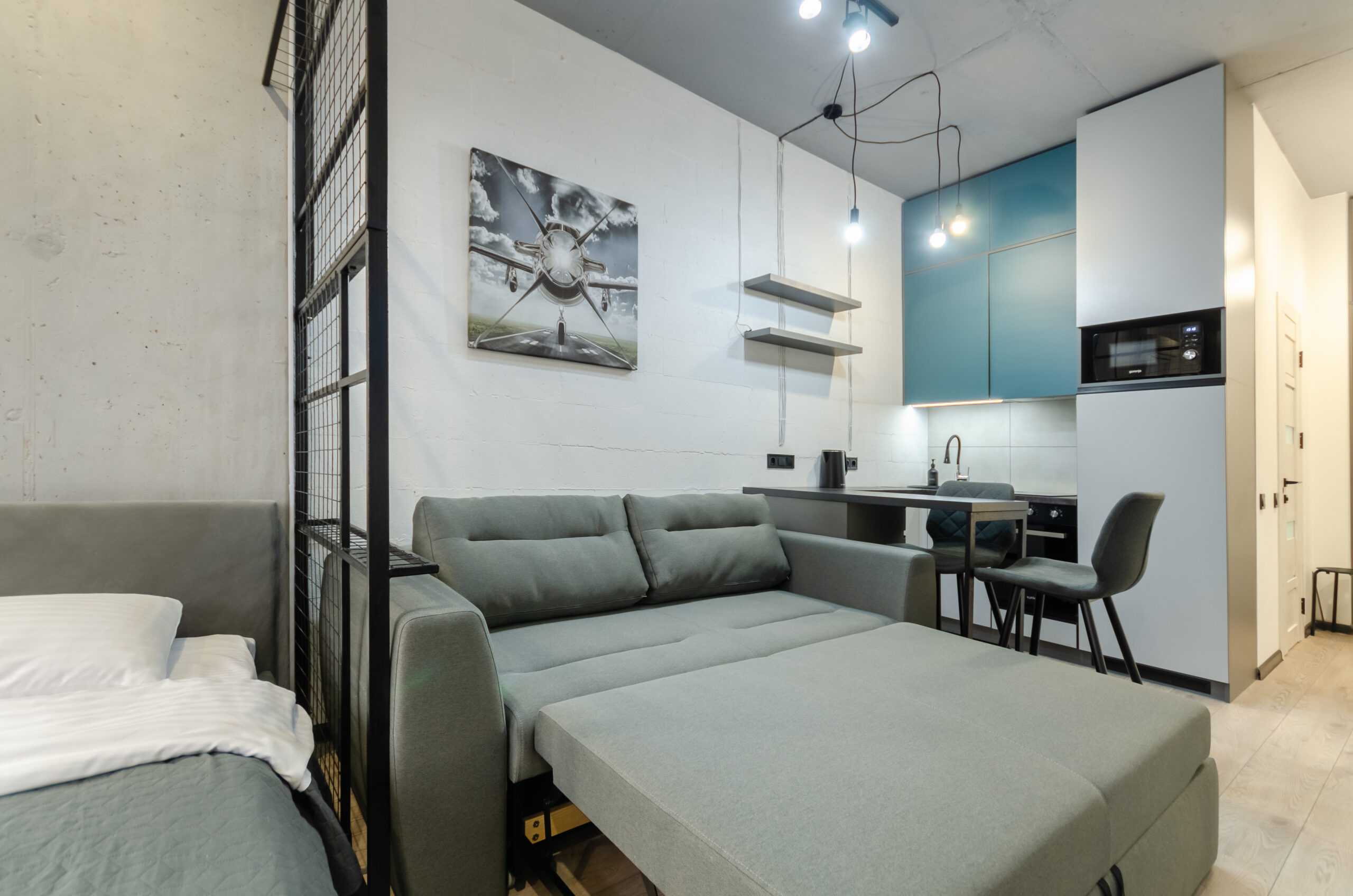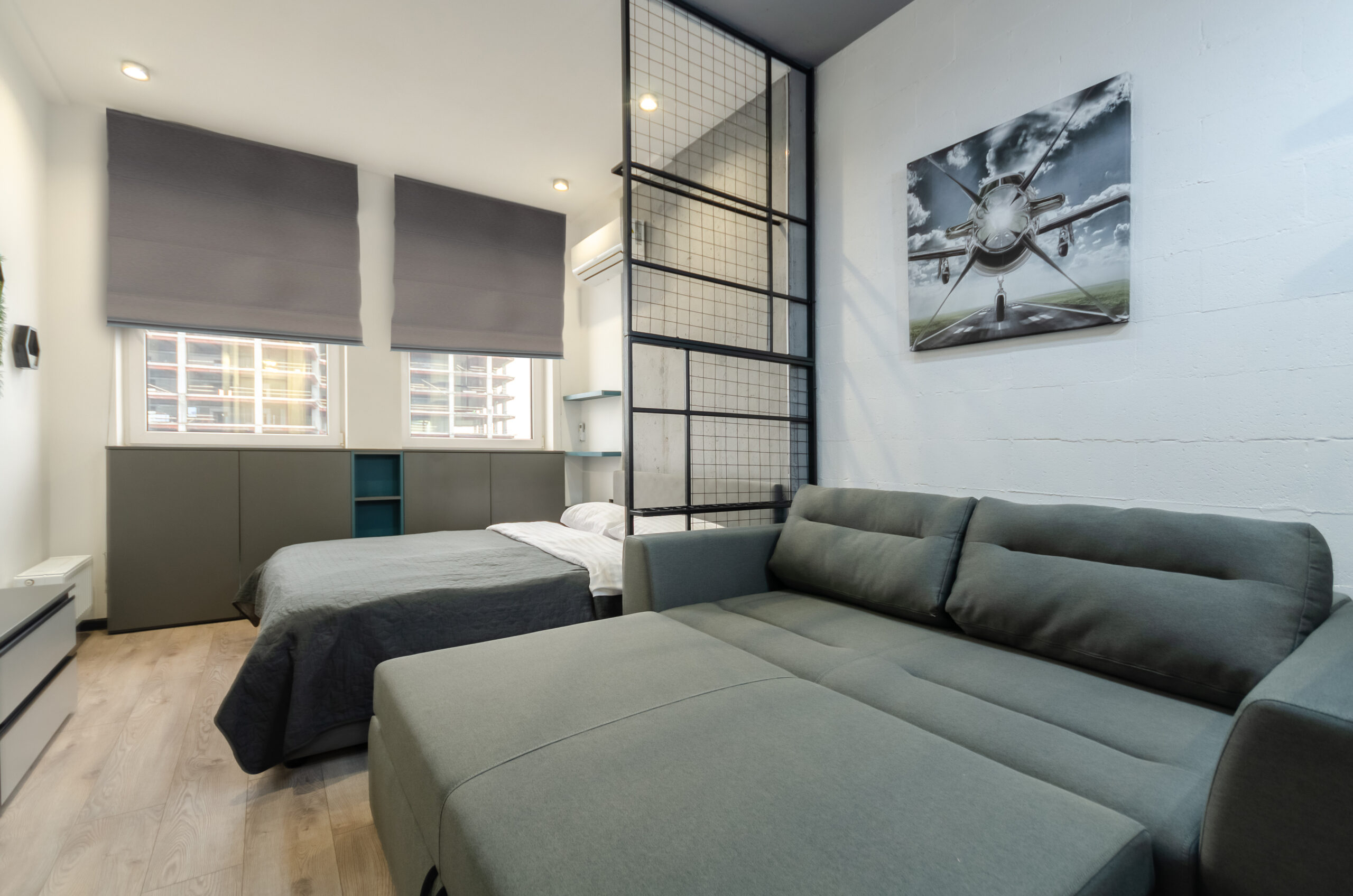 * bedroom area (bed 1600 x 2000 mm, sofa,electric fire,desk, air conditioner, smart TV, clothes rack);