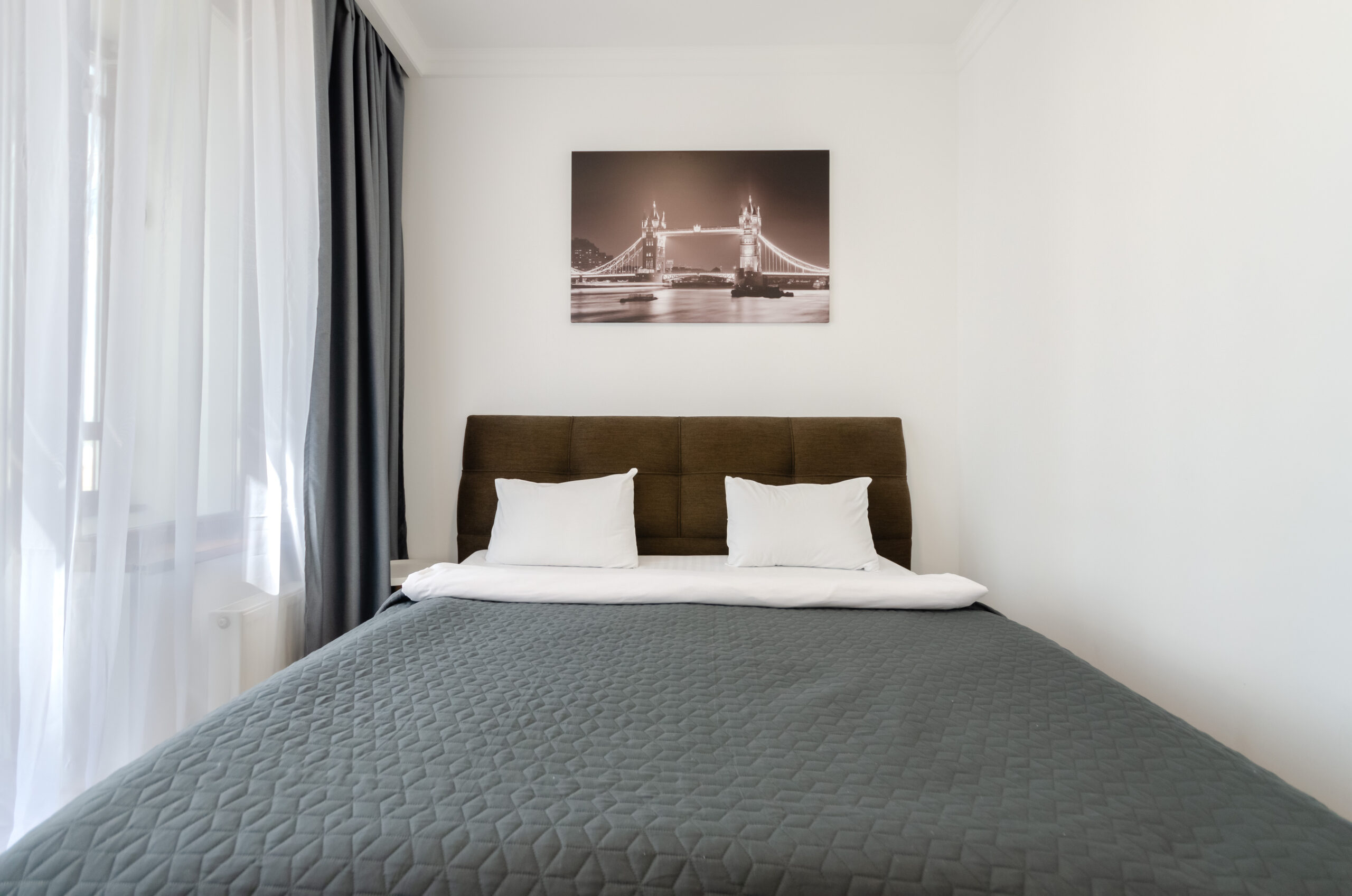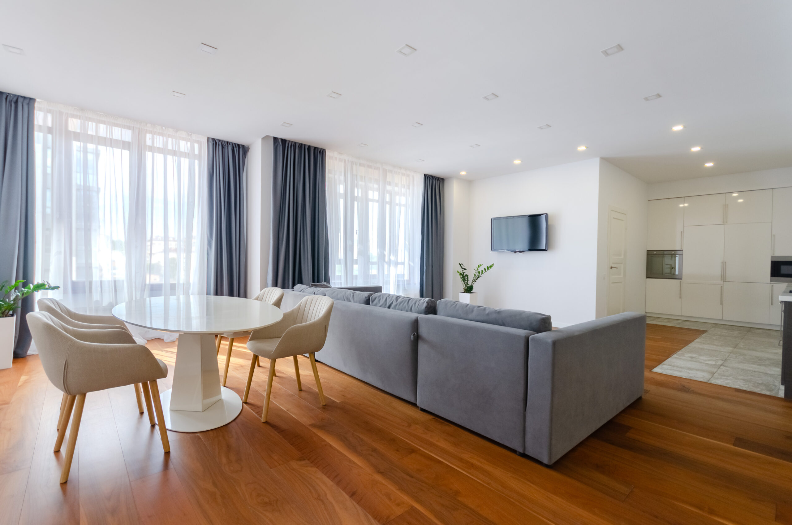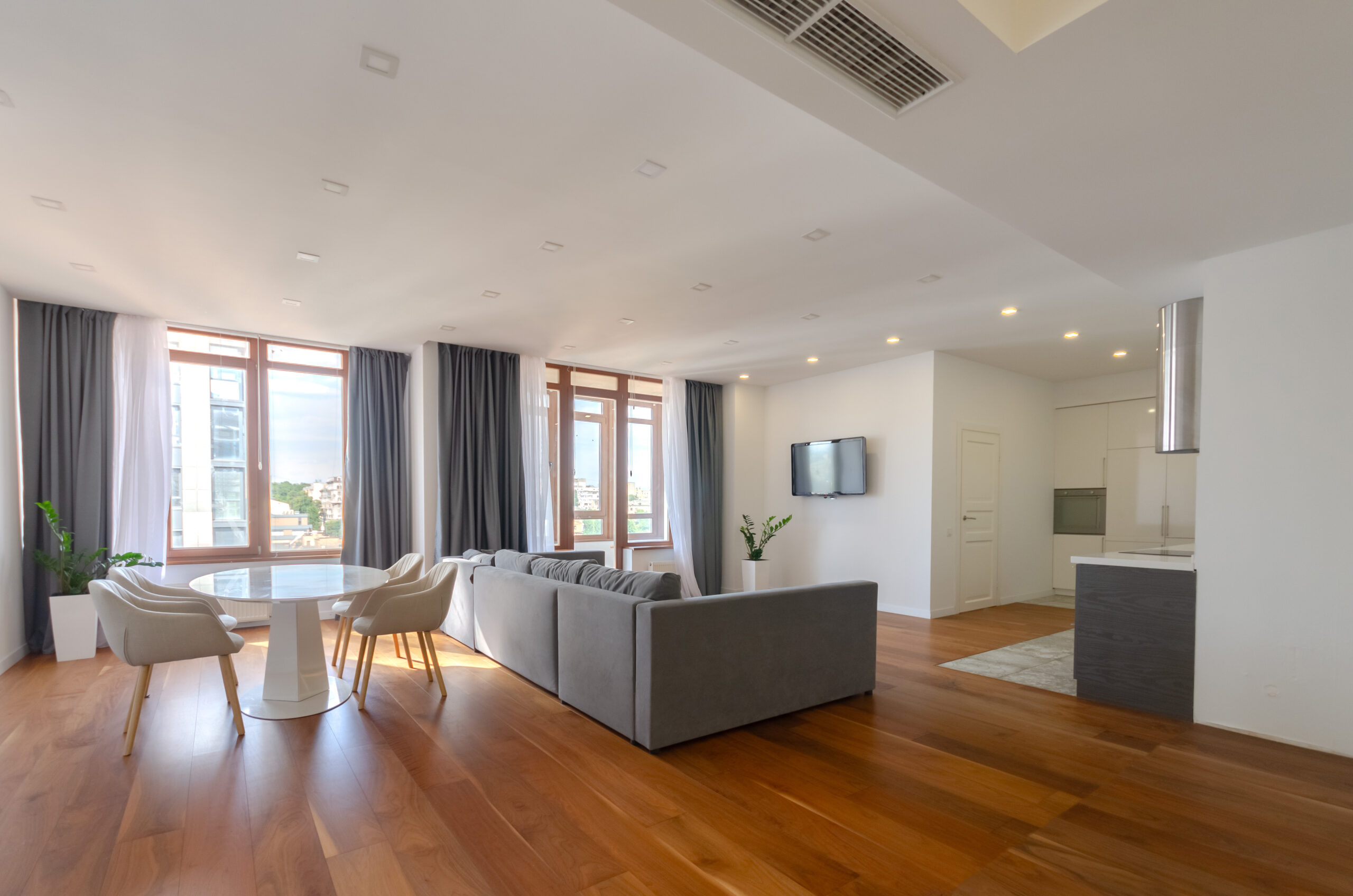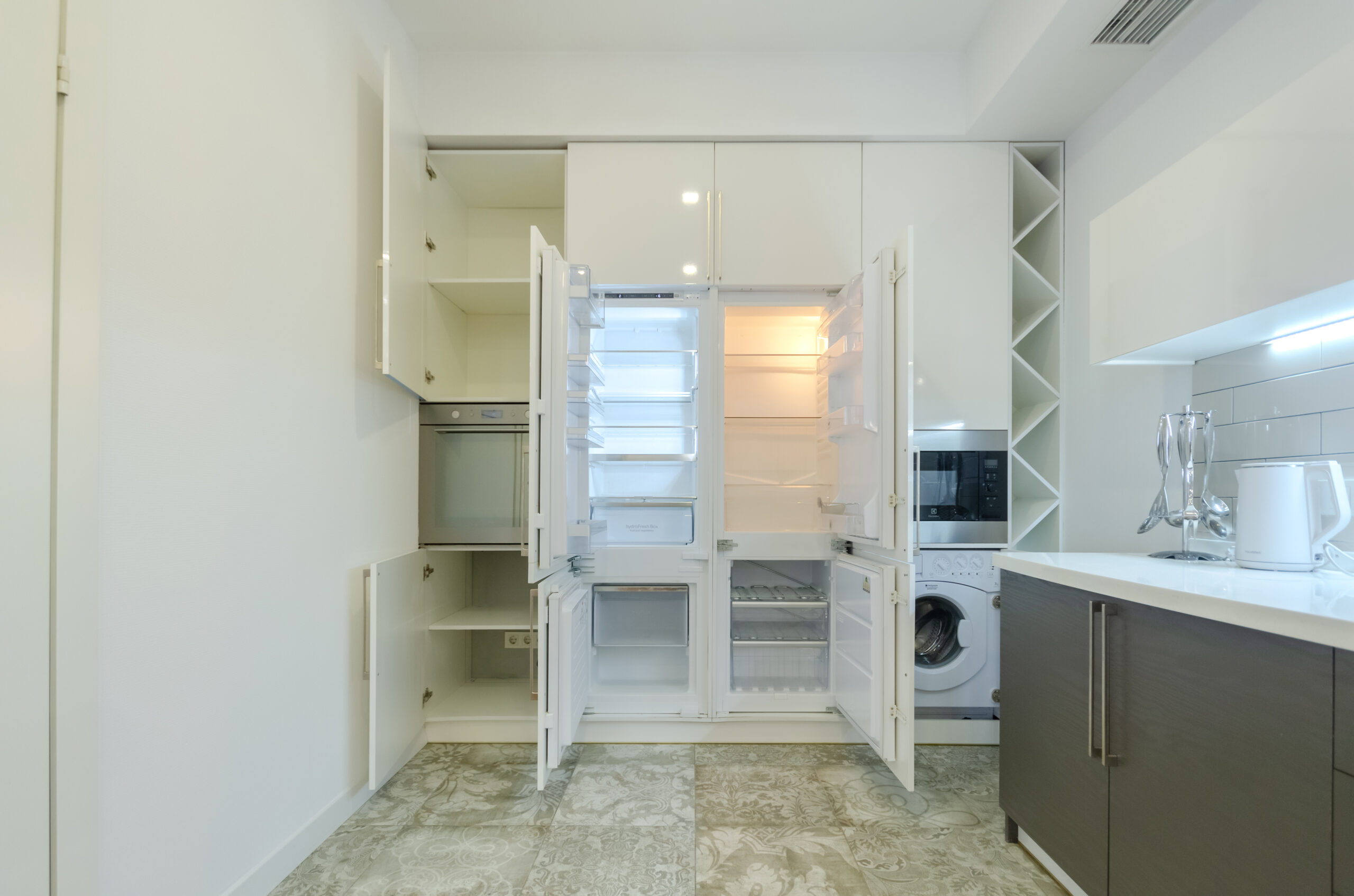 – living room (divided into zones, includes a kitchen): double sofa 160 * 200 cm, flat-screen TV, Smart-TV, kitchen (refrigerator, washing machine, microwave, kettle, electric stove, oven, pots, pans, all necessary utensils, cups, glasses, dining table.