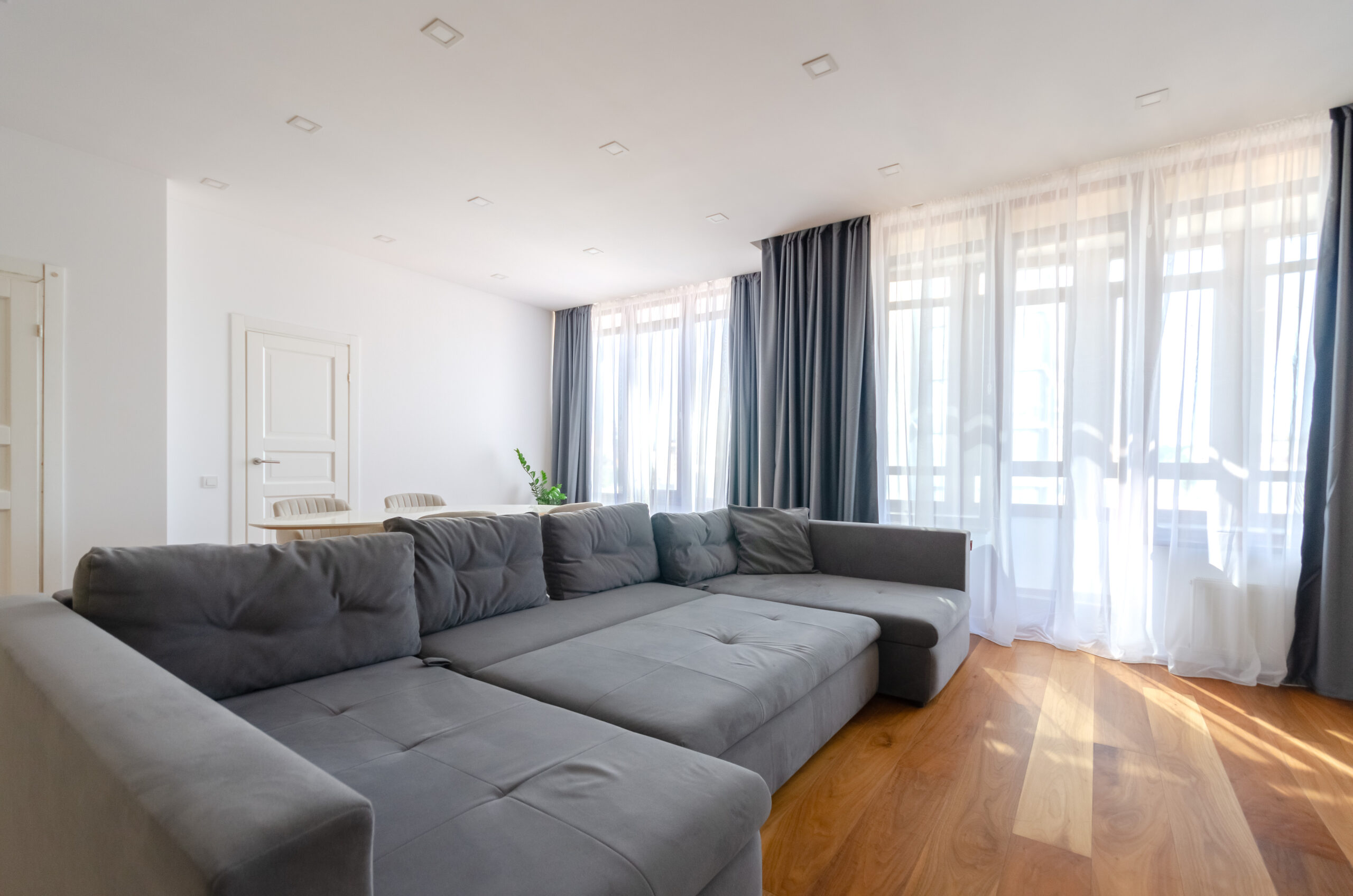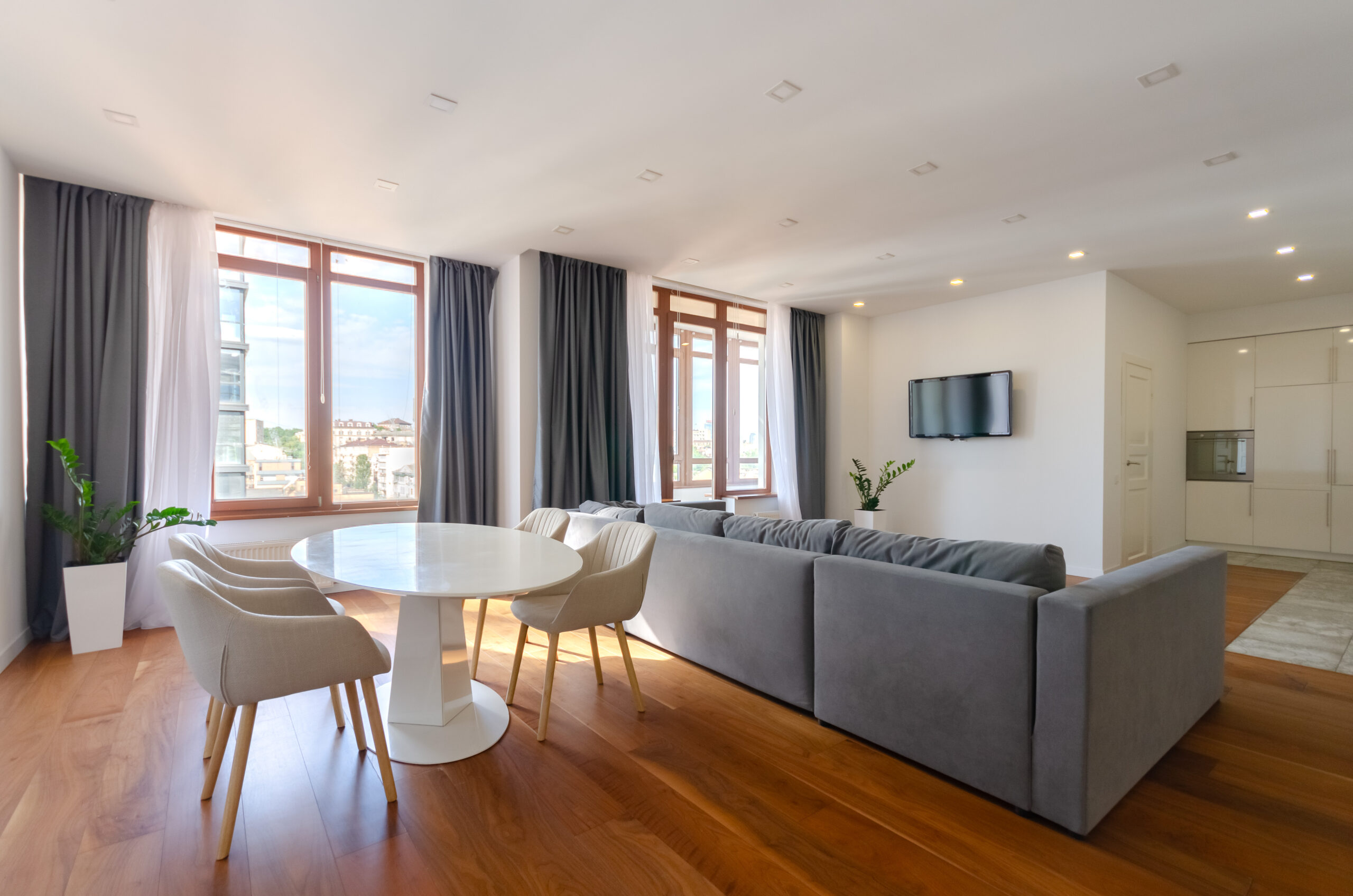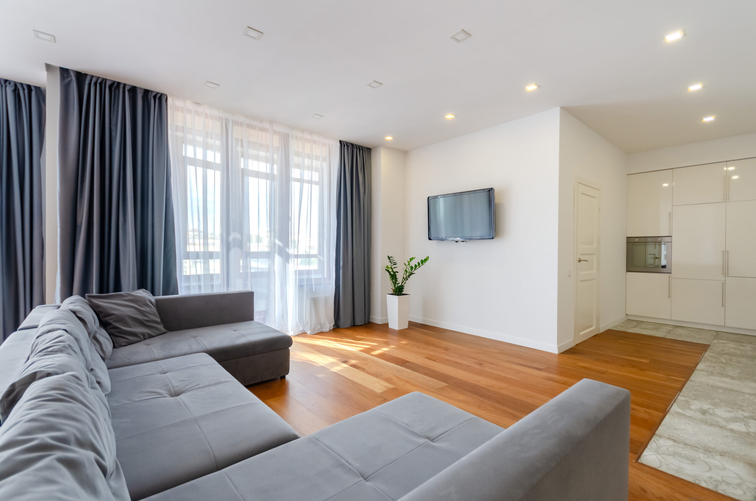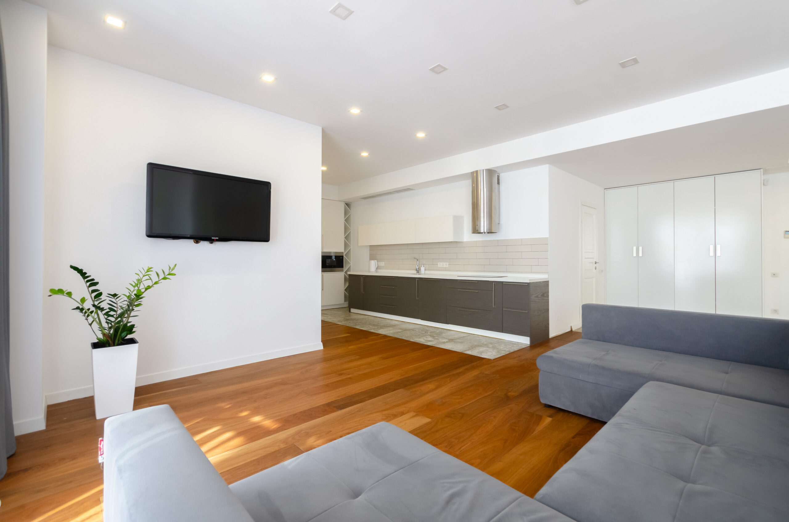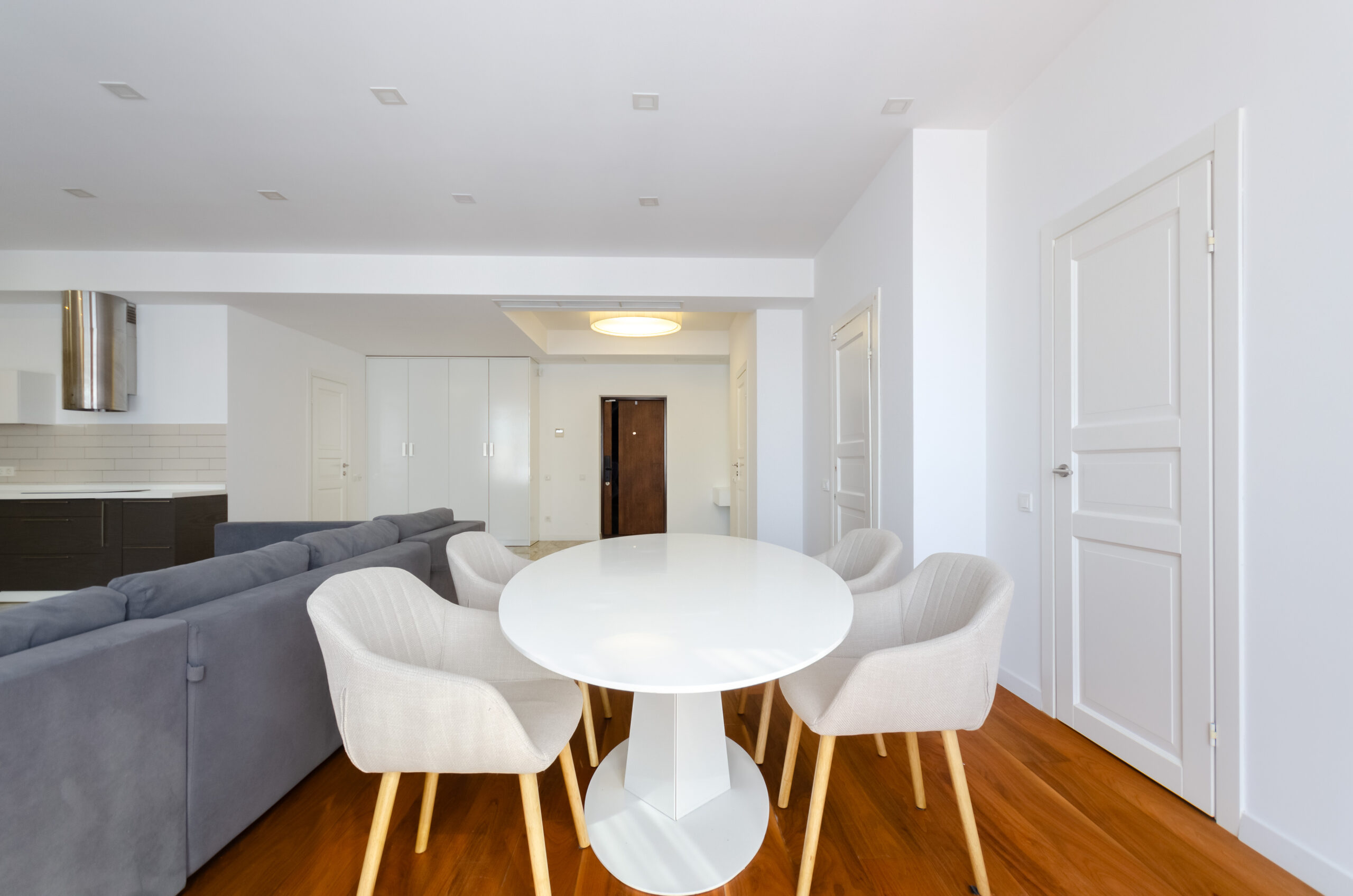 – living room (divided into zones, includes a kitchen): double sofa 160 * 200 cm, flat-screen TV, Smart-TV, kitchen (refrigerator, washing machine, microwave, kettle, electric stove, oven, pots, pans, all necessary utensils, cups, glasses, dining table.