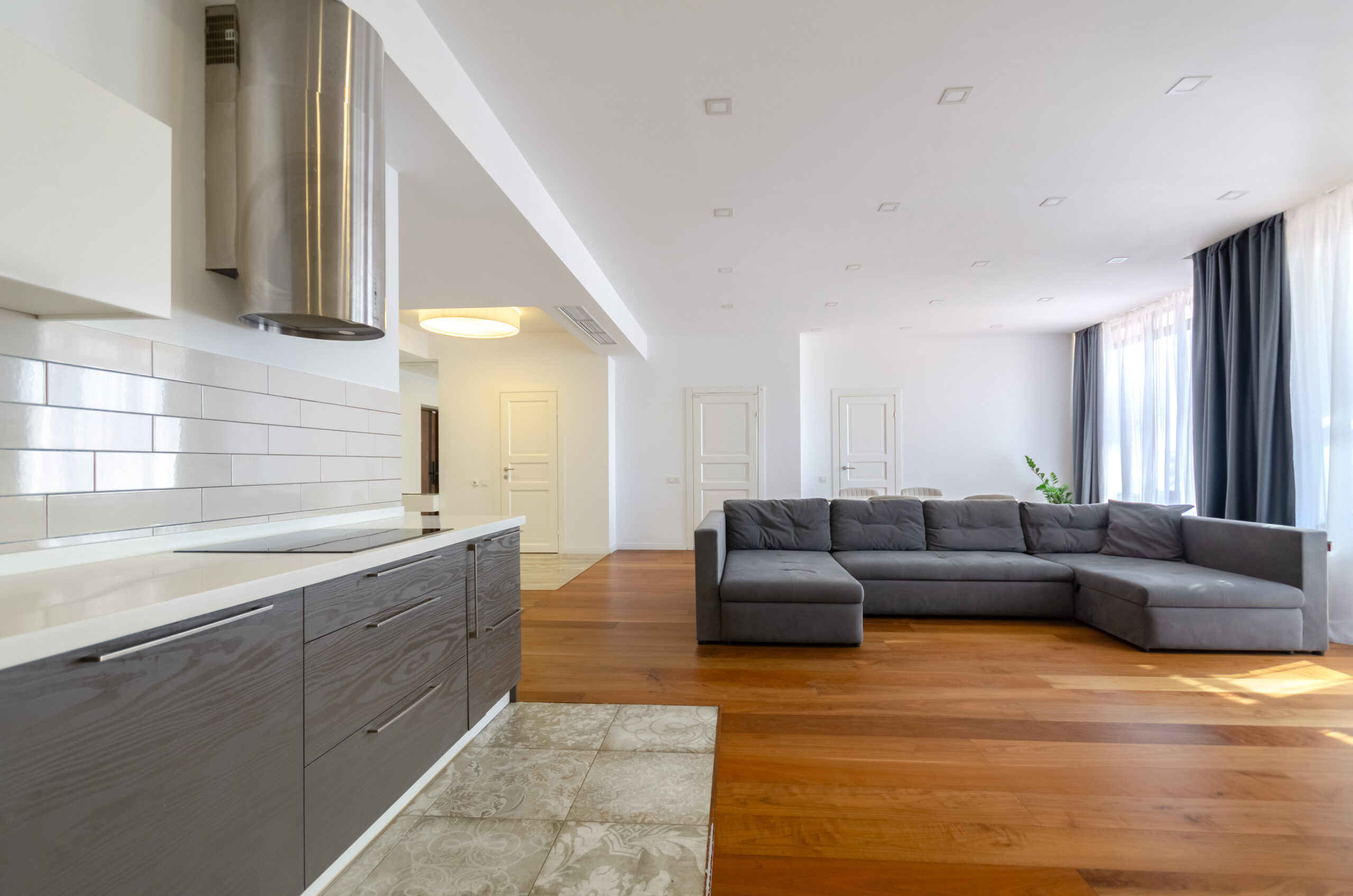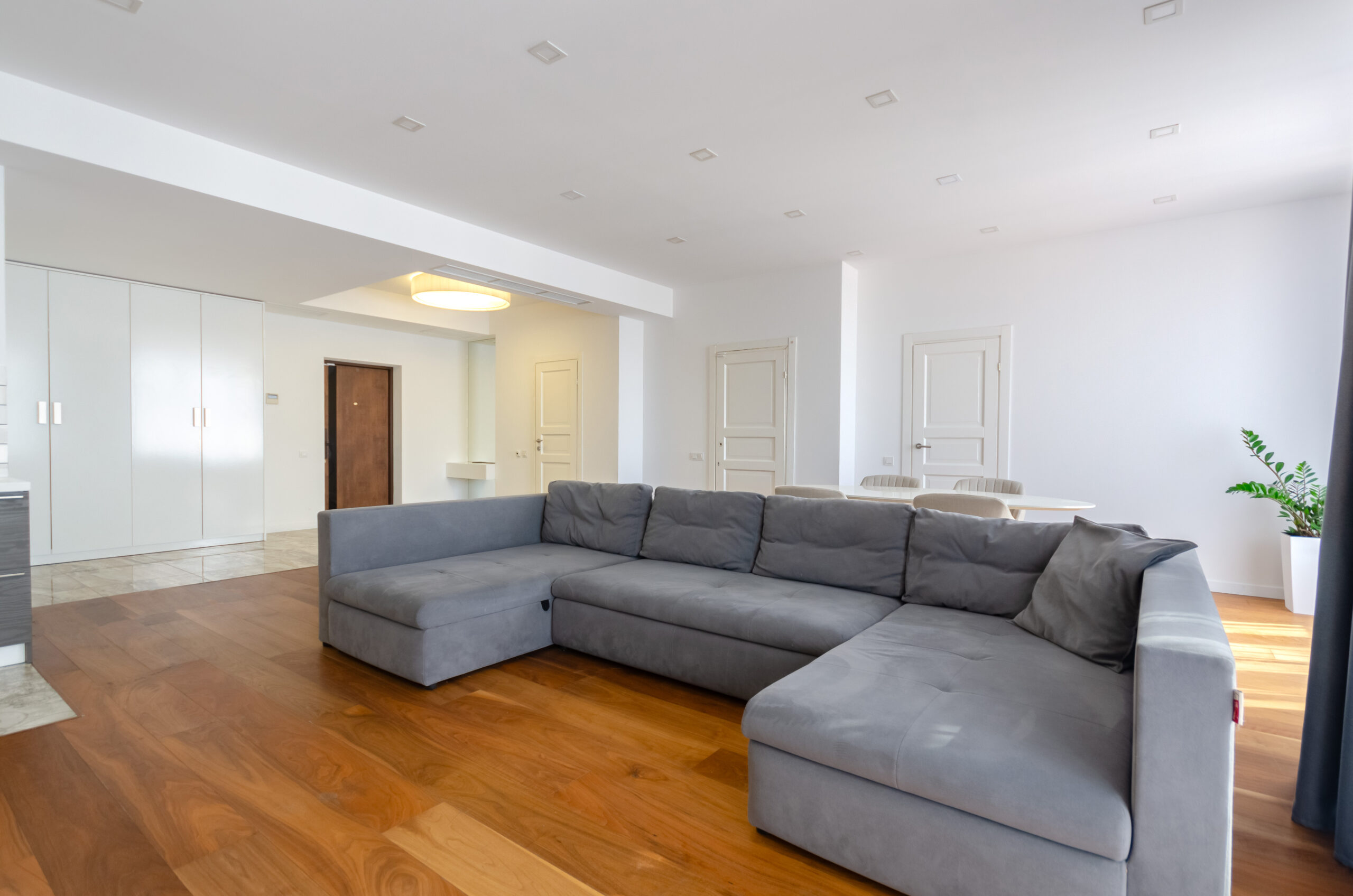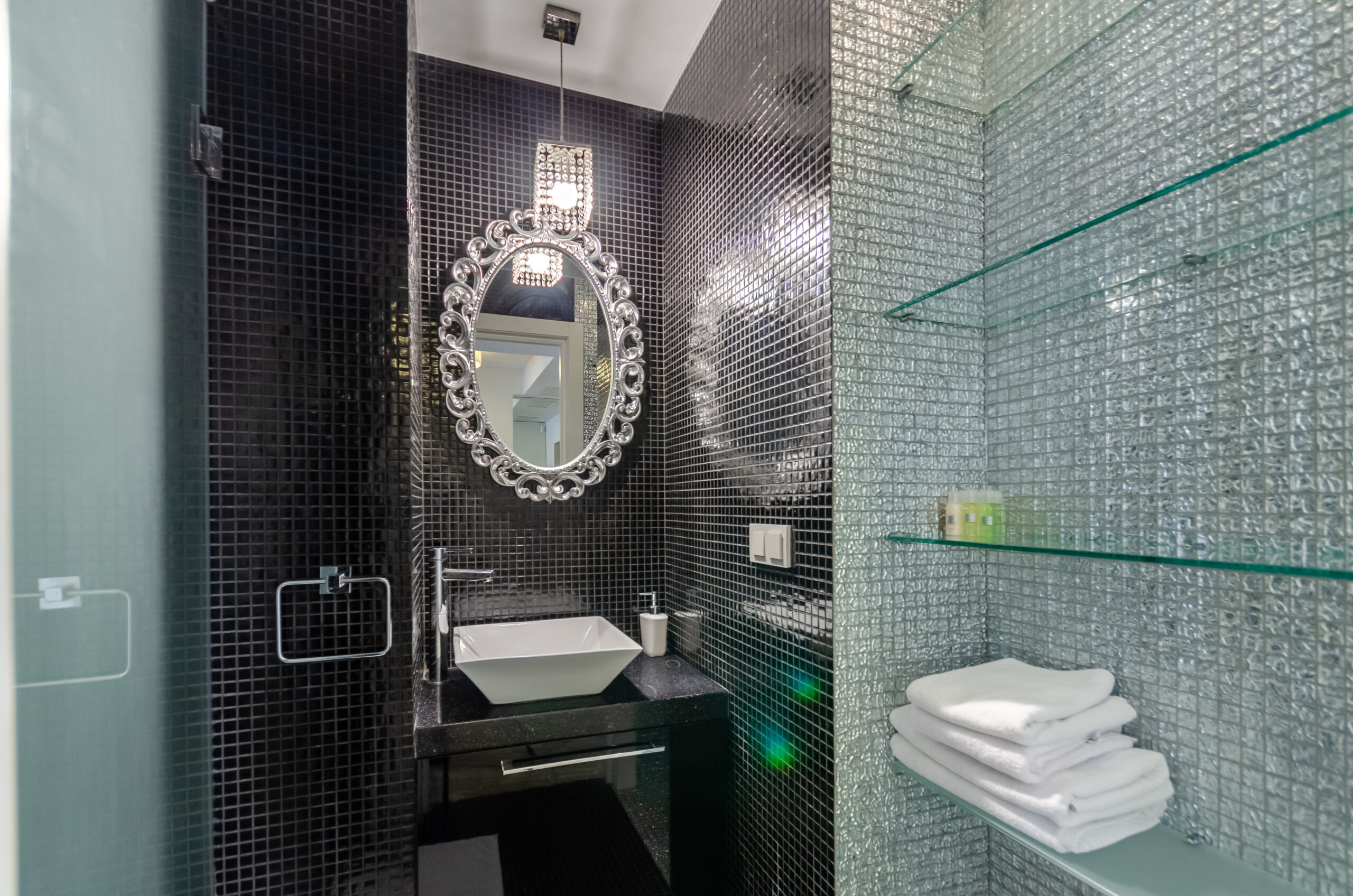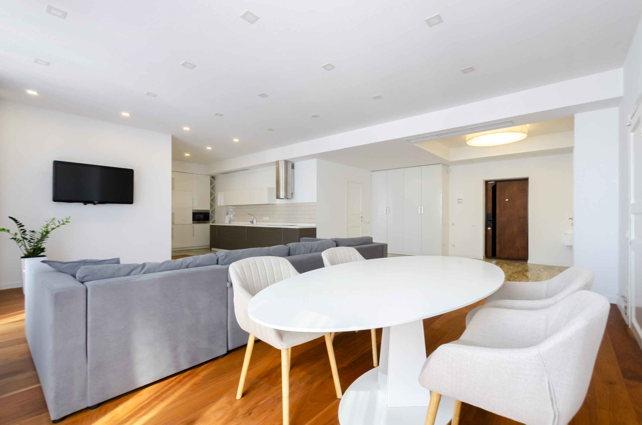 – living room (divided into zones, includes a kitchen): double sofa 160 * 200 cm, flat-screen TV, Smart-TV, kitchen (refrigerator, washing machine, microwave, kettle, electric stove, oven, pots, pans, all necessary utensils, cups, glasses, dining table.