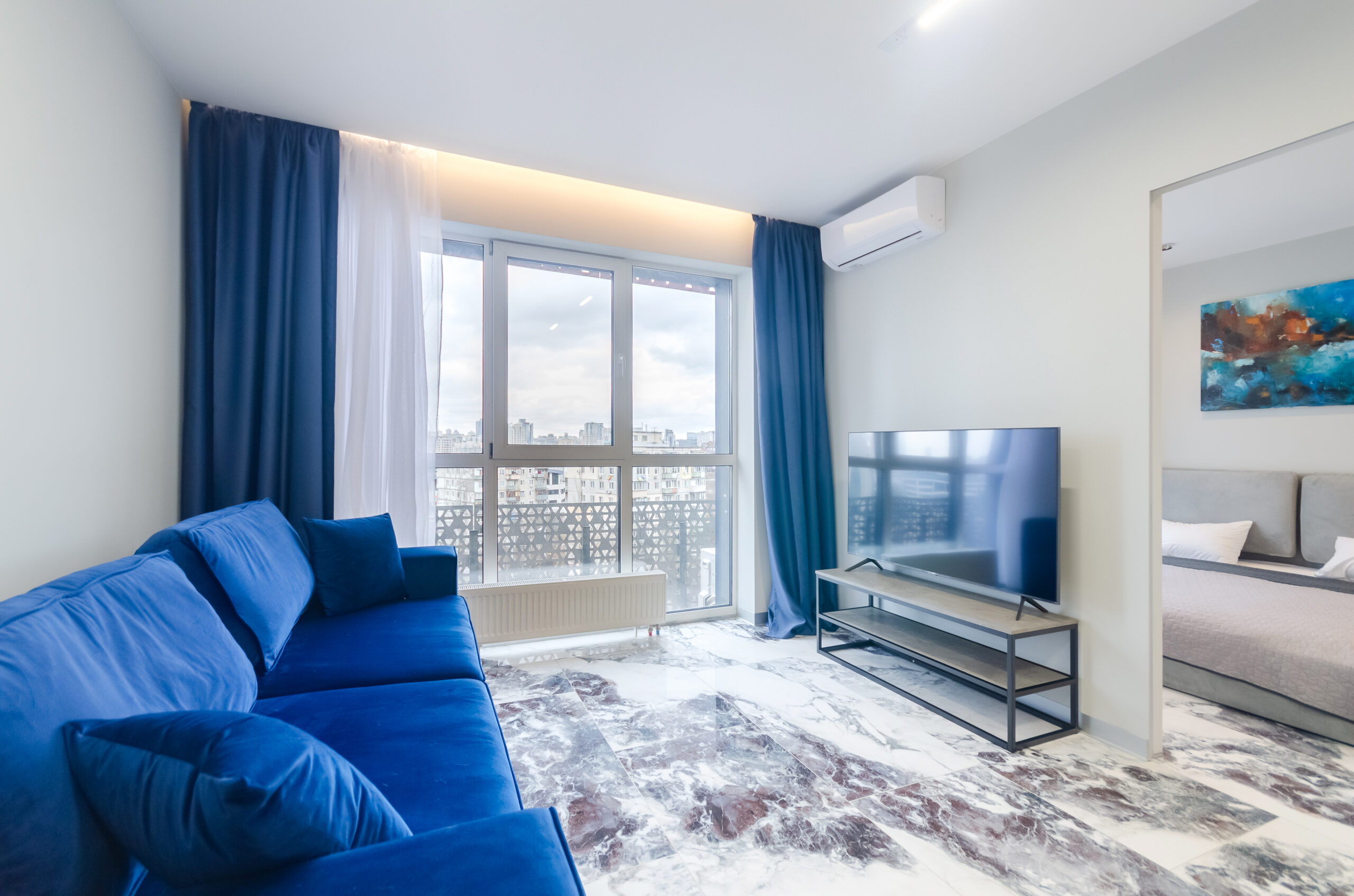 *separate bedroom (bed 1800 by 2000 mm, desk, wardrobe, air conditioner