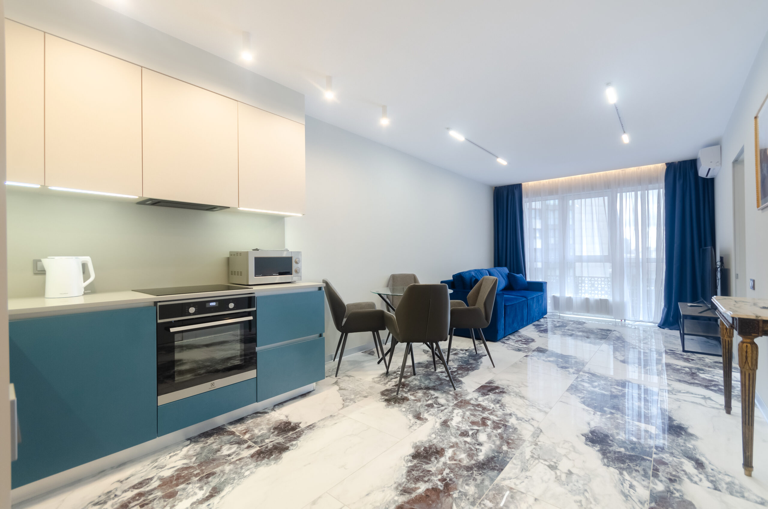 *living room (divided into zones, includes kitchen): double sofa 160*200 cm, flat screen TV, Smart-TV, air conditioner, kitchen (refrigerator, dishwasher, microwave oven, kettle, electric stove, oven, pots, pans, all necessary dishes, cups, glasses, wine glasses, dining table).