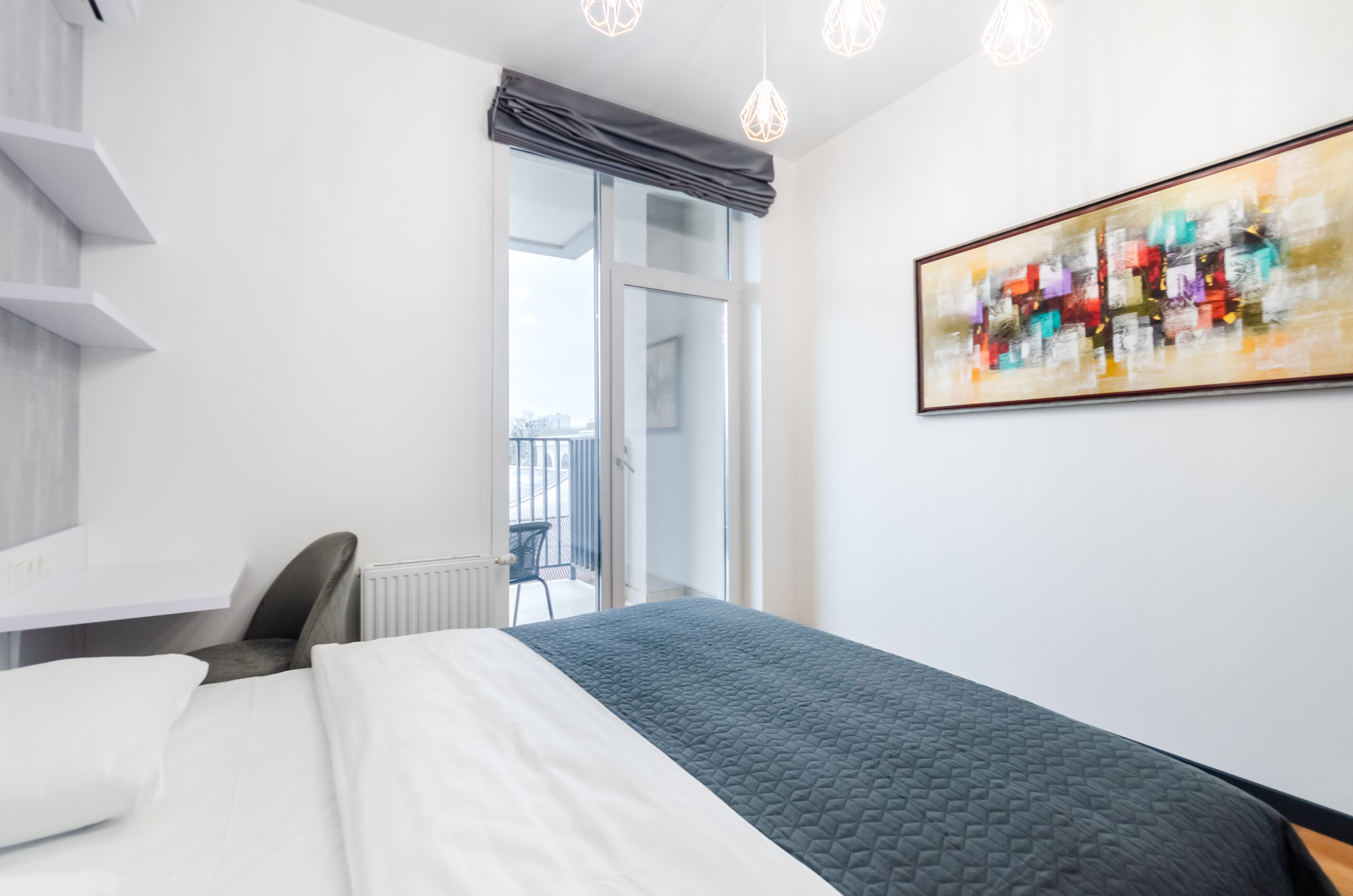The apartment is located on the 3rd floor, has an area of 50 m2, has a separate bedroom, a living room-kitchen with a panoramic view of Kyiv and a bathroom.