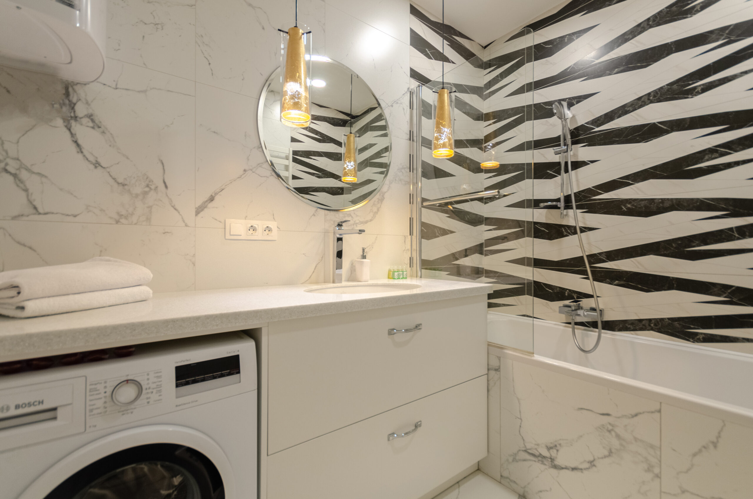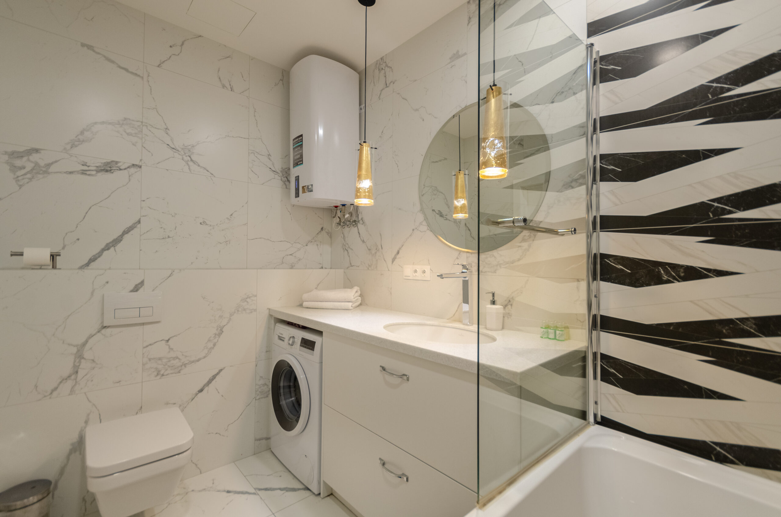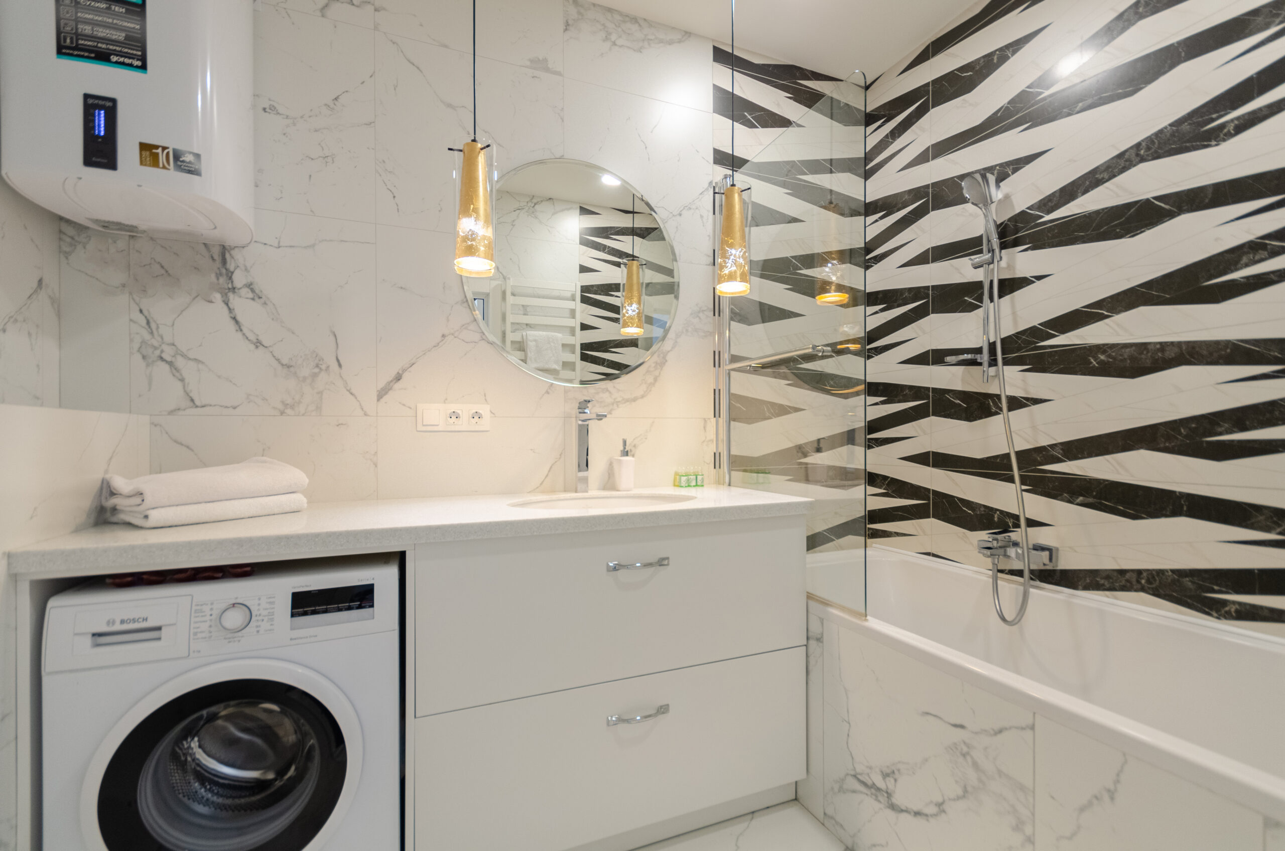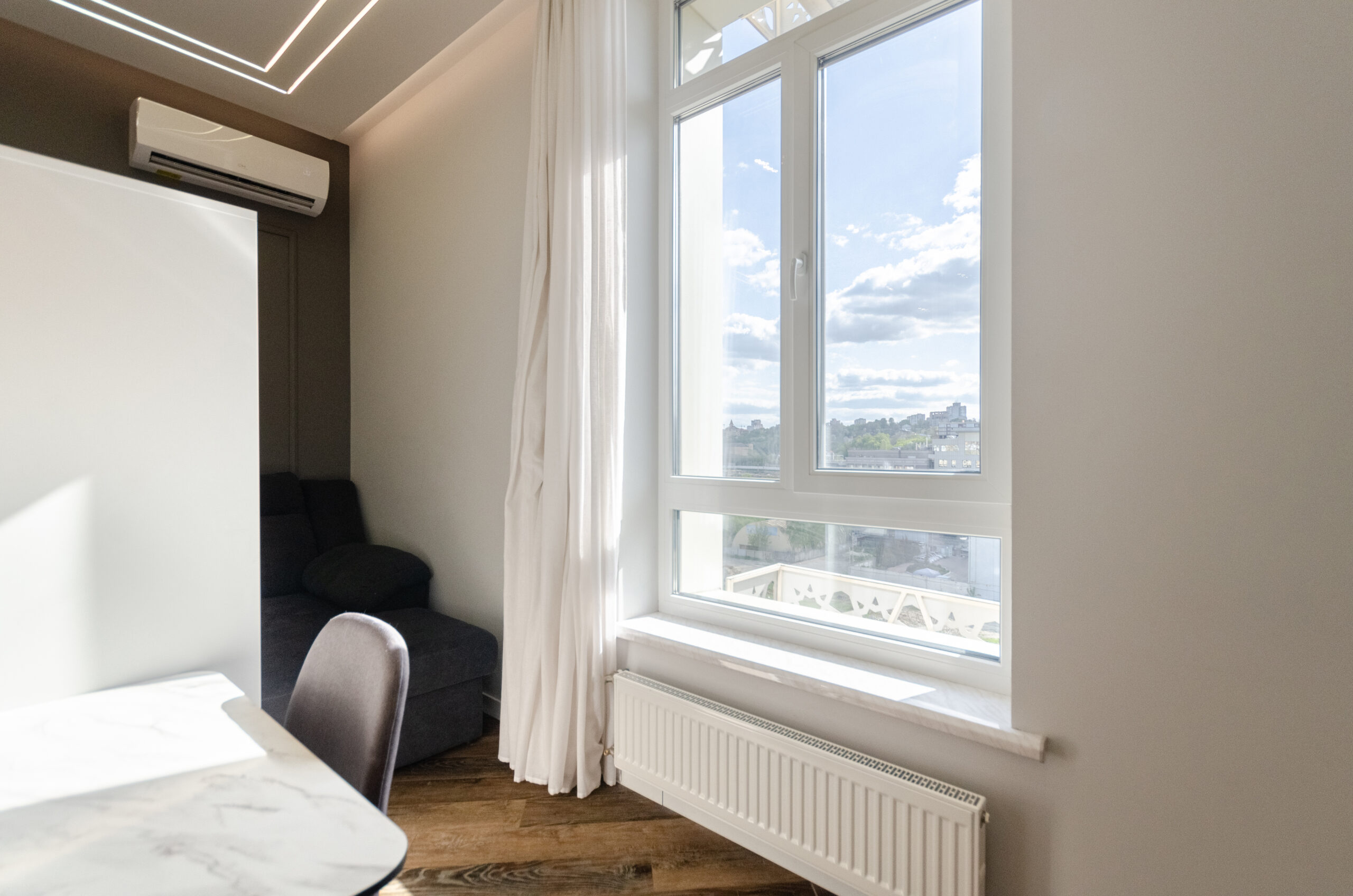 The stylish apartment is located in the city center at 38 Zhemchuzhina residential complex, 68 Zhilyanska Street. The complex has 24-hour security. One of the best houses in Kyiv. The city center, a beautiful elite area. Great view from the window. There is an underground parking lot in the building. Free parking on the street and in the yard.