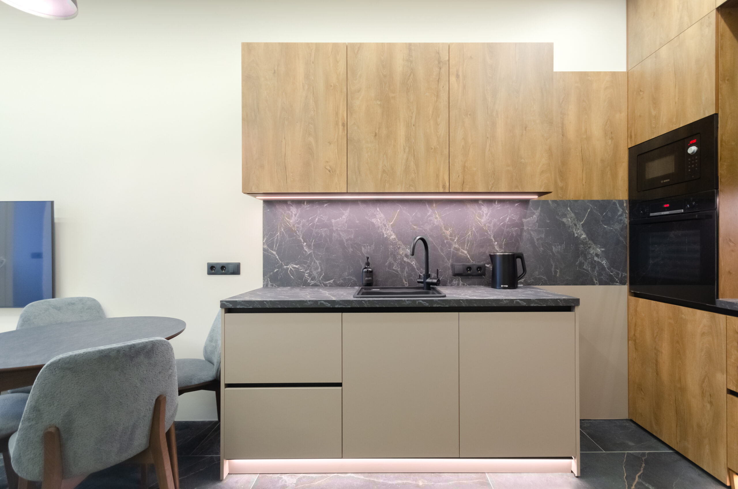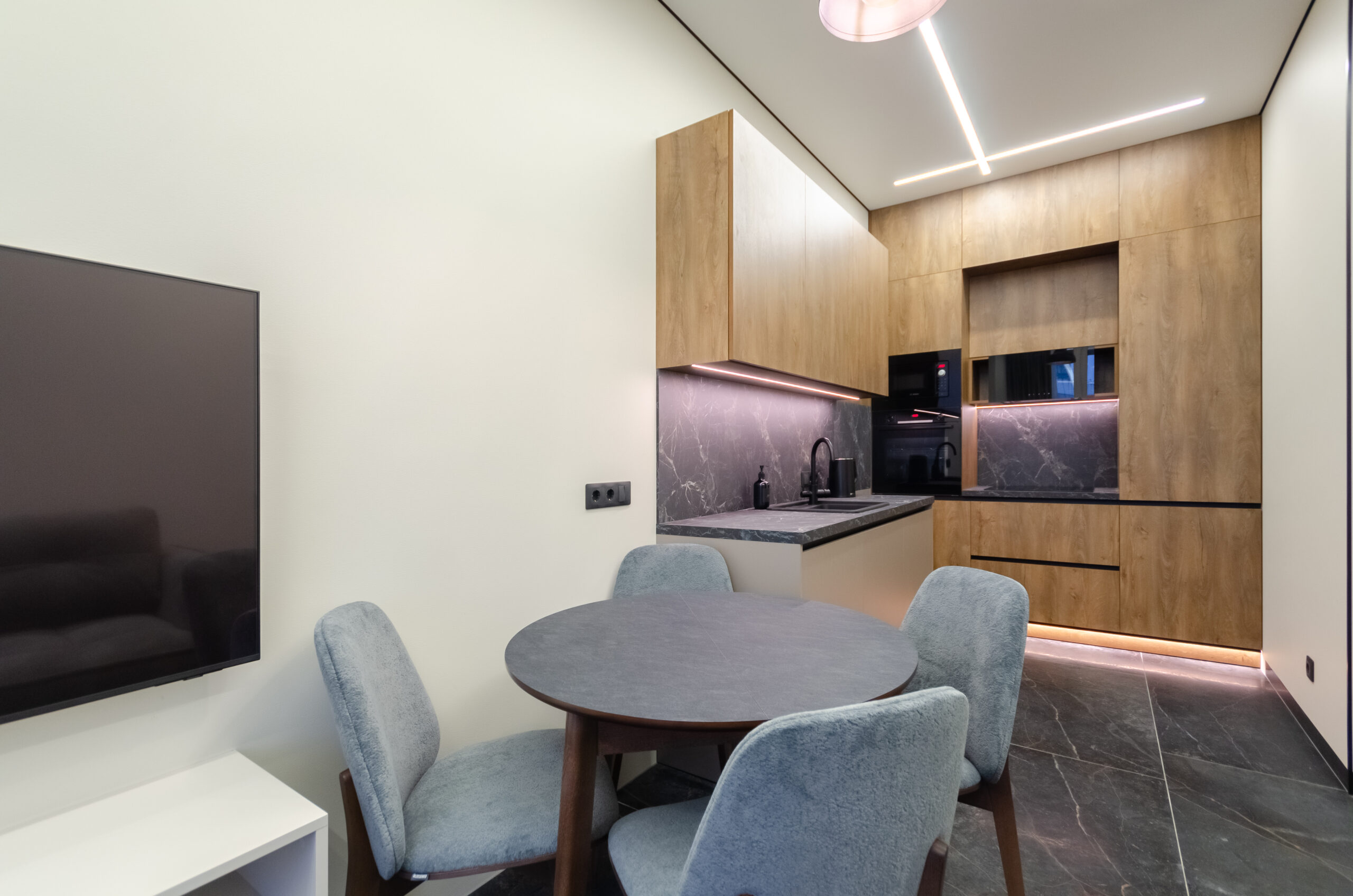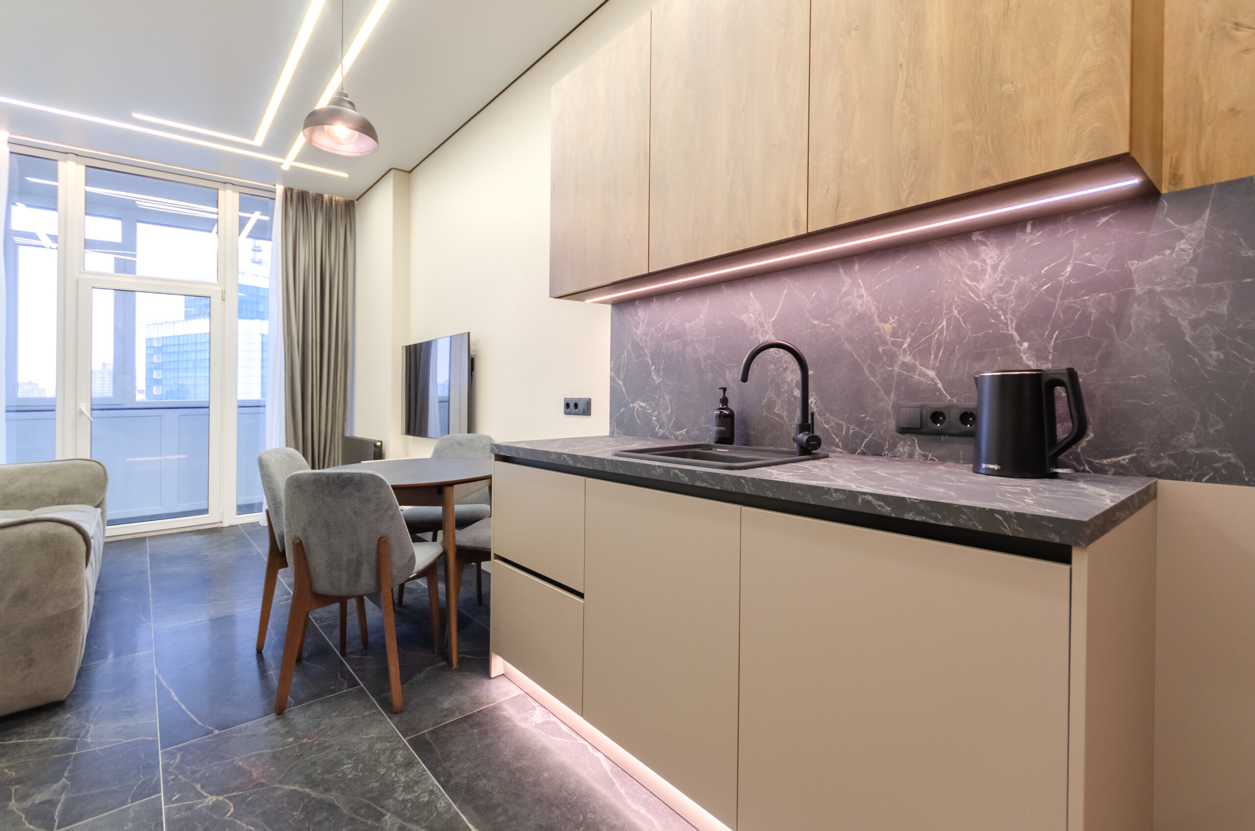 The apartment is located on the 24th floor with a panoramic view of Kyiv city. Stylish modern design. The apartment is fully equipped with everything necessary for a comfortable stay.