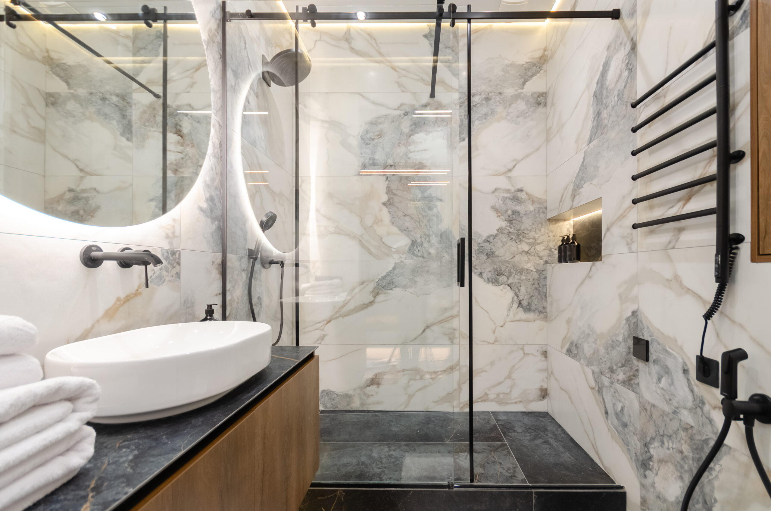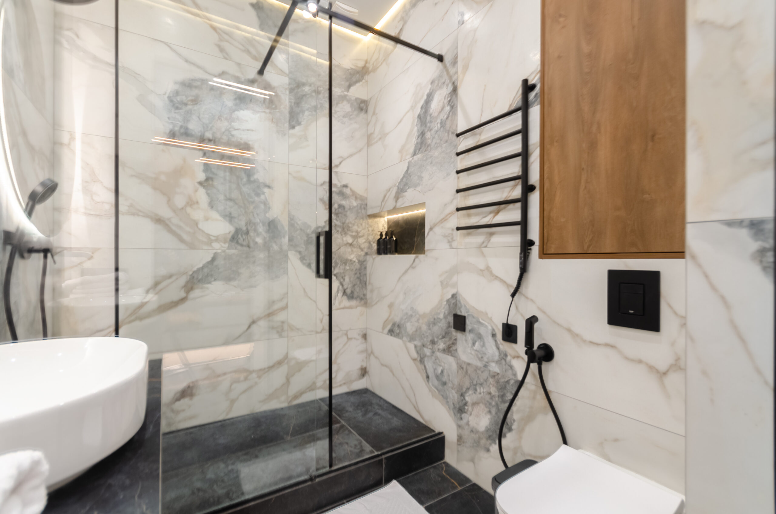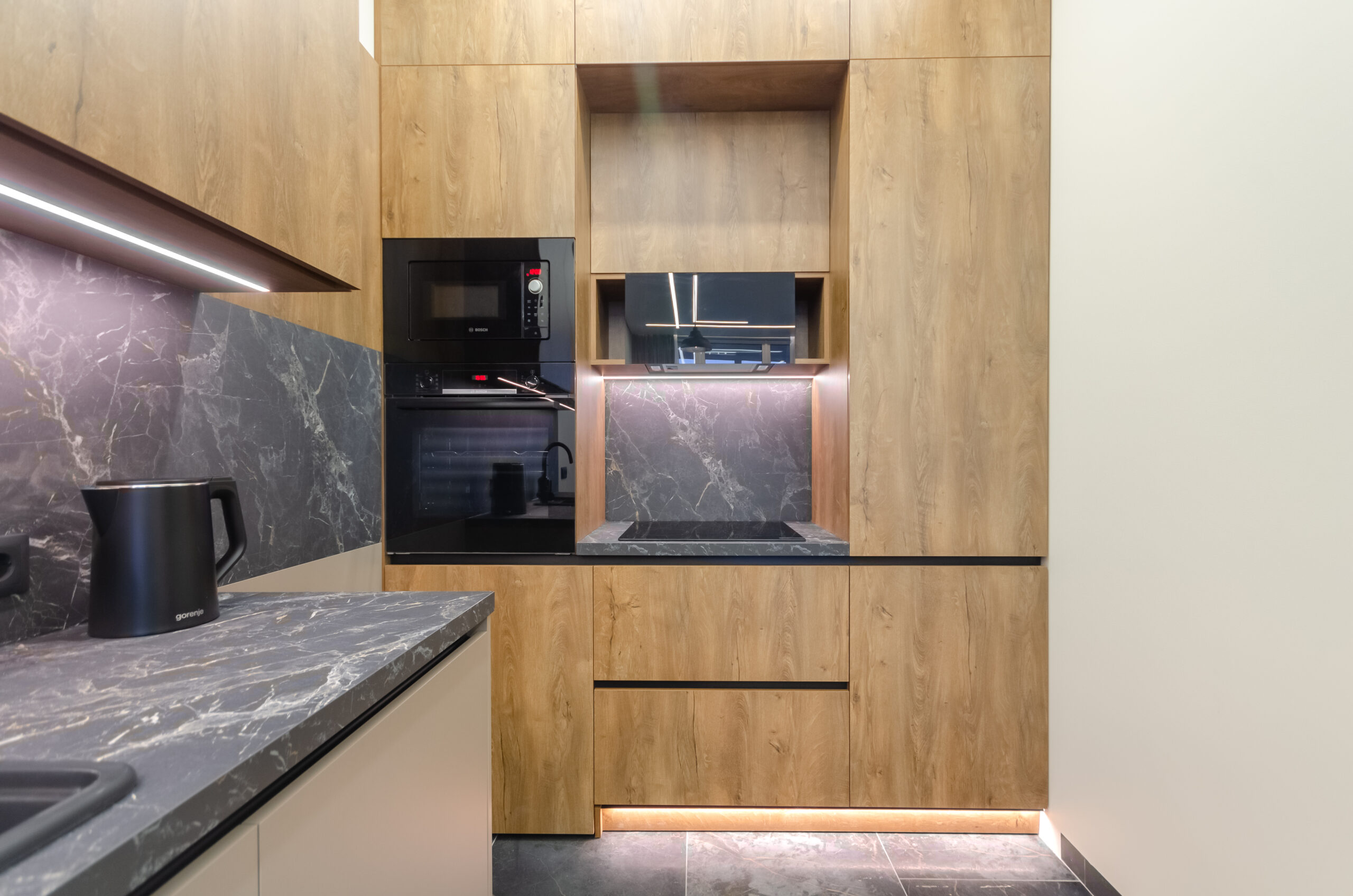 The apartment is located on the 24th floor with a panoramic view of Kyiv city. Stylish modern design. The apartment is fully equipped with everything necessary for a comfortable stay.