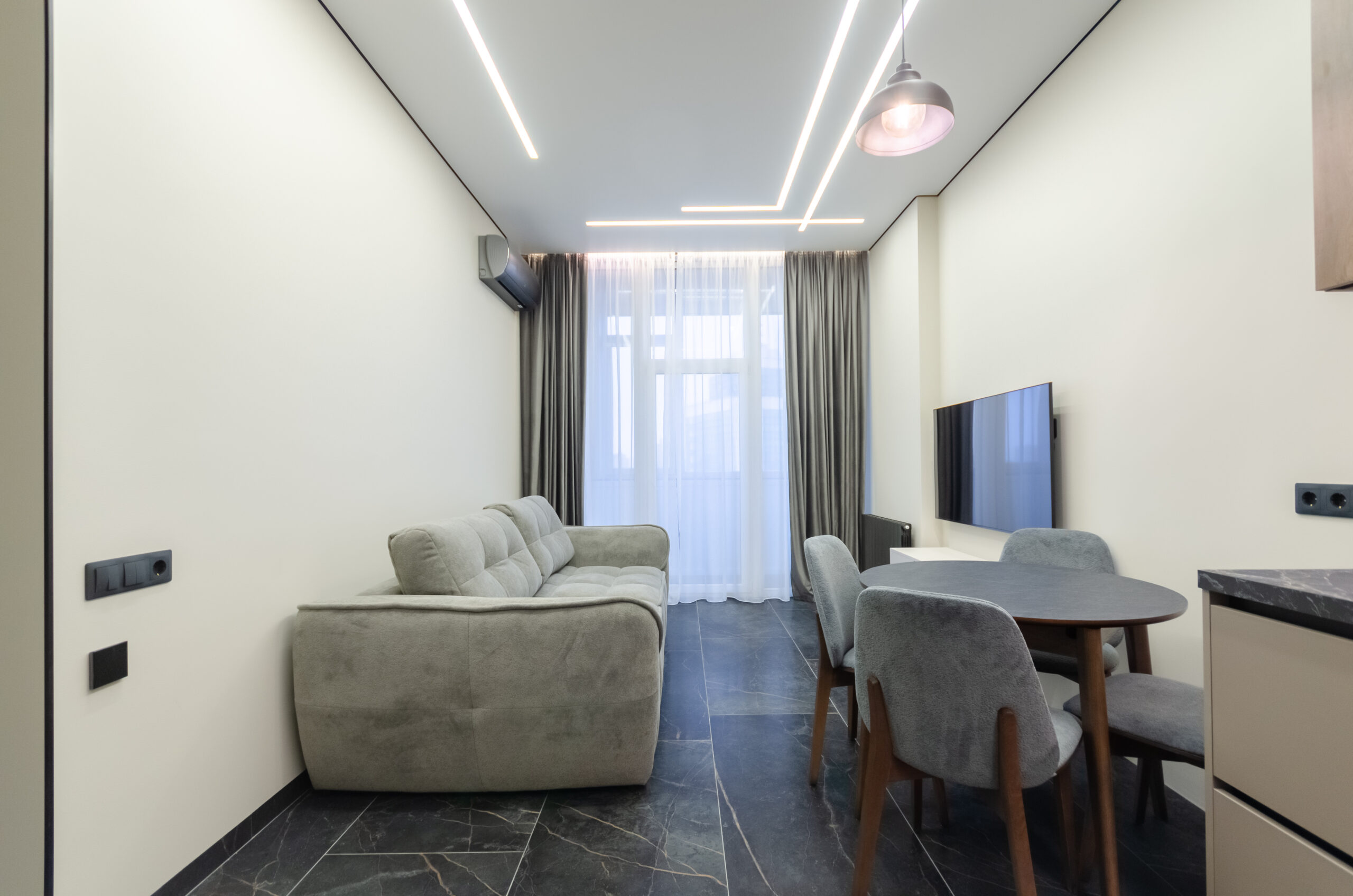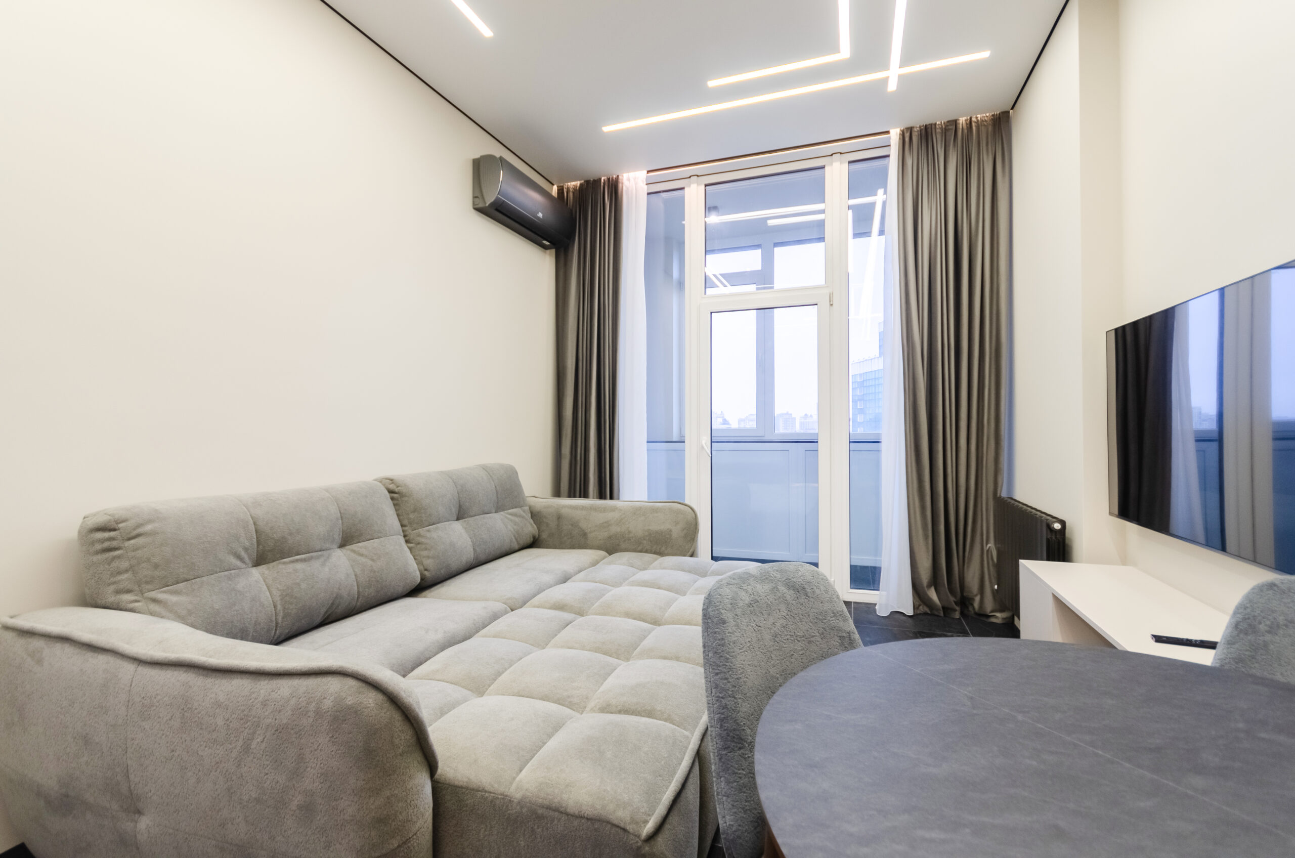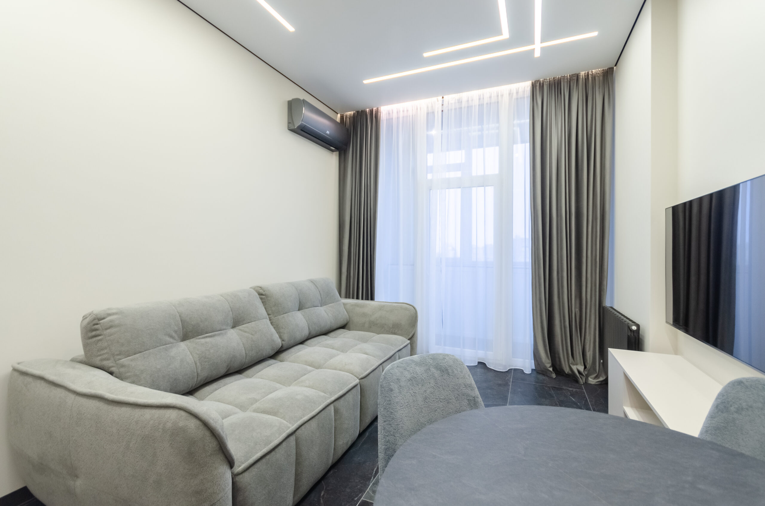 * living room area: sofa, air conditioner, smart TV,