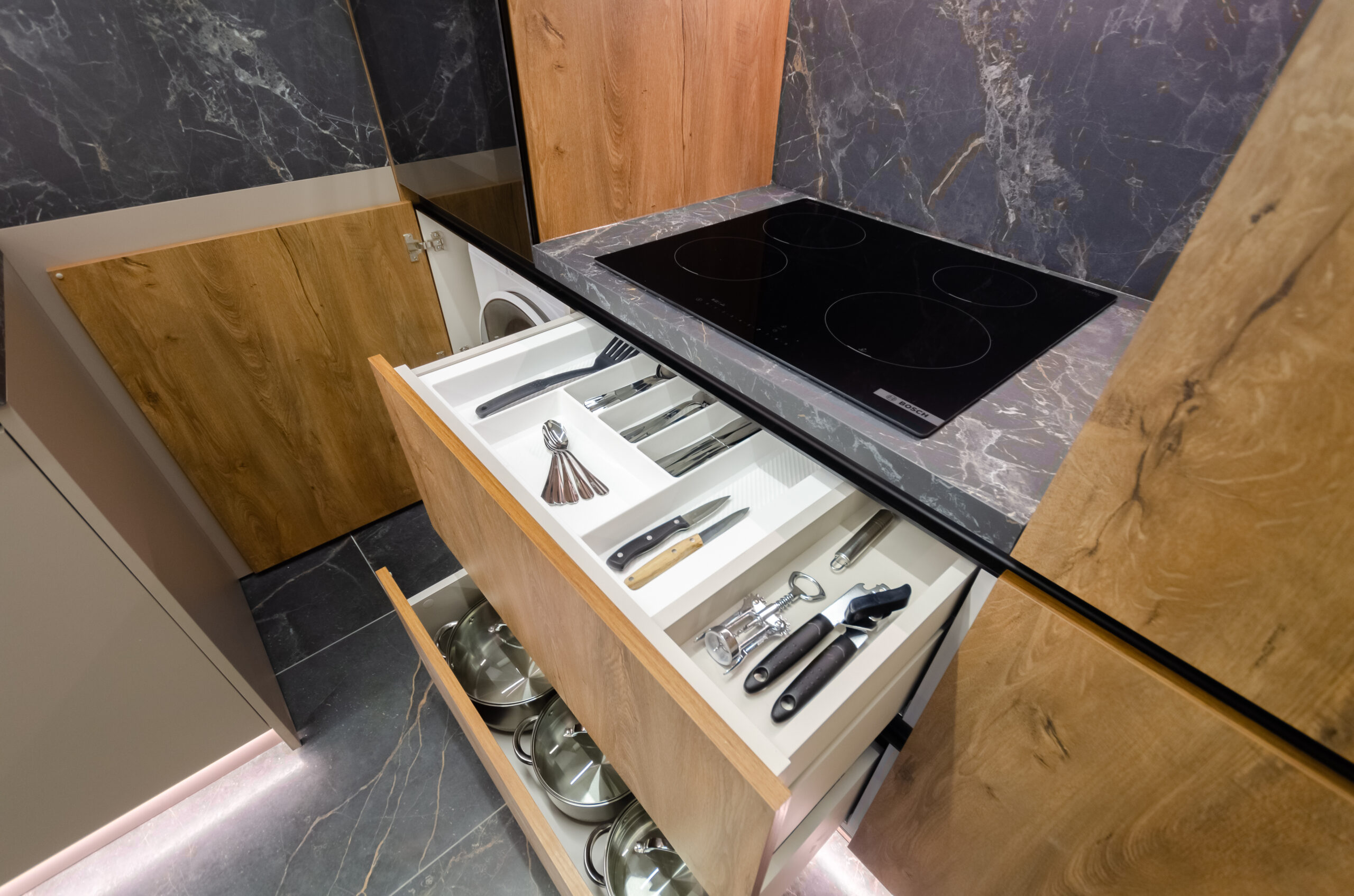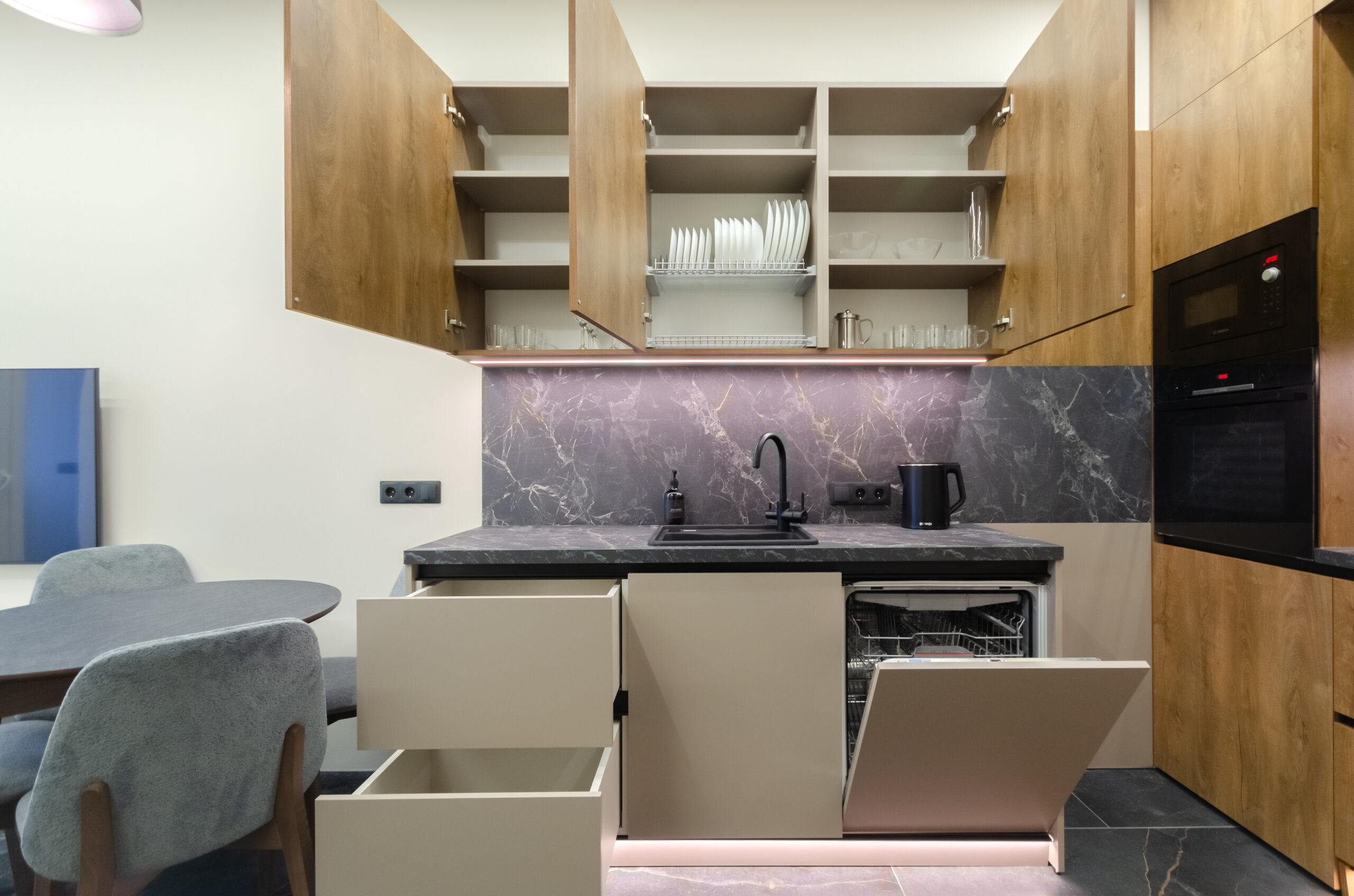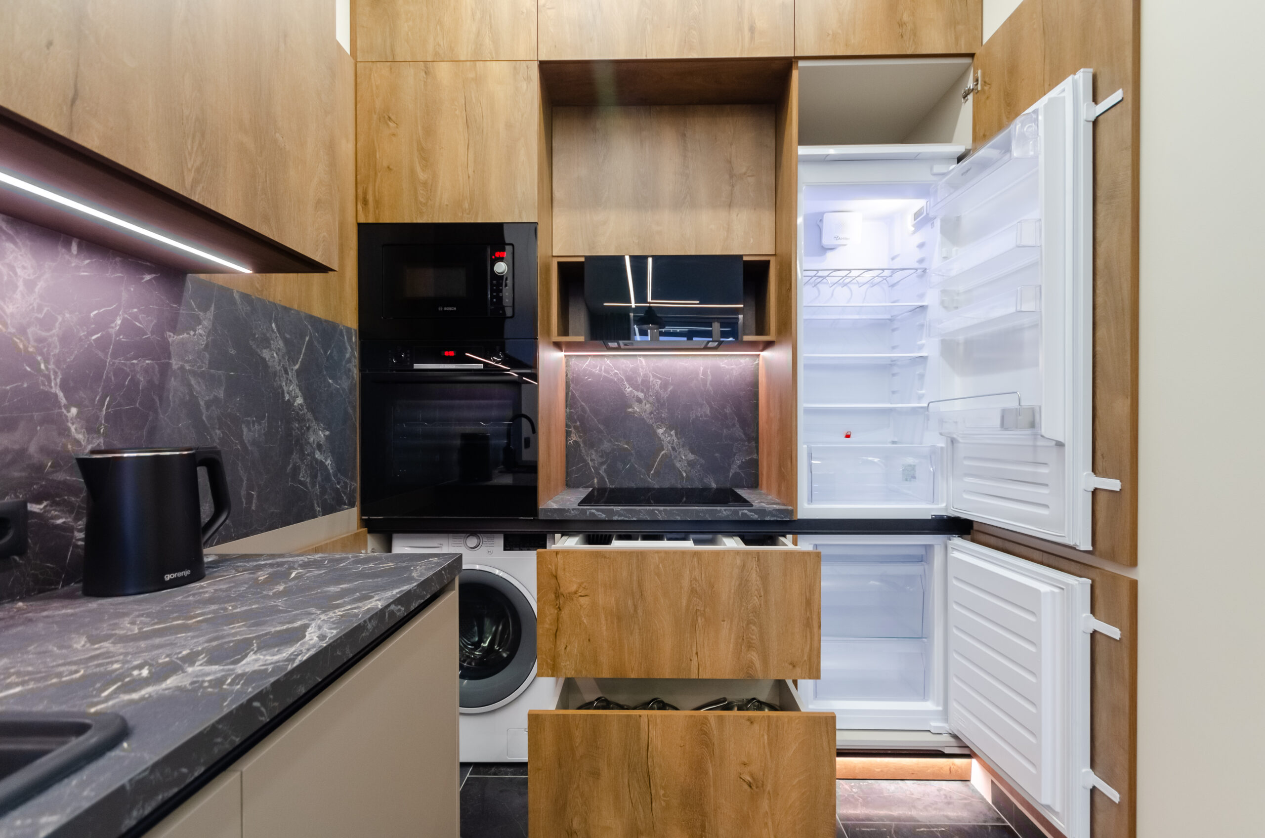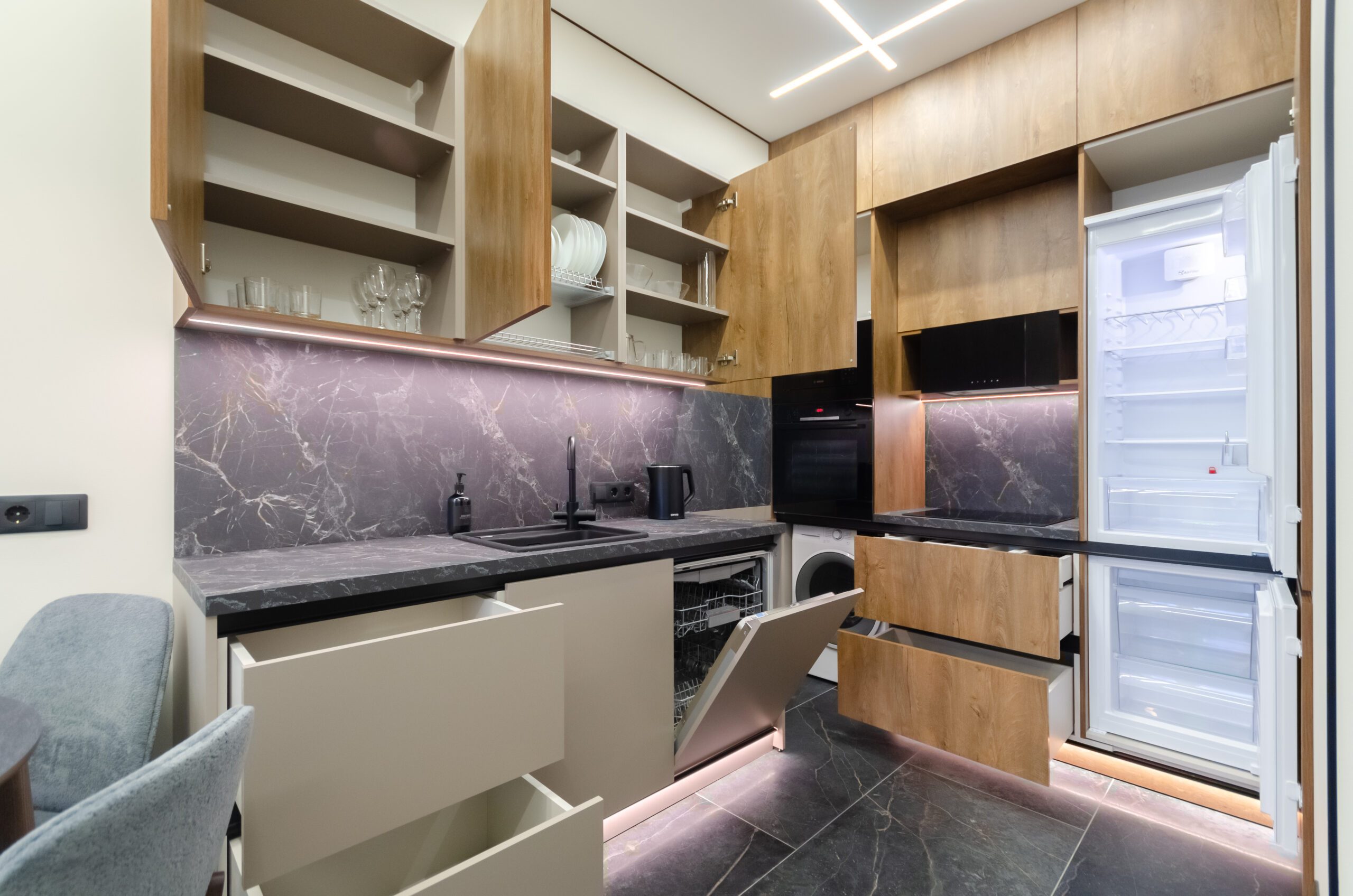 * kitchen area: (refrigerator, microwave, kettle, electric stove, water filters, all necessary utensils, cups, glasses, washing machine, tumble dryer, dishwasher, dining table with four comfortable chairs)