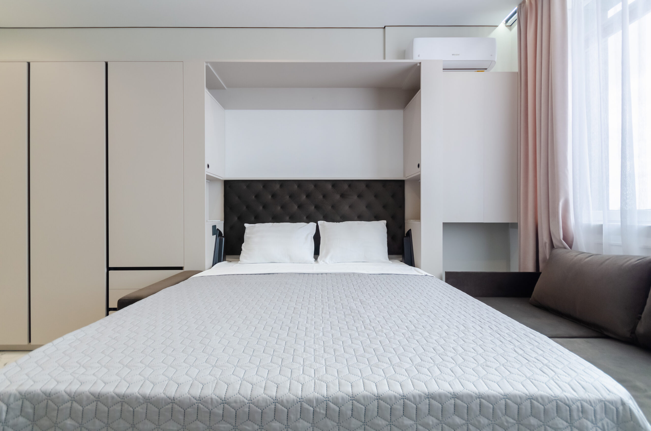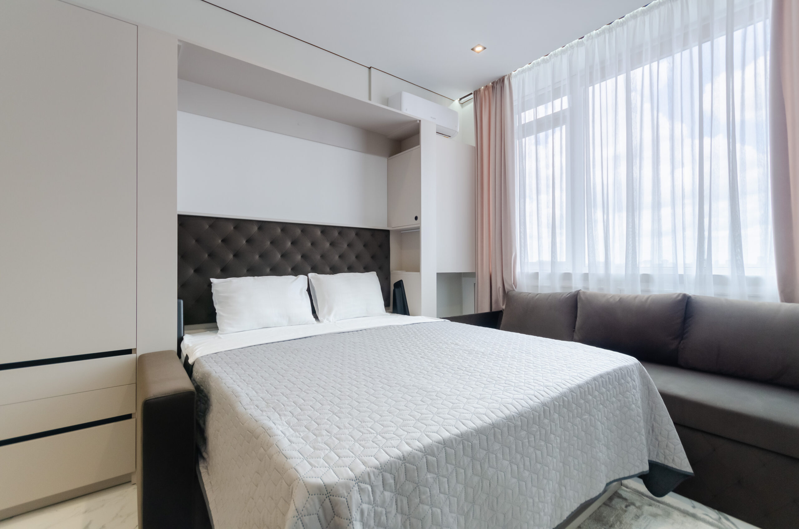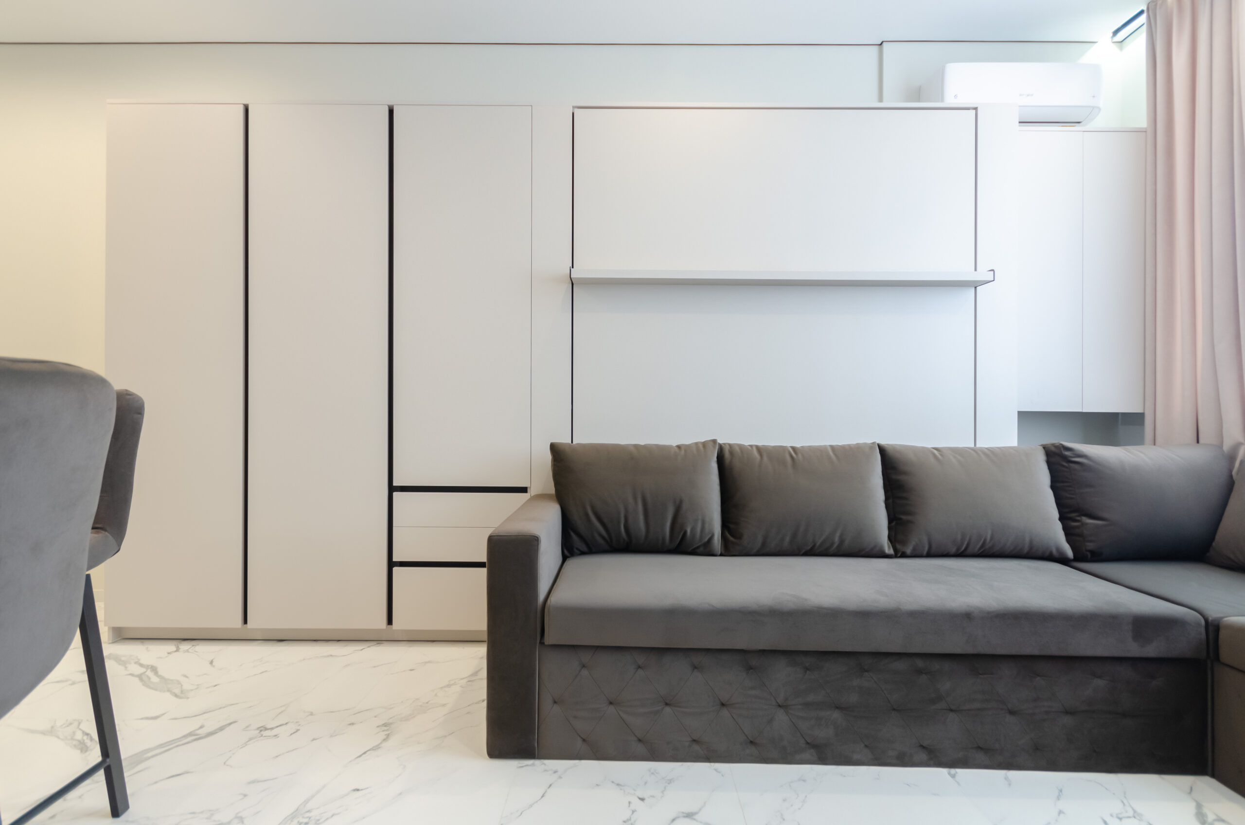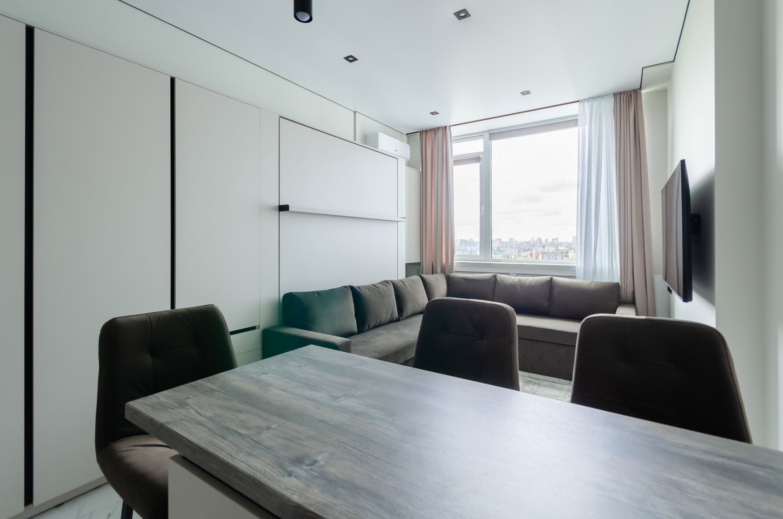*living room area: sofa, which transforms into a bed 1600 x 2000 mm, also to the left of the bed at a distance of 12 cm there is a non-folding part of this sofa measuring 660 mm by 2100 mm, air conditioner, smart TV, wardrobe;