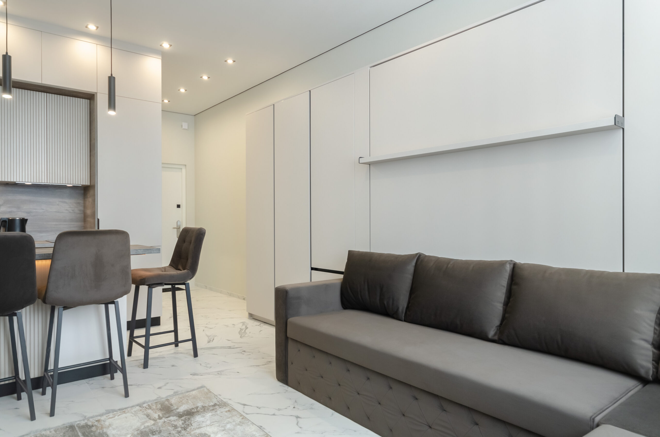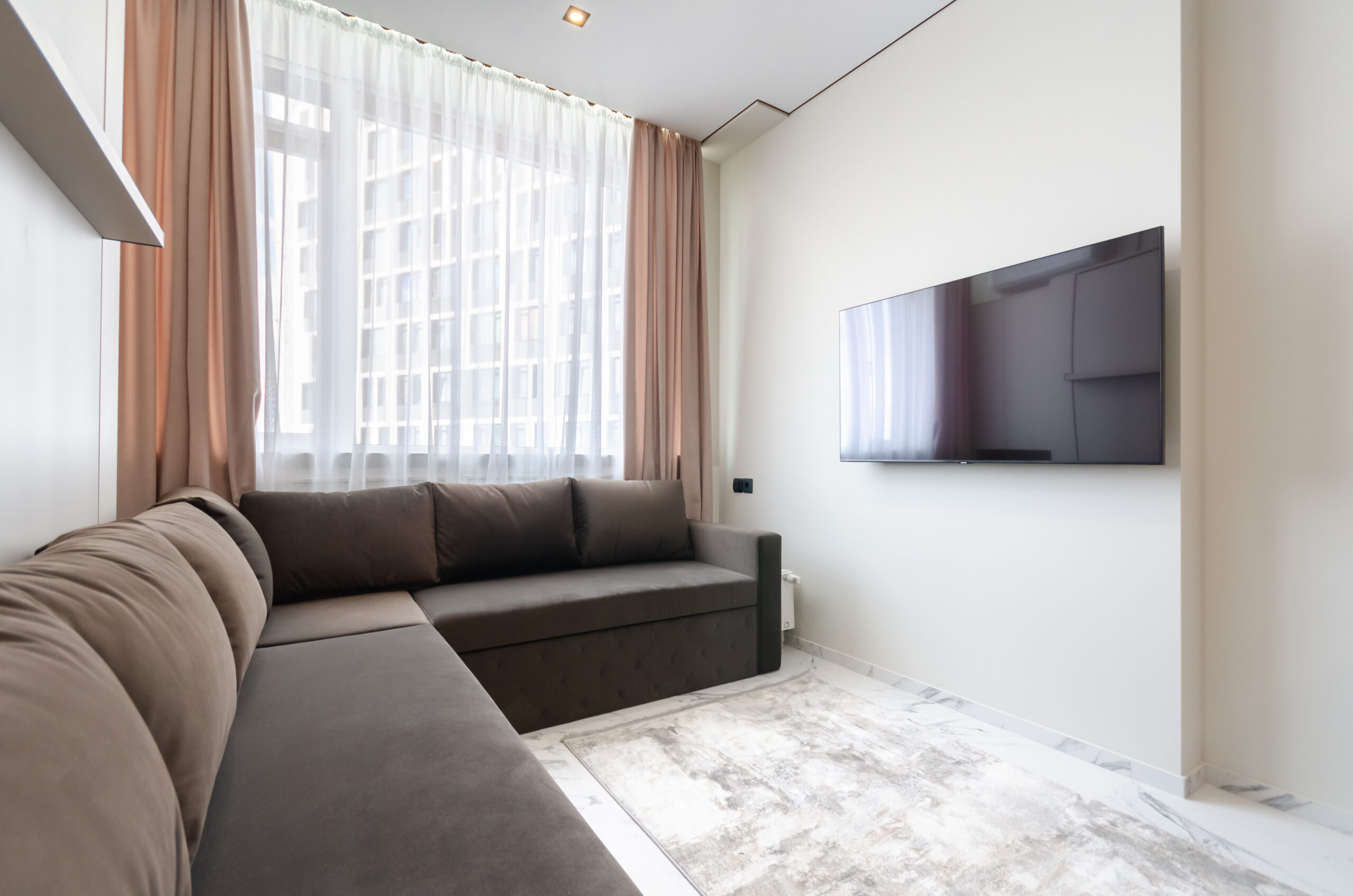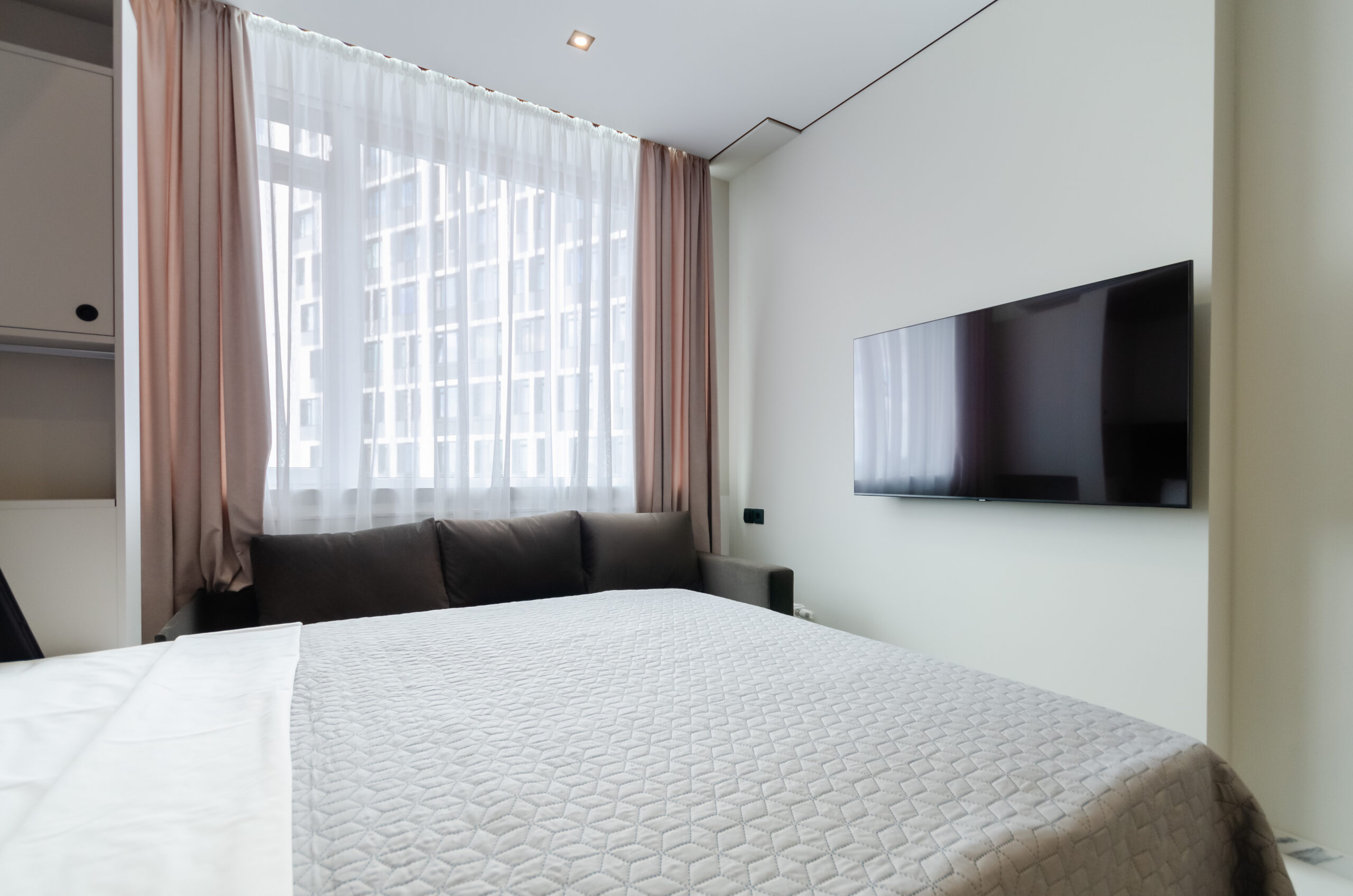 *living room area: sofa, which transforms into a bed 1600 x 2000 mm, also to the left of the bed at a distance of 12 cm there is a non-folding part of this sofa measuring 660 mm by 2100 mm, air conditioner, smart TV, wardrobe;