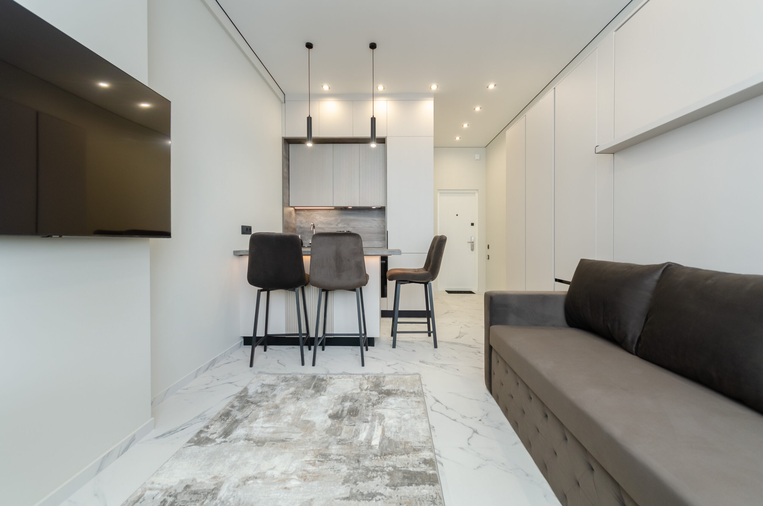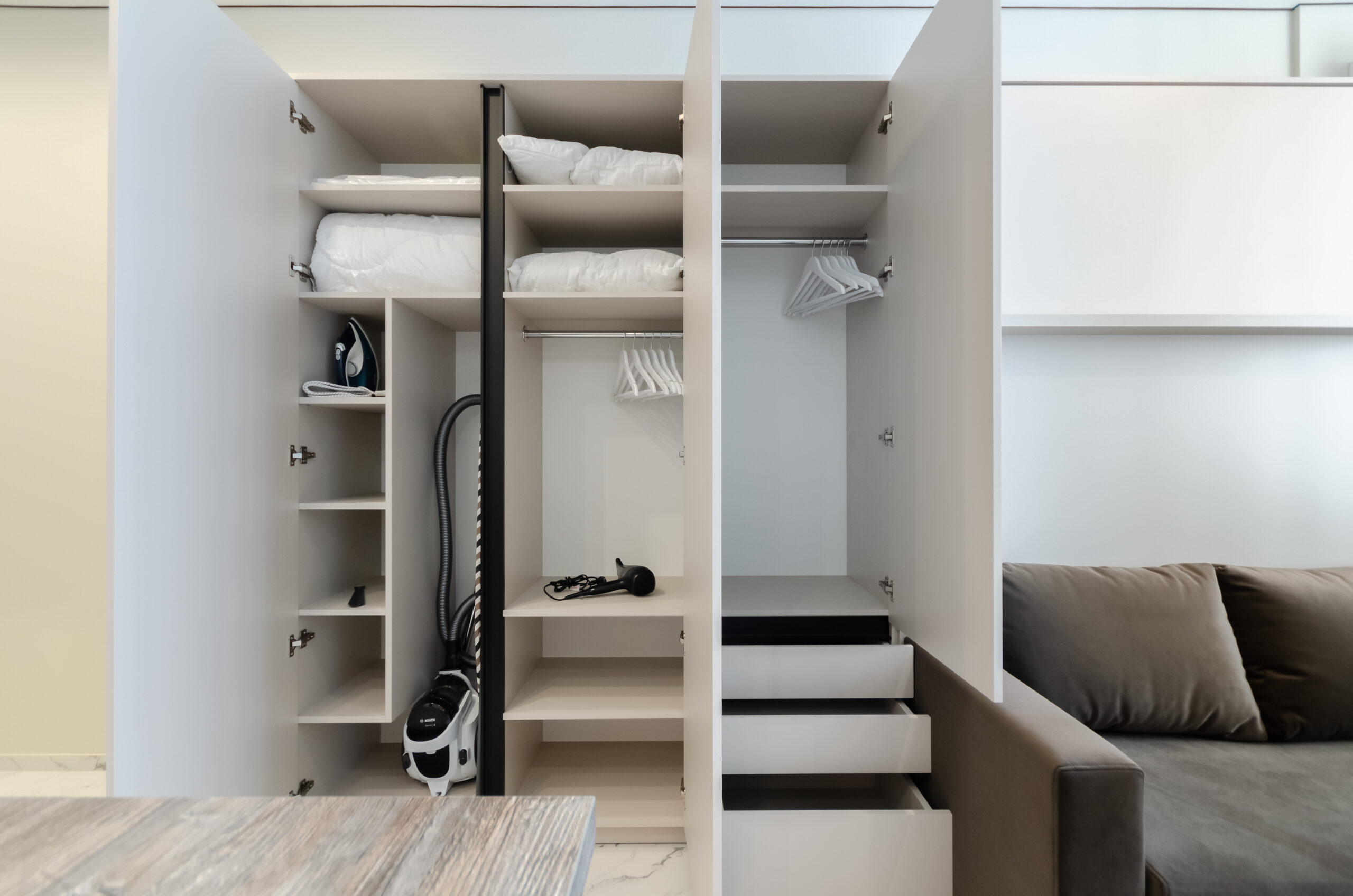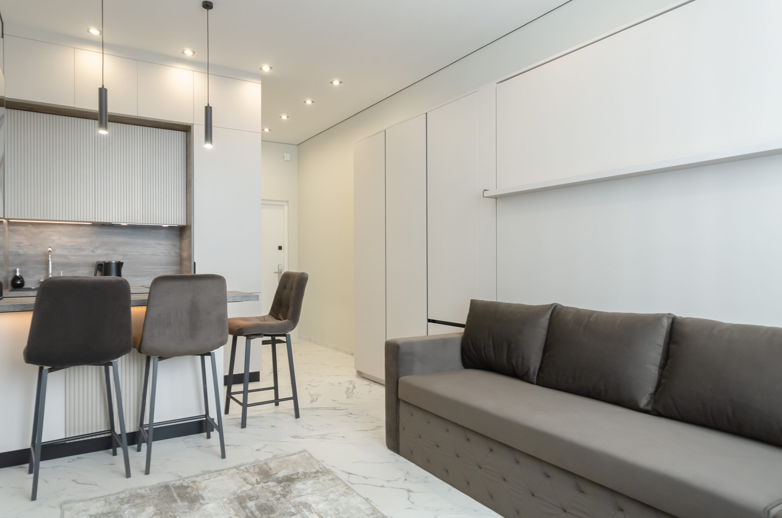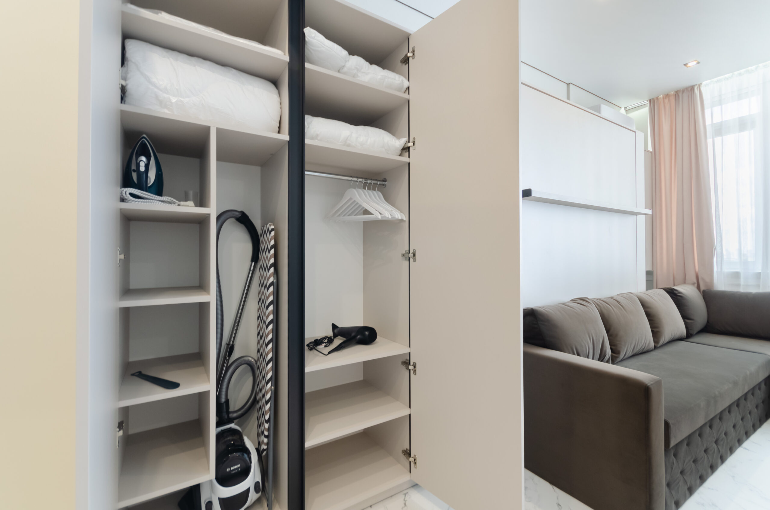 *living room area: sofa, which transforms into a bed 1600 x 2000 mm, also to the left of the bed at a distance of 12 cm there is a non-folding part of this sofa measuring 660 mm by 2100 mm, air conditioner, smart TV, wardrobe;