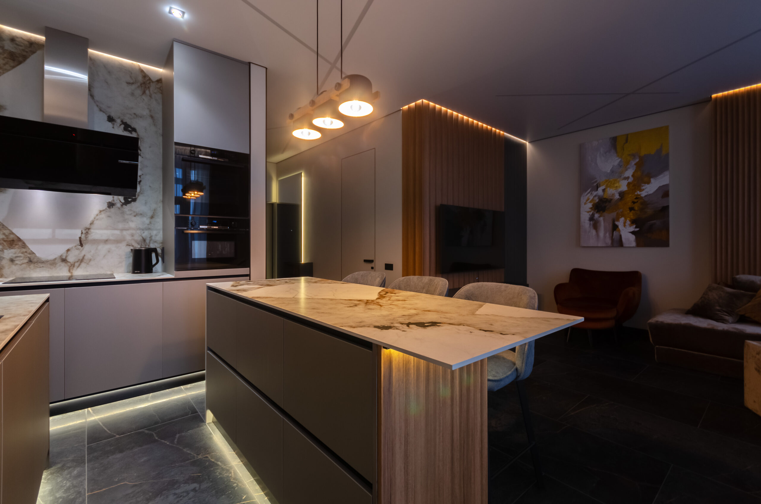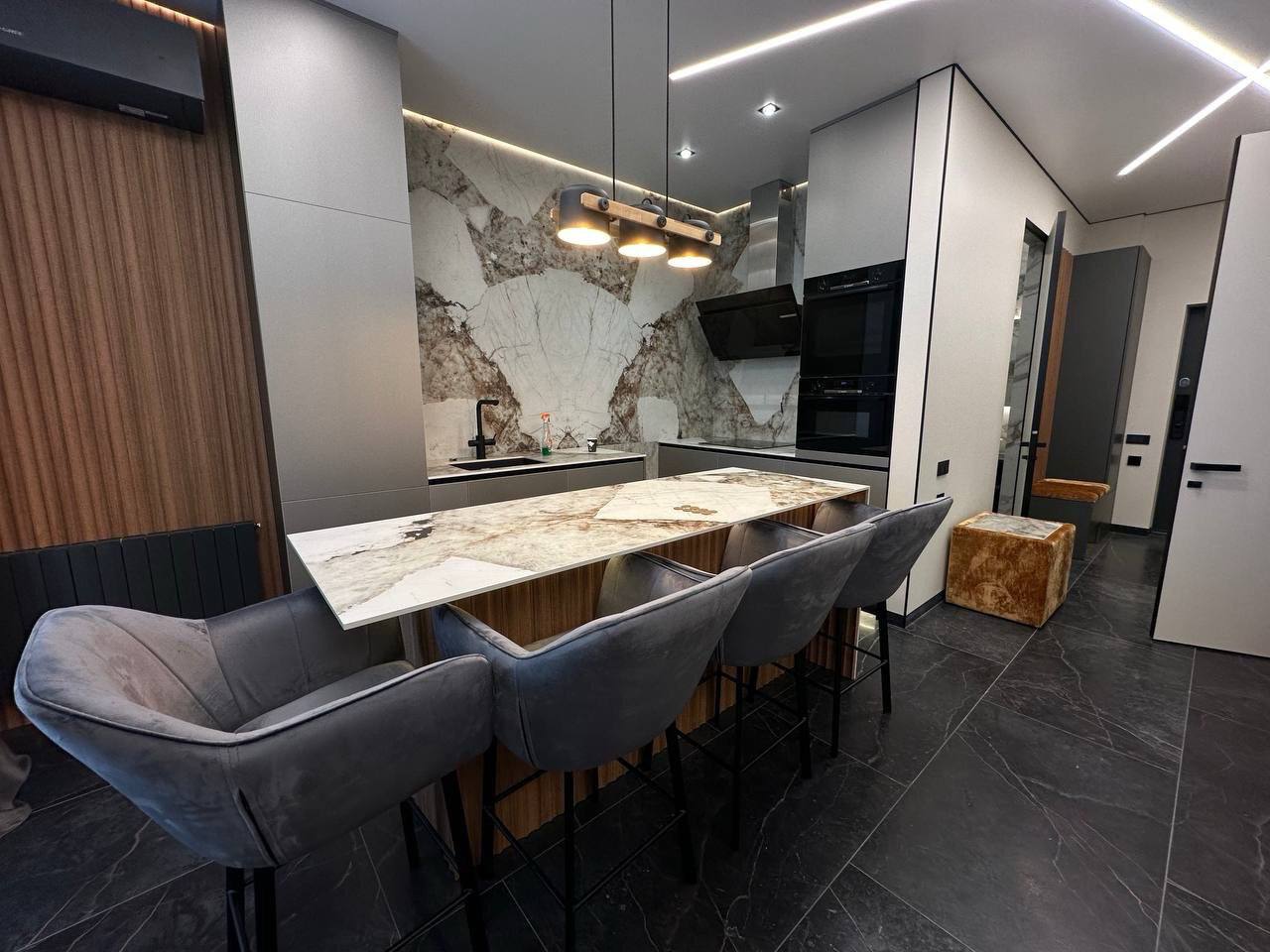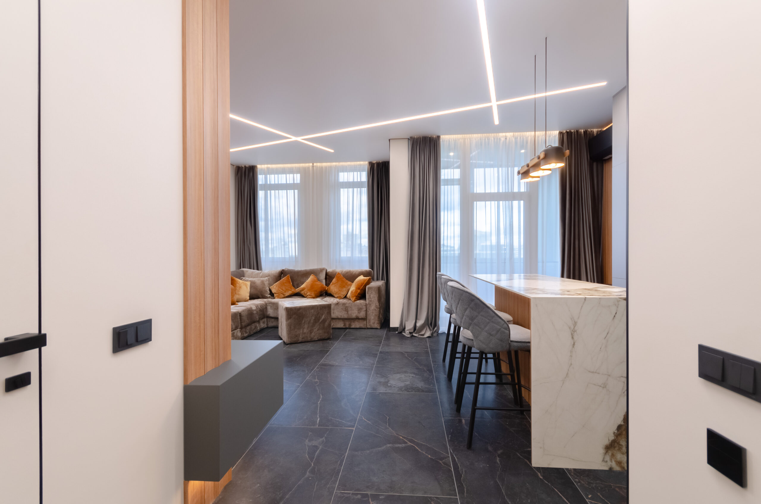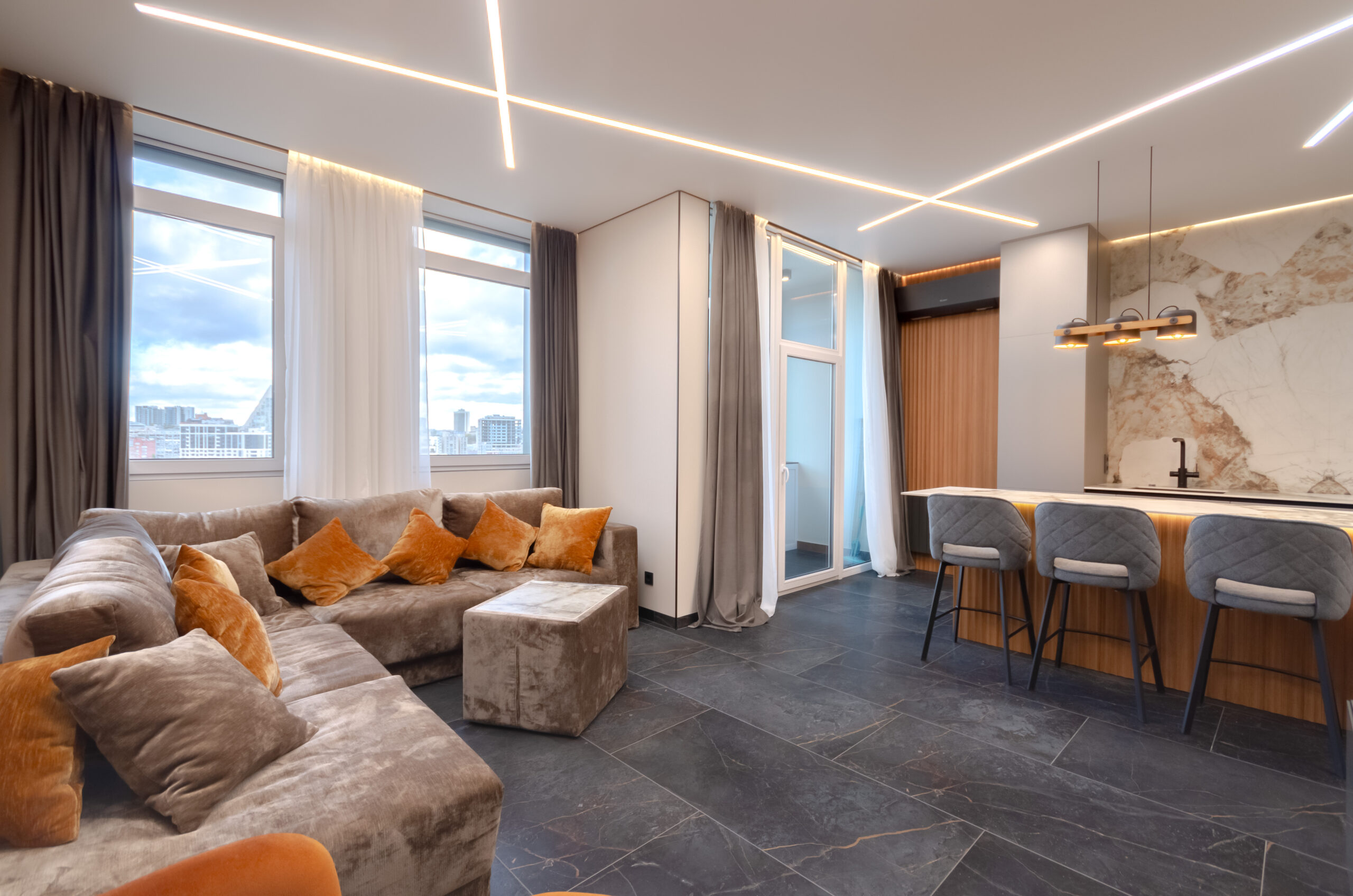 Квартира розташована на 18-му поверсі та має панорамний вид на місто Київ. Стильний сучасний дизайн. Квартира повністю обладнана всім необхідним для комфортного проживання.