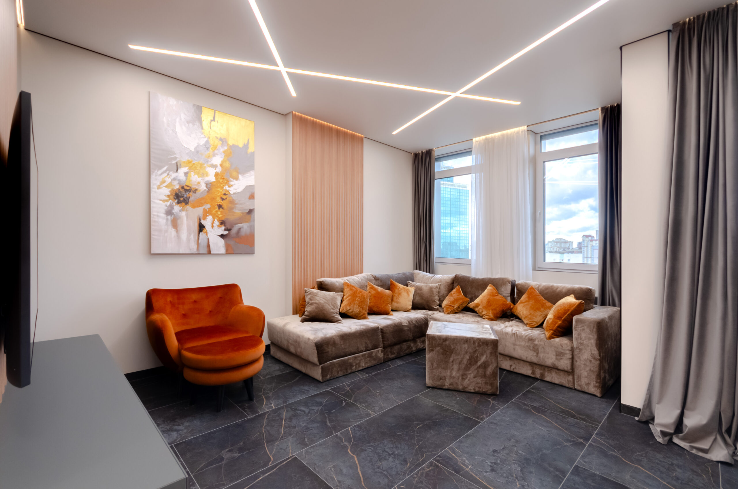 Вітальня: Модульний диван — стильний та зручний, не розкладається, але забезпечує максимум комфорту завдяки продуманій формі. Складається з двох частин: