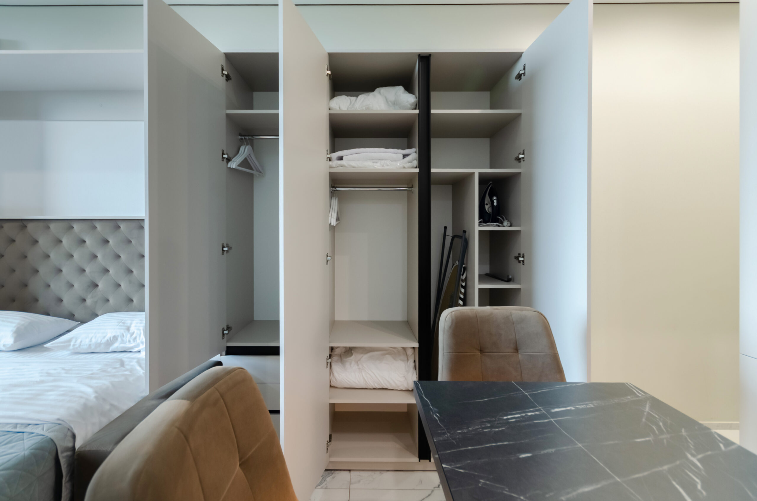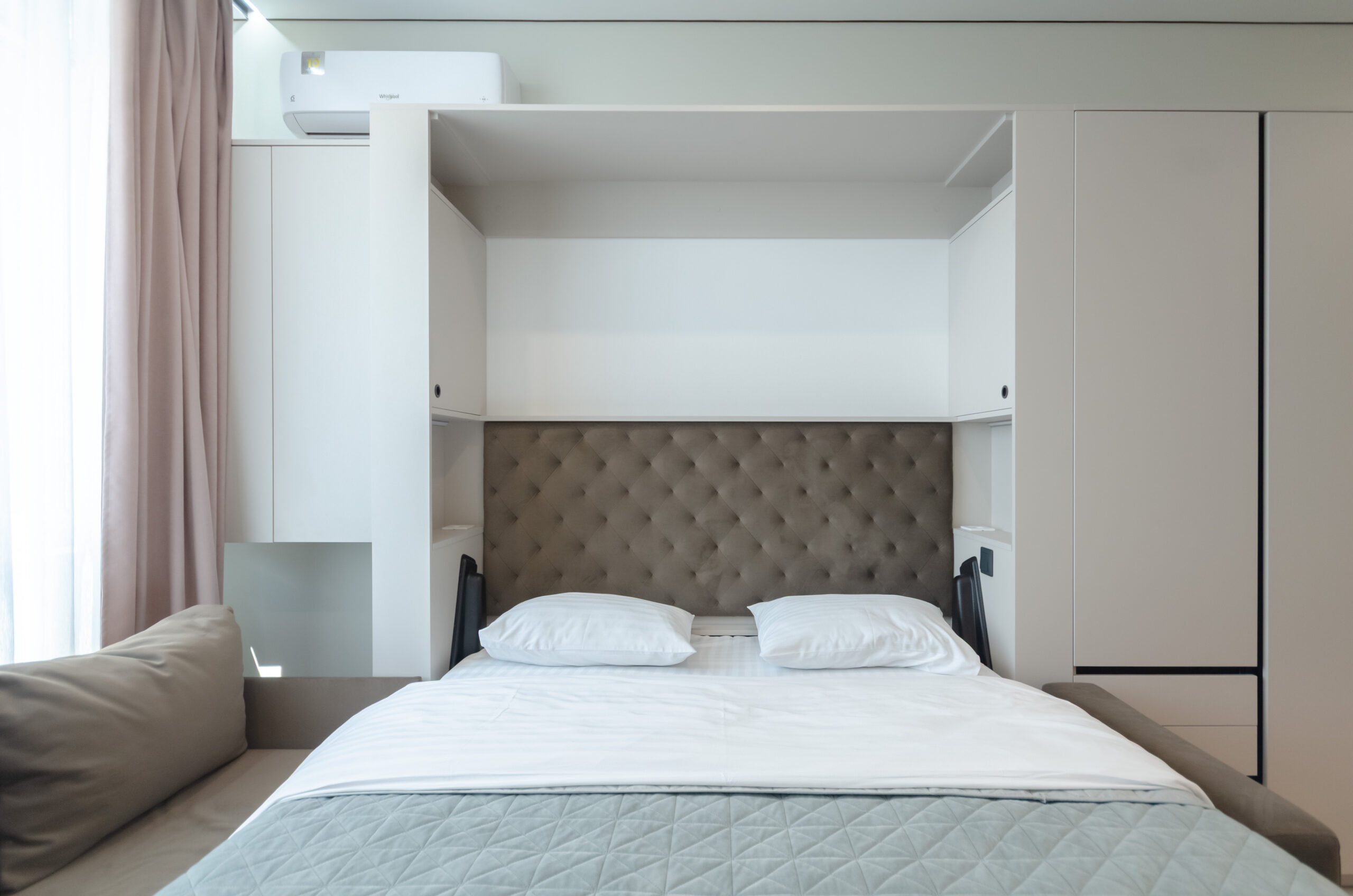 Living area: a sofa that transforms into a bed (1600 x 2000 mm), and to the left of the bed, at a distance of 12 cm, there is a non-folding part of the sofa measuring 660 mm x 2100 mm; air conditioner, smart TV, wardrobe;