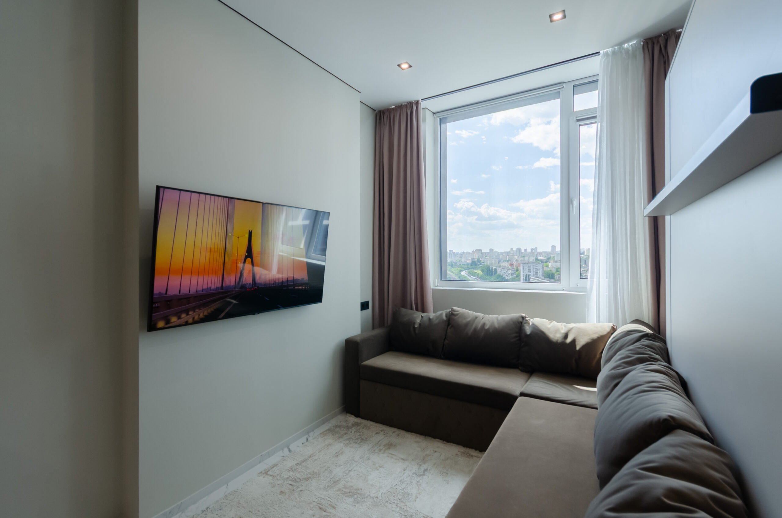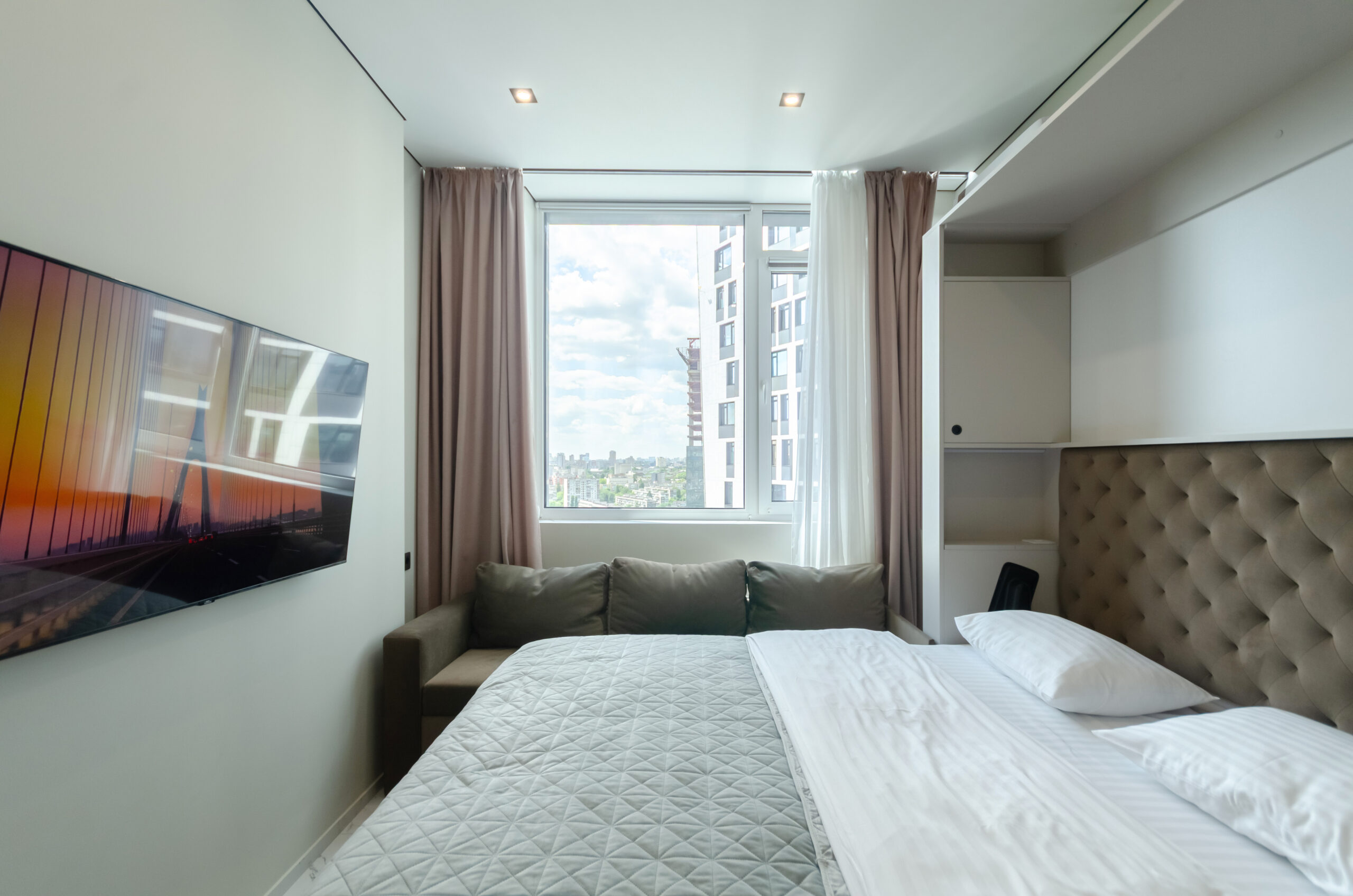 The apartment is situated on the 24th floor and offers a panoramic view of Kyiv. Stylish and modern design. The apartment is fully equipped with everything needed for a comfortable stay.
