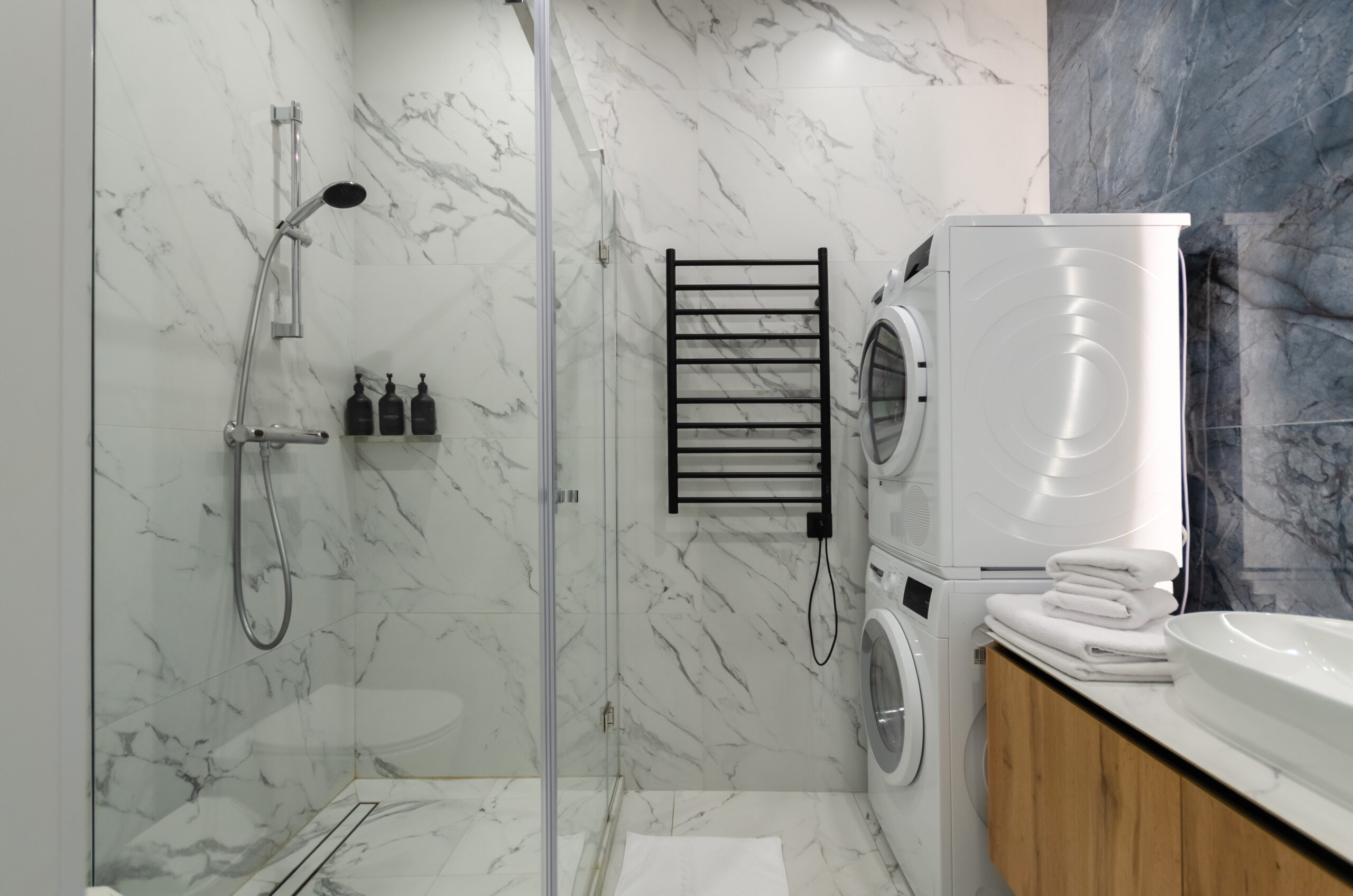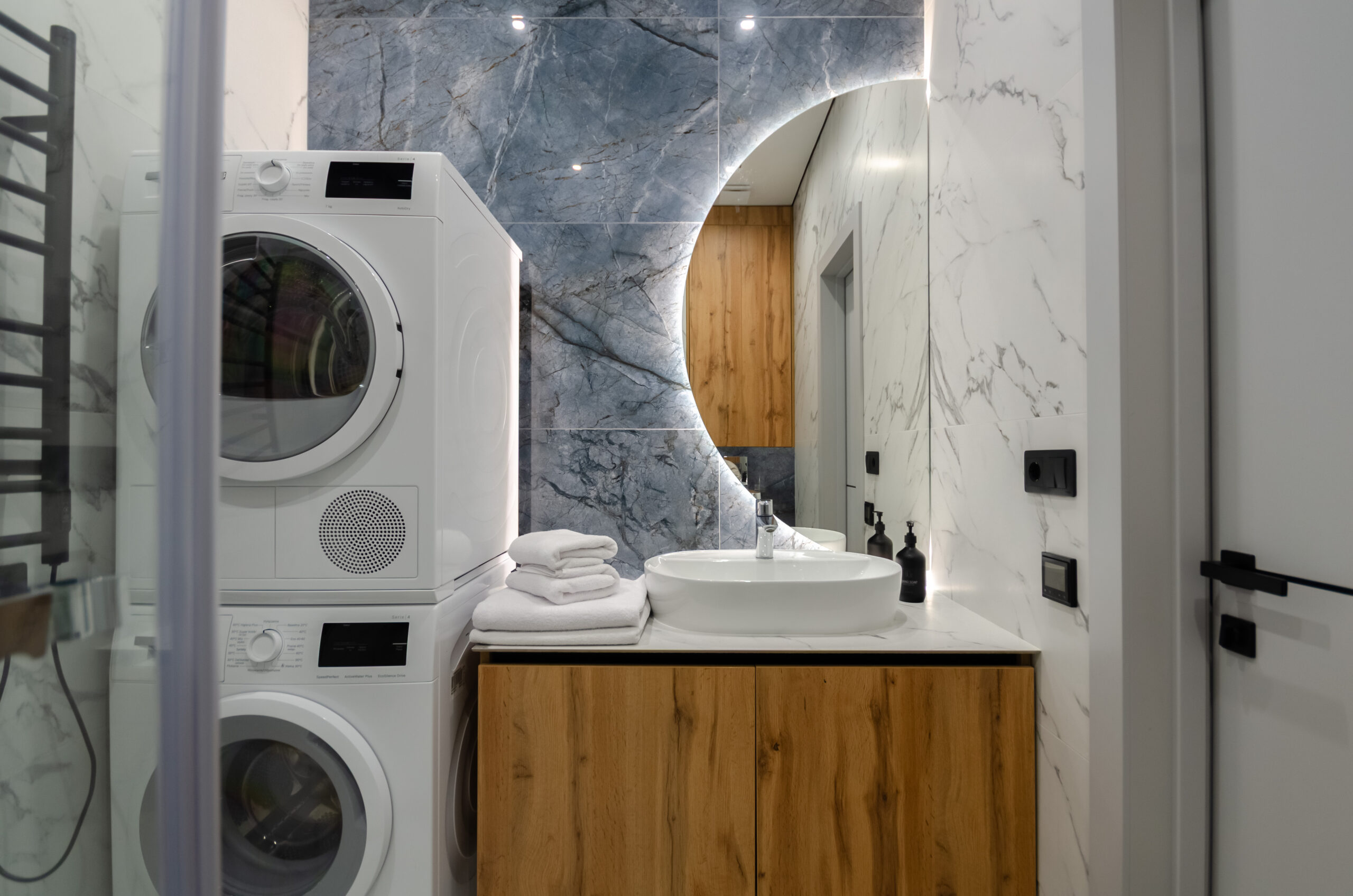 Bathroom: bath-shower combo, washing machine, dryer, toiletries, hairdryer, towels;