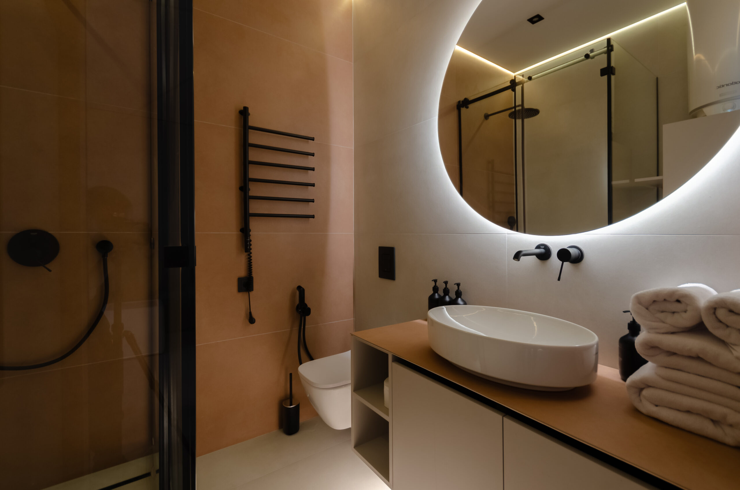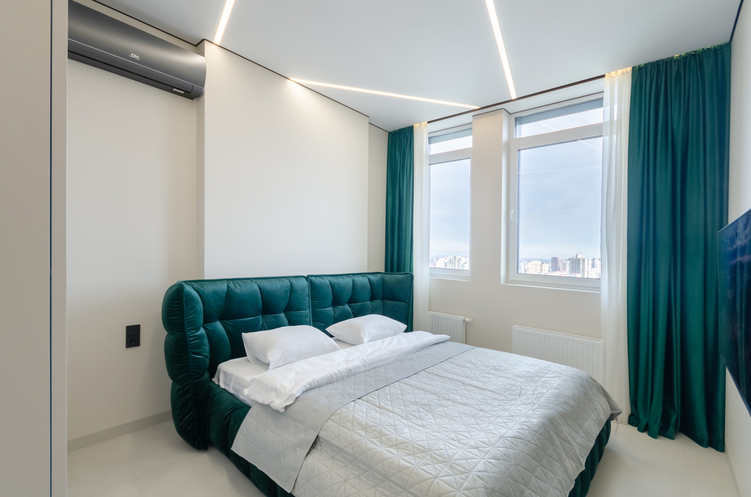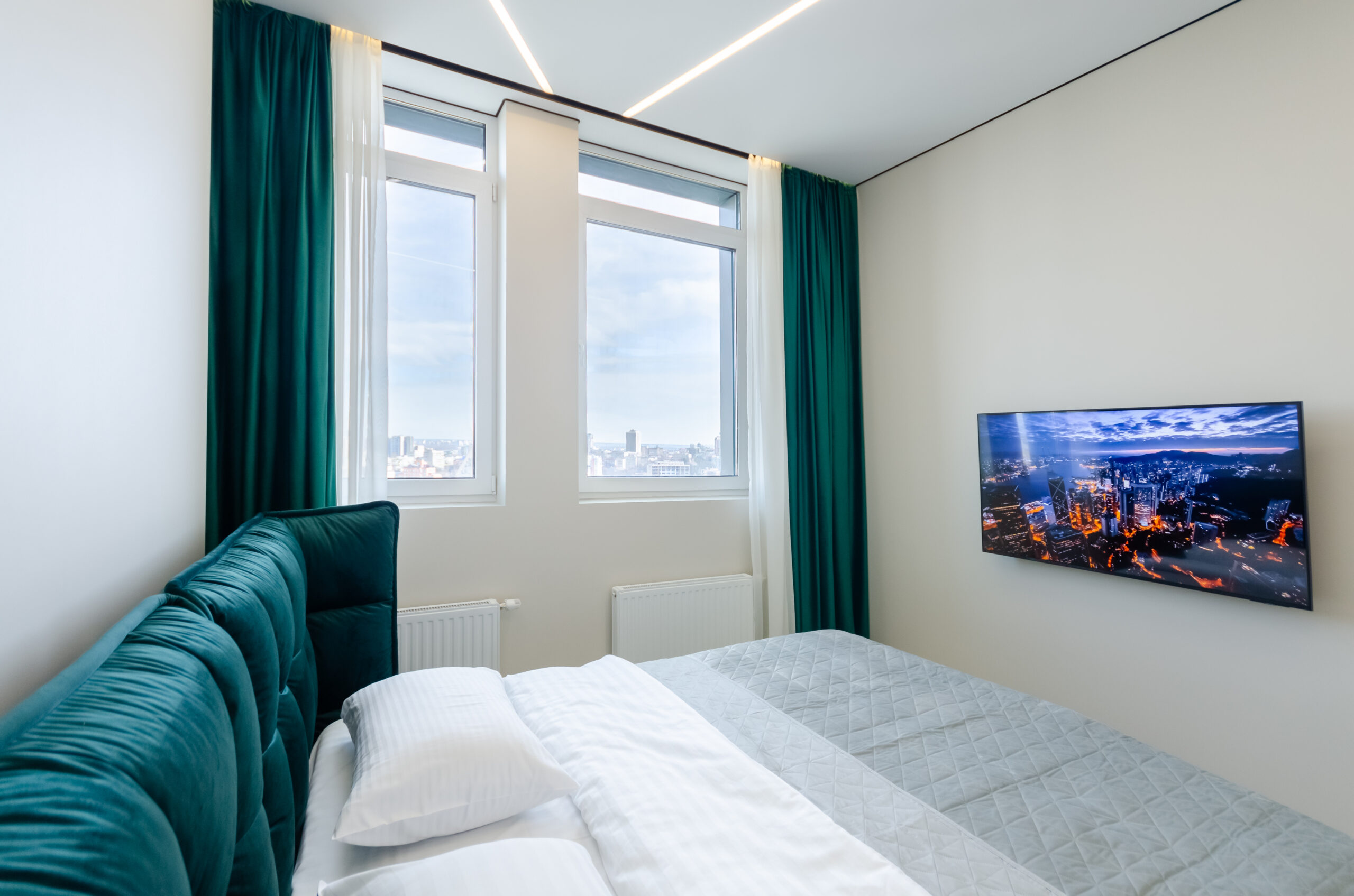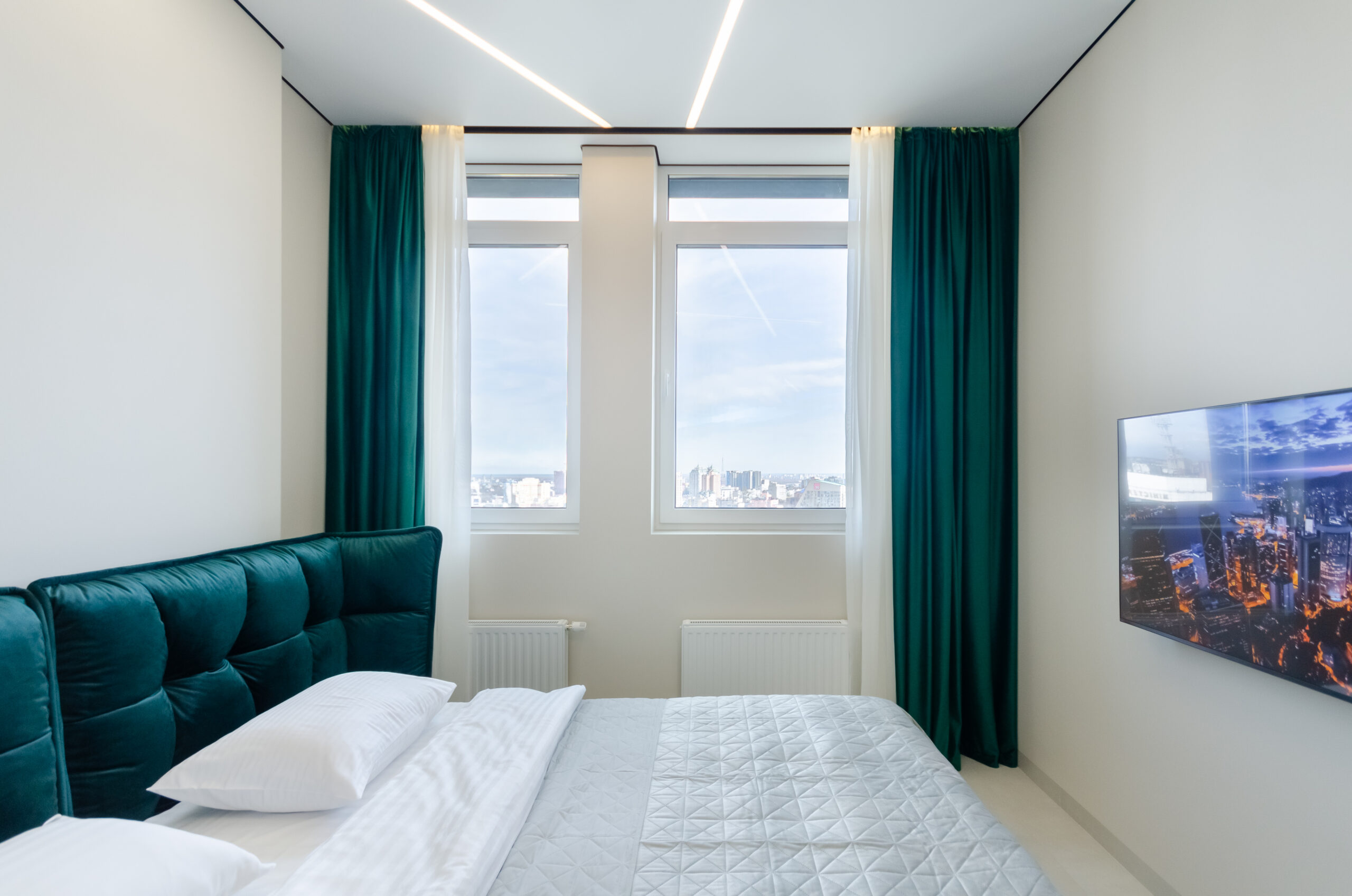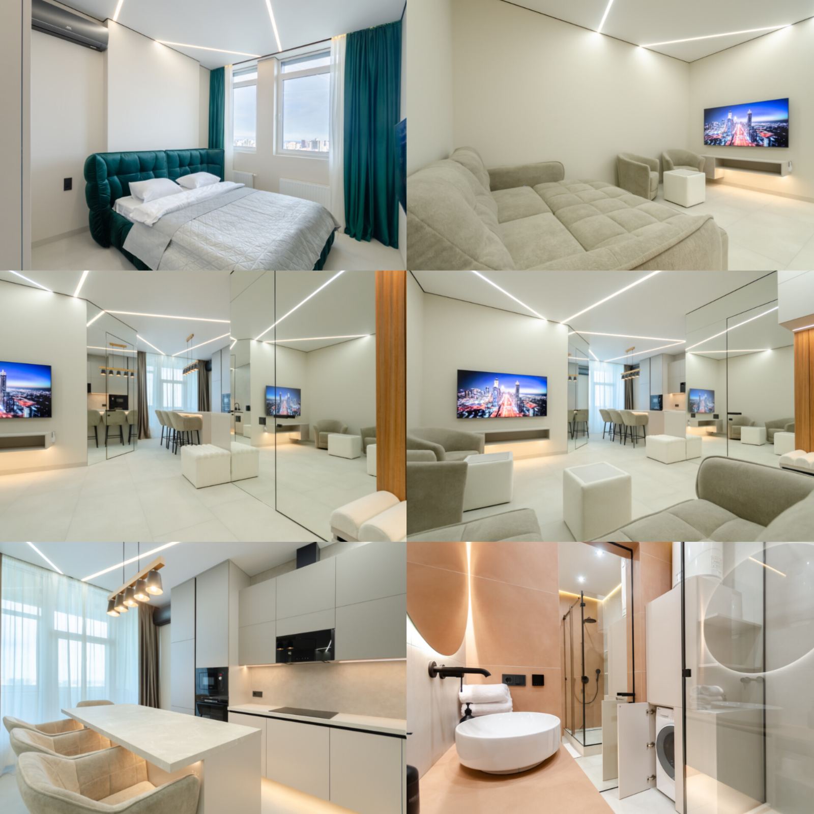 The apartment is located on the 34th floor with a panoramic view of Kyiv city. Stylish modern design. The apartment is fully equipped with everything necessary for a comfortable stay.