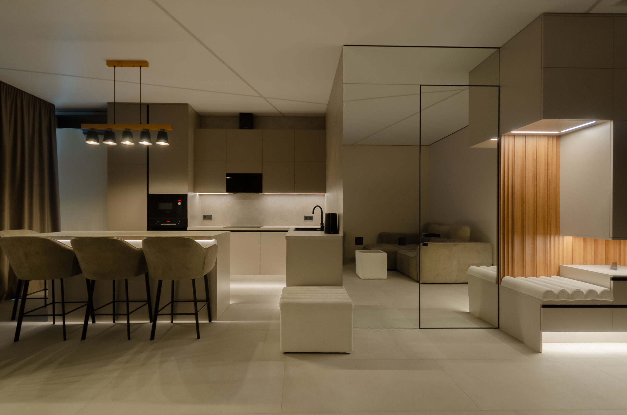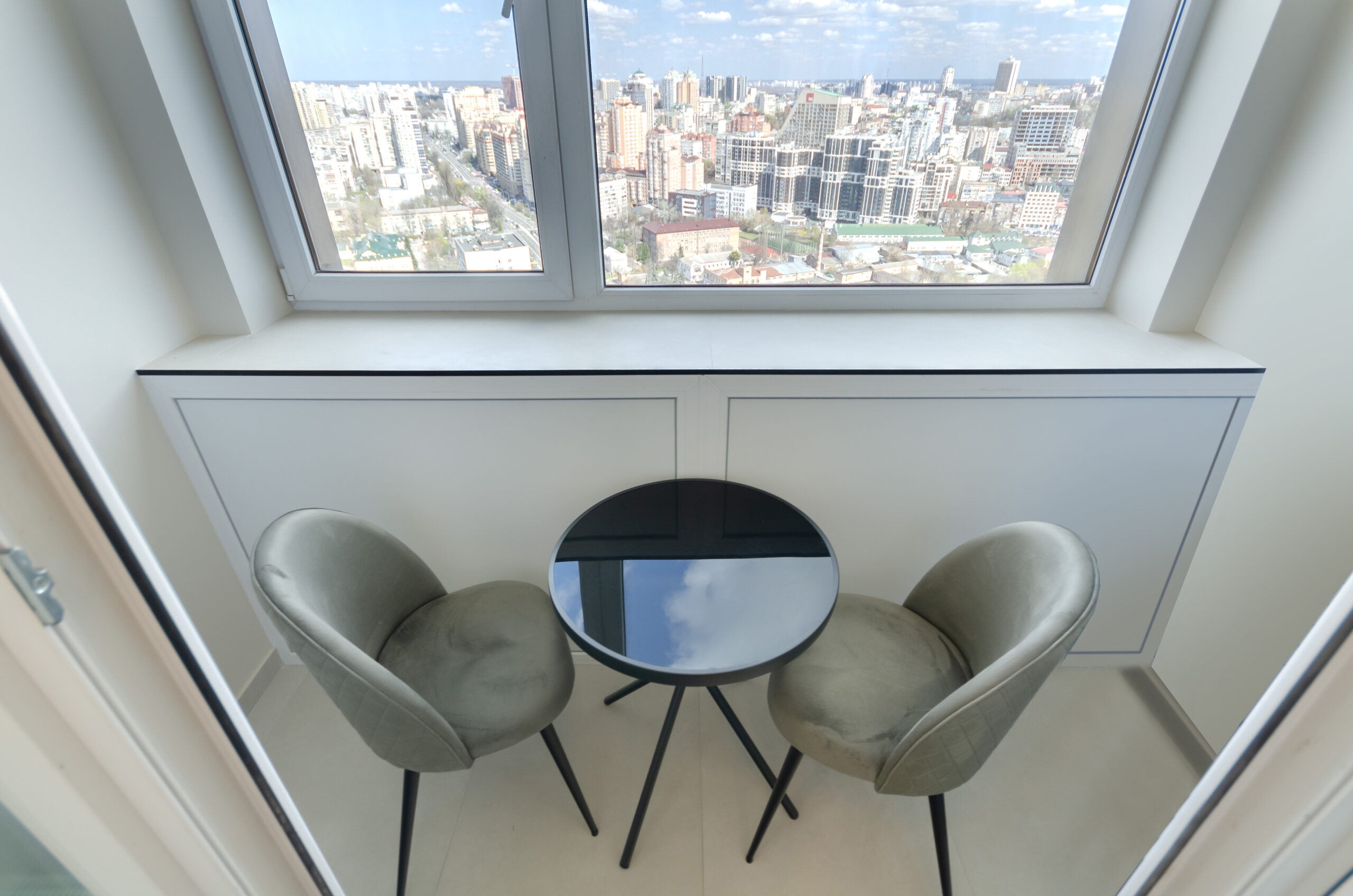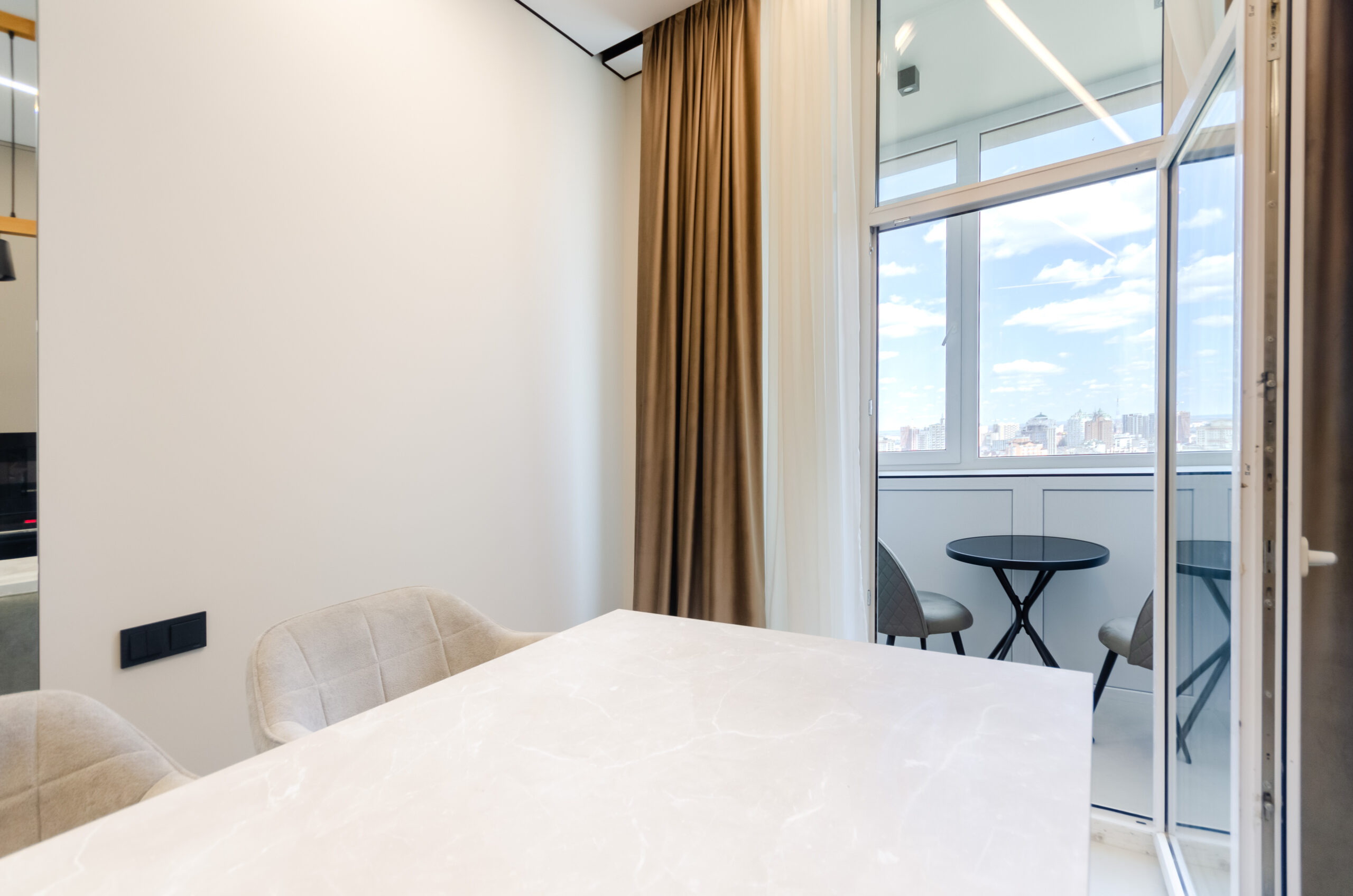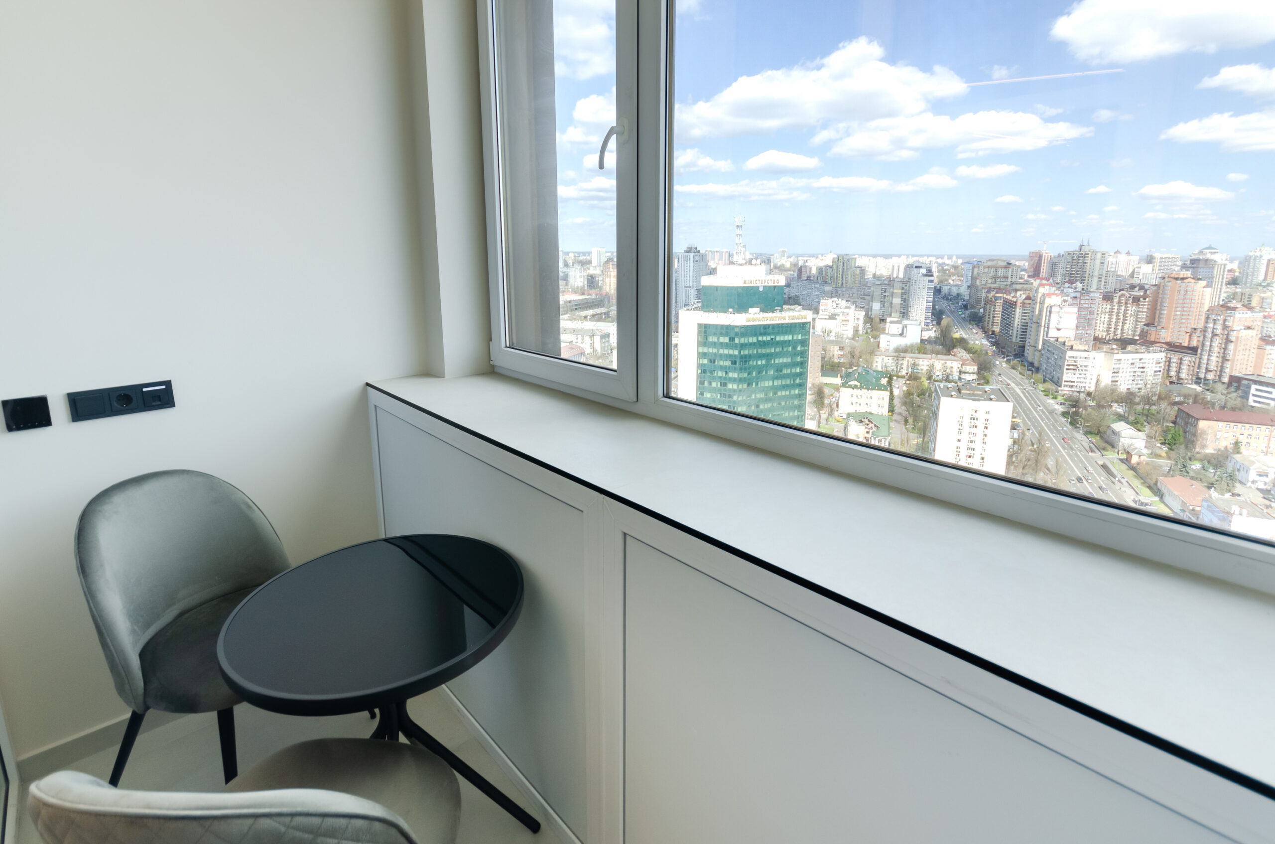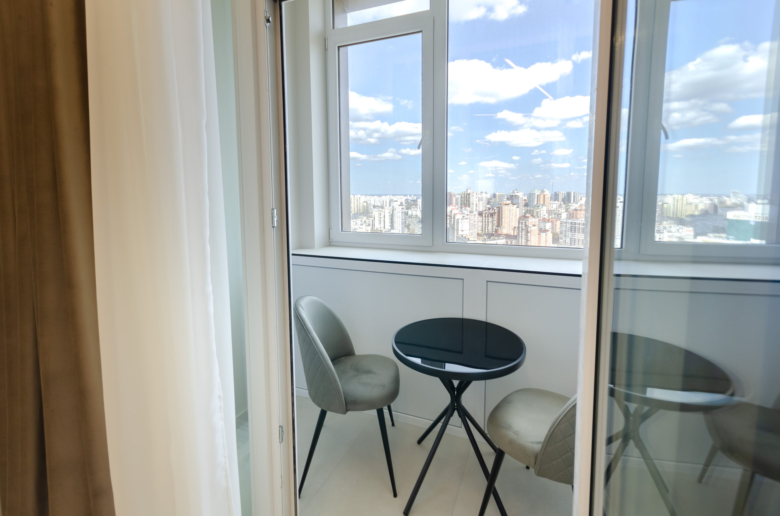 he apartment is located on the 34th floor with a panoramic view of Kyiv city.