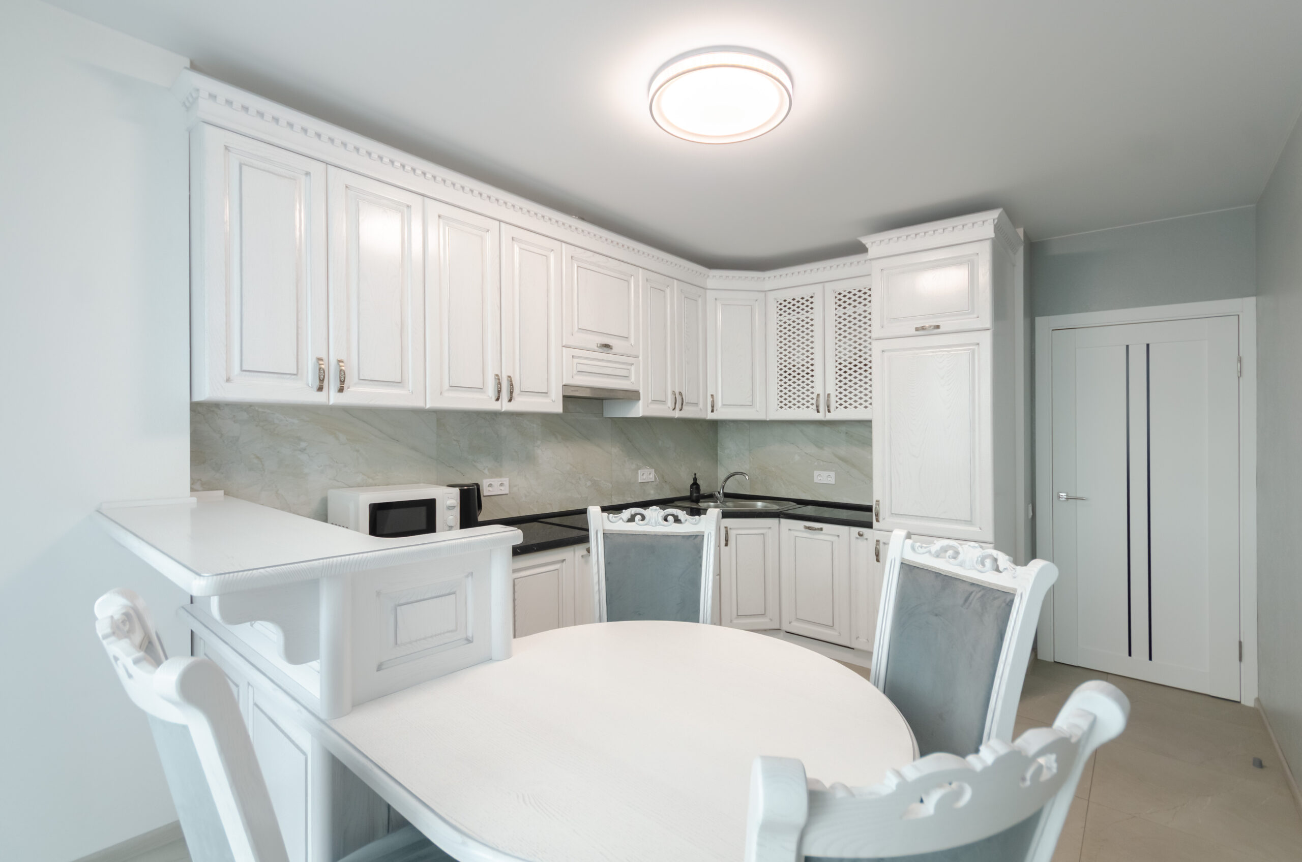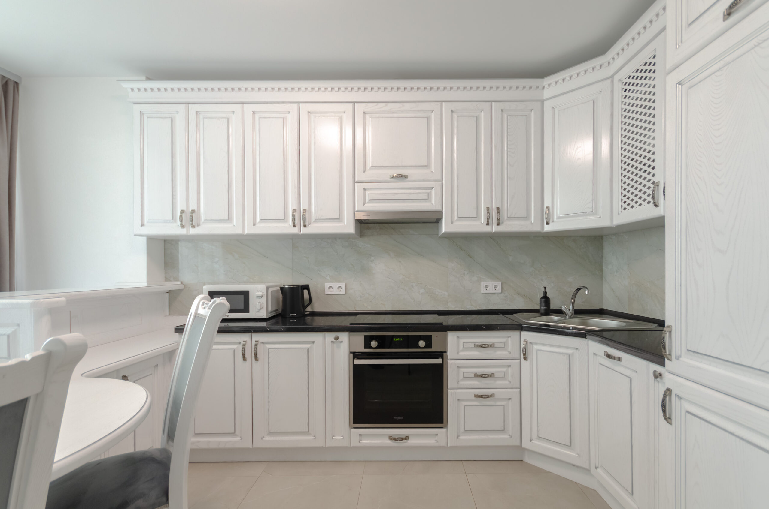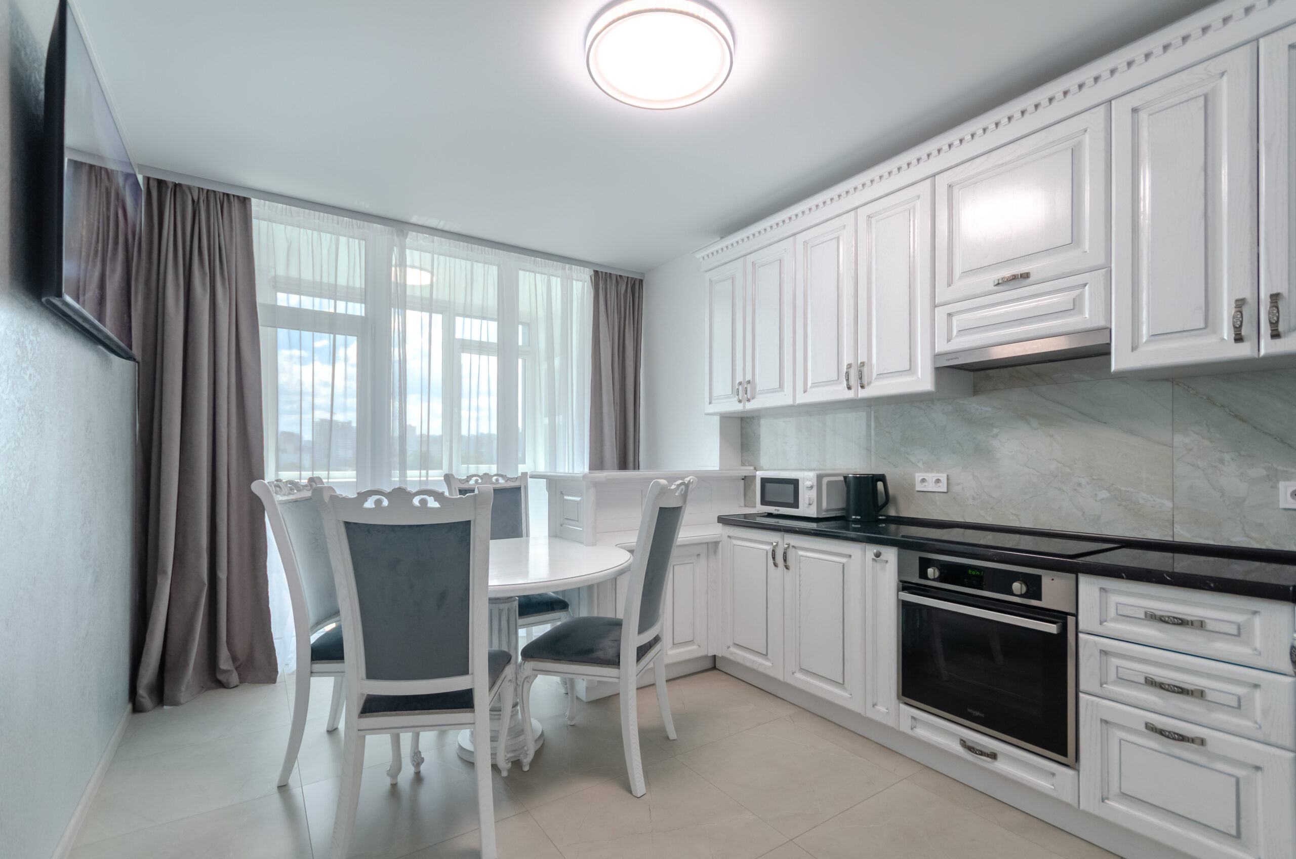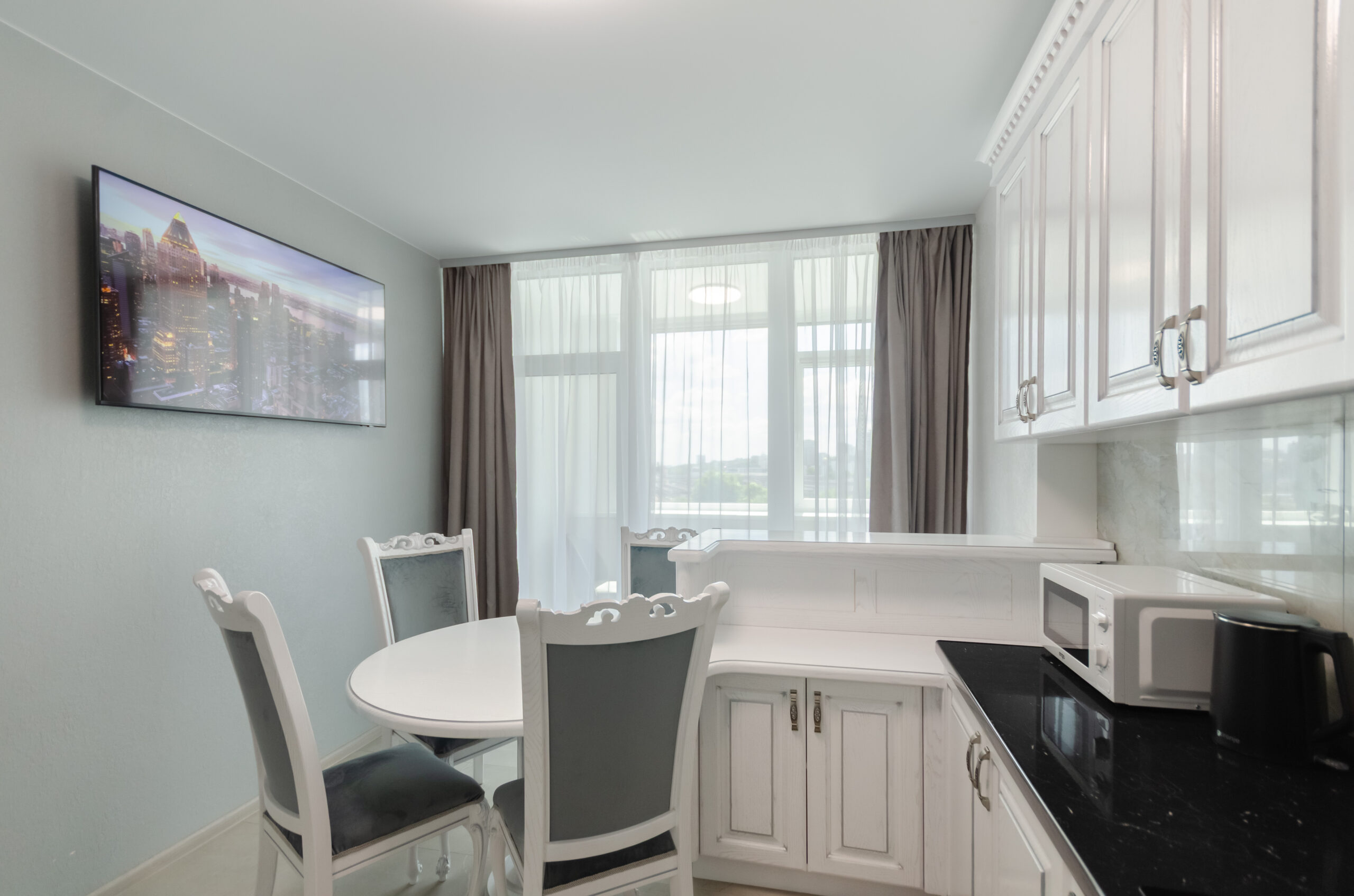 Kitchen area: refrigerator, microwave, electric kettle, electric stove, all necessary utensils, cups, glasses, washing machine, dishwasher, dining table with four comfortable chairs