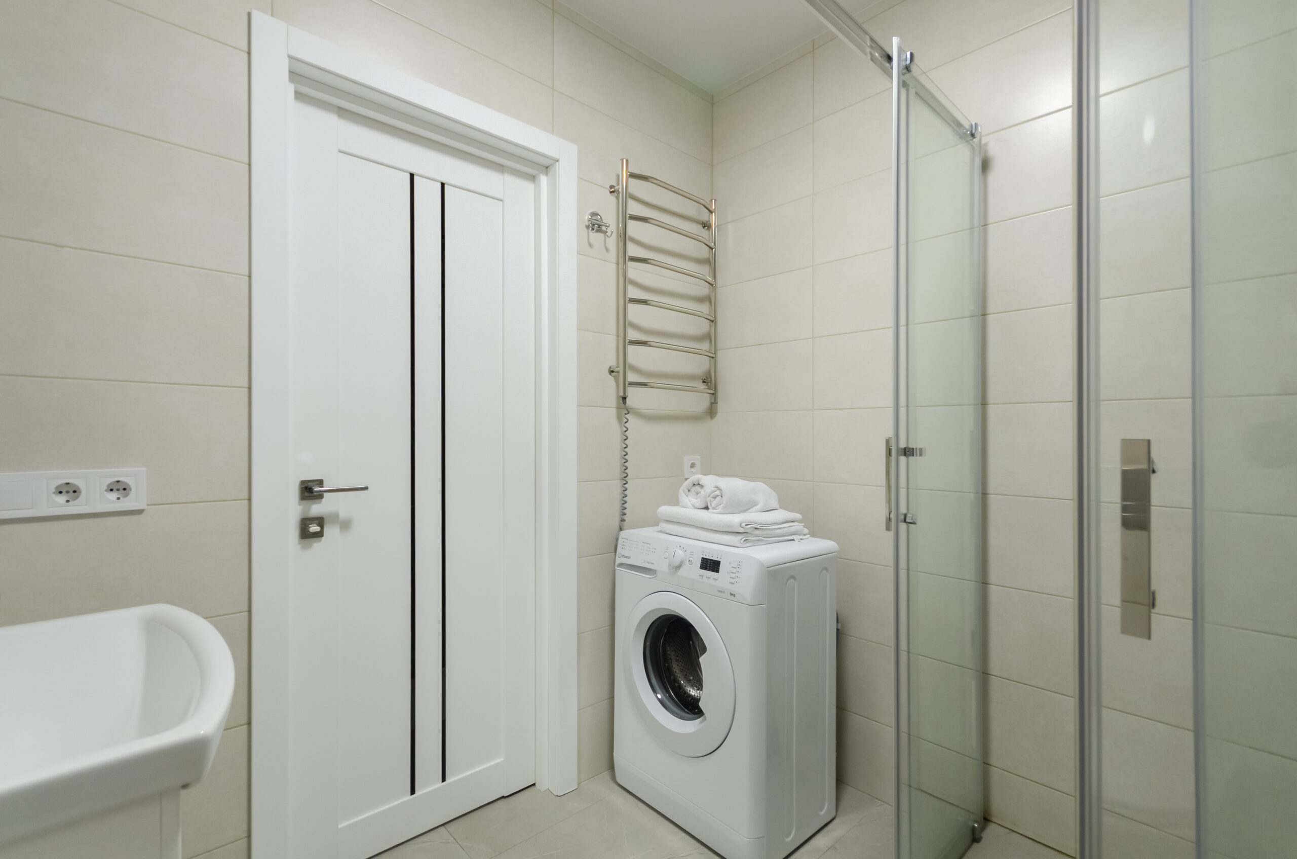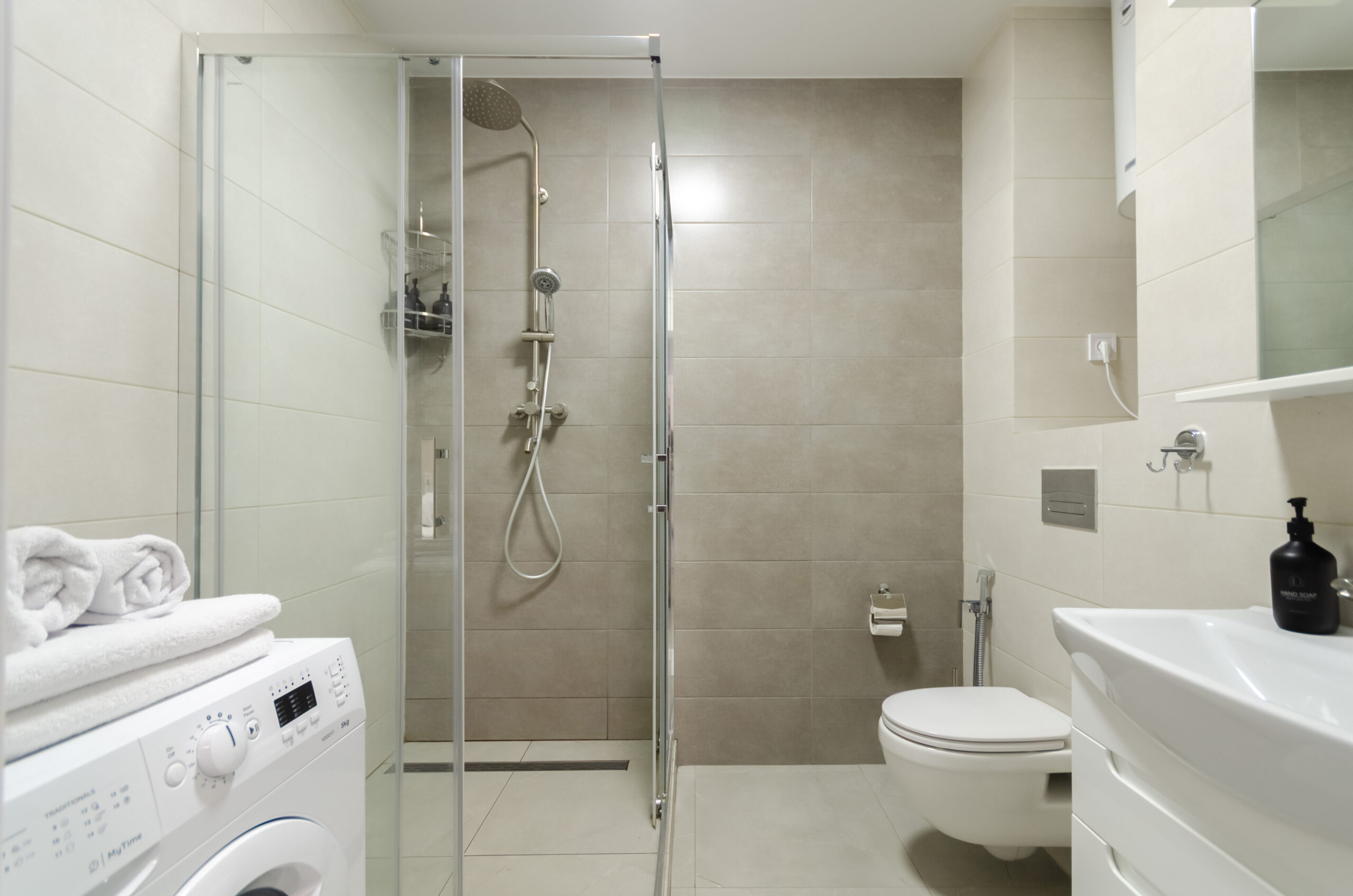 Bathroom: bath-shower, washing machine, toiletries, hairdryer, towels