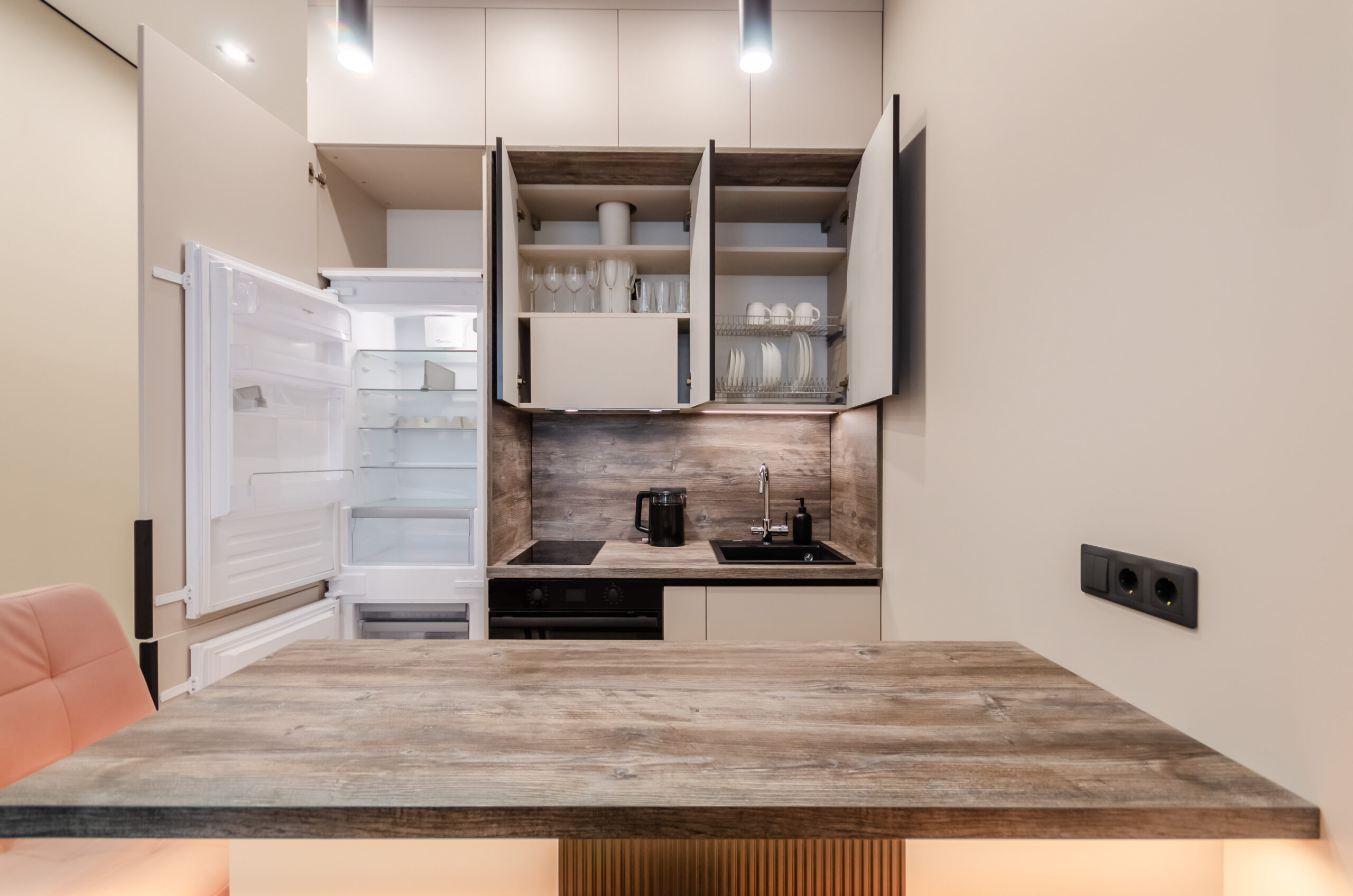 *kitchen area: (refrigerator, microwave oven, kettle, electric stove, water filters, pot, pan, all necessary dishes, cups, glasses, dining area)