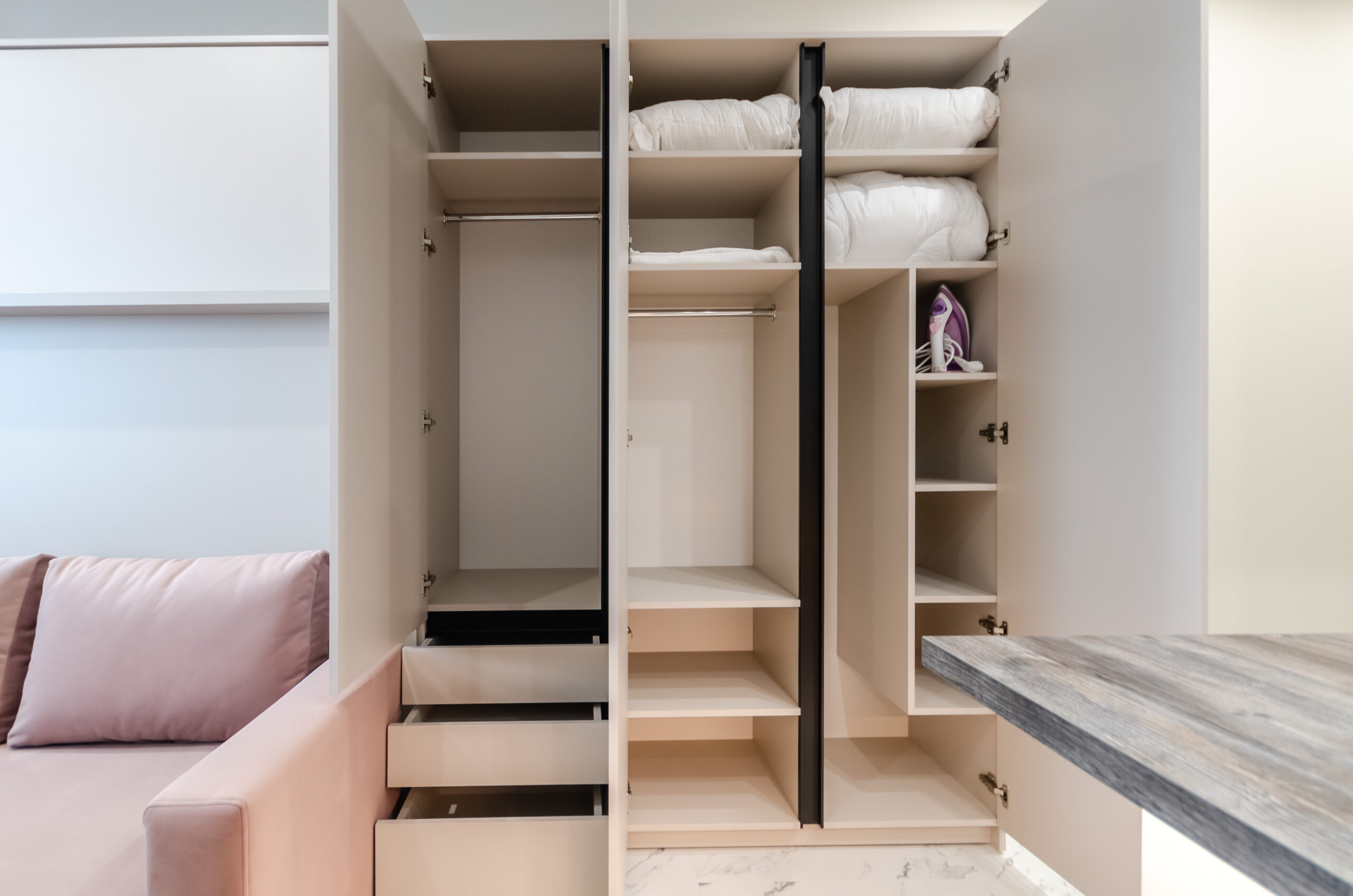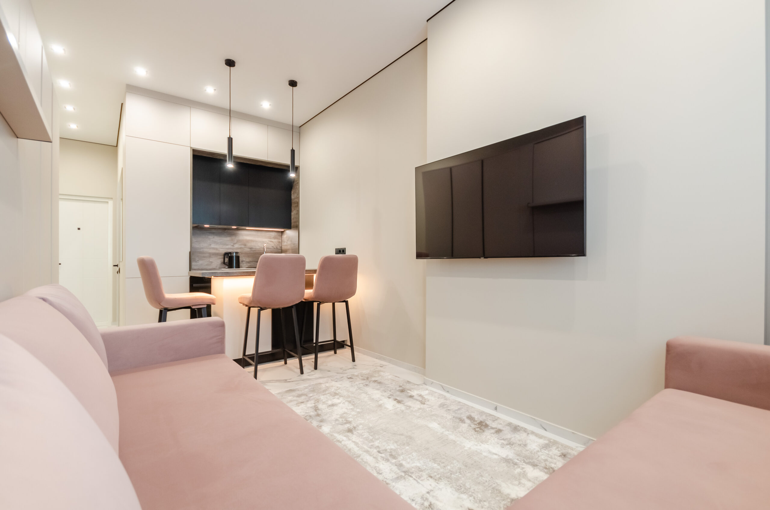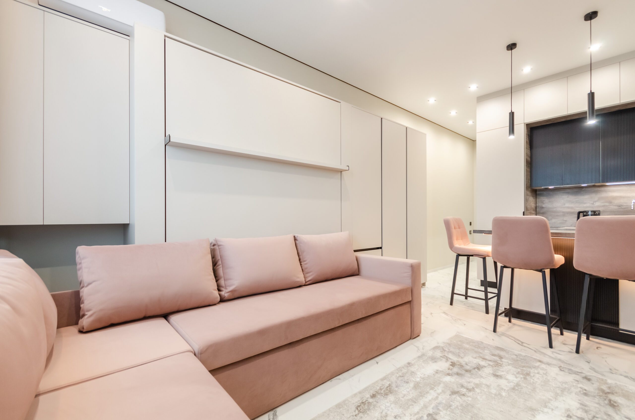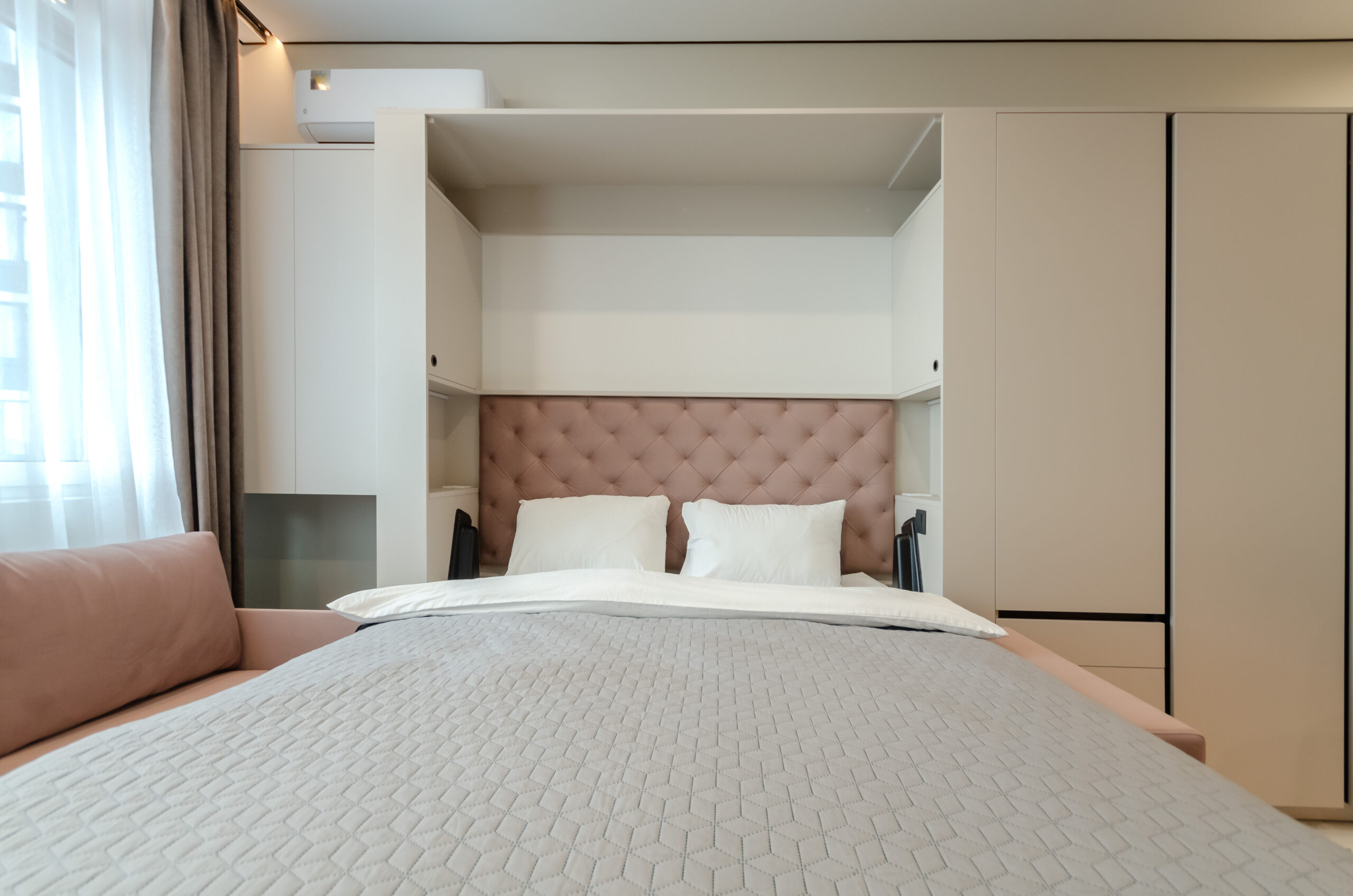 *living room area: sofa, which transforms into a bed 1600 x 2000 mm, also to the left of the bed at a distance of 12 cm there is a non-folding part of this sofa measuring 660 mm by 2100 mm, air conditioner, smart TV, wardrobe;