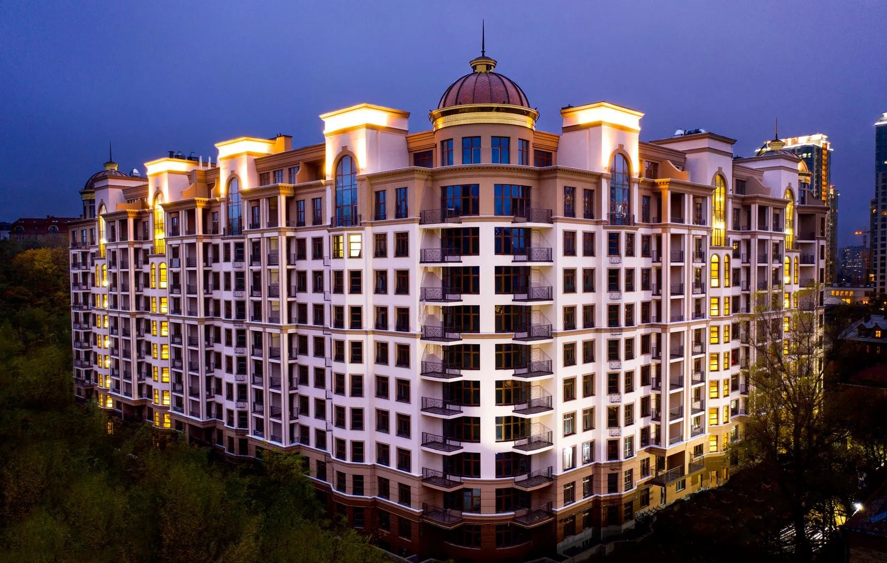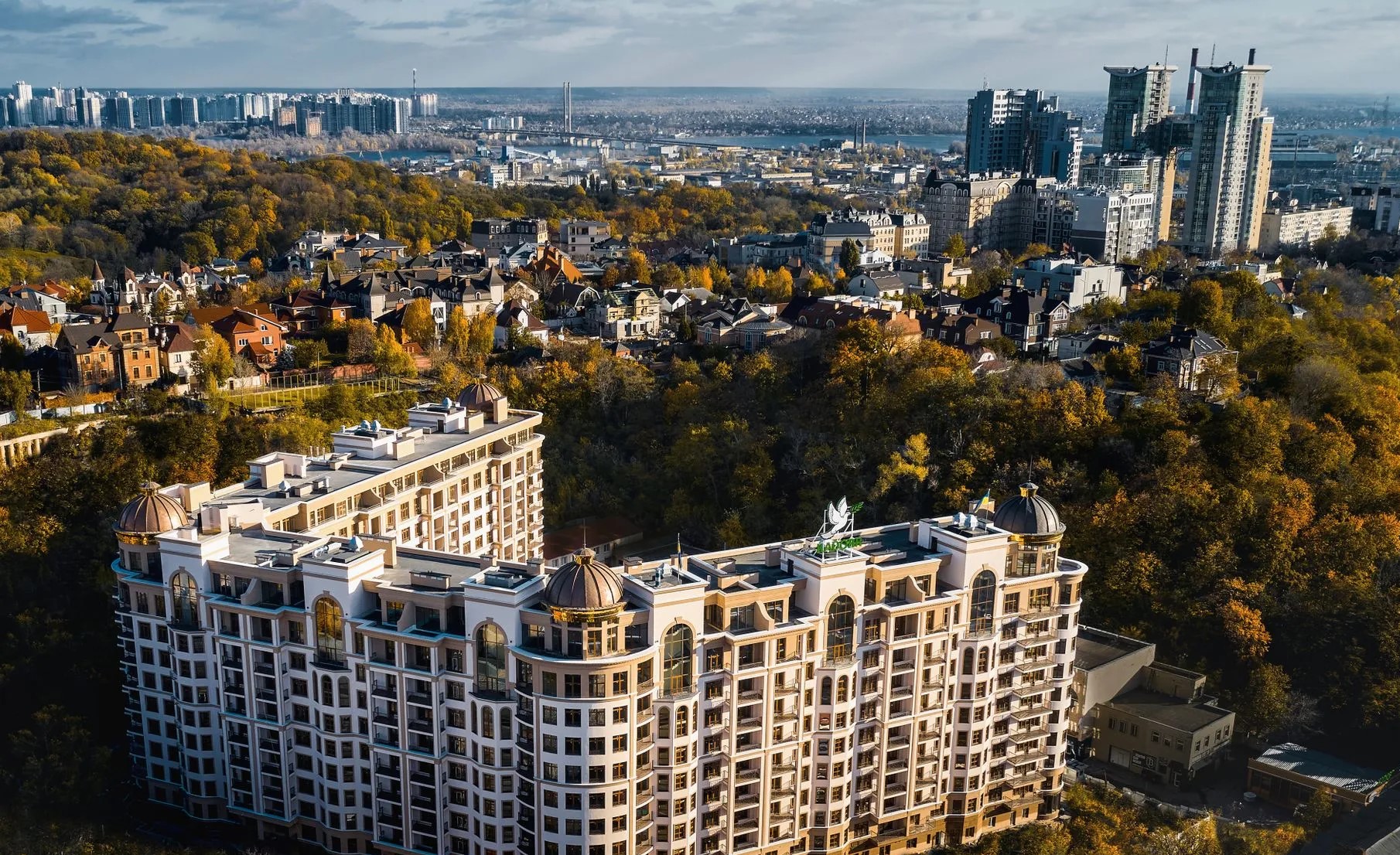 The Pechersk Plaza is located in the Pechersk district of the right bank of Kyiv near the botanical garden. The windows offer a beautiful view of the green area. The complex is guarded around the clock. There is an underground parking lot in the building which can be used as shelter.