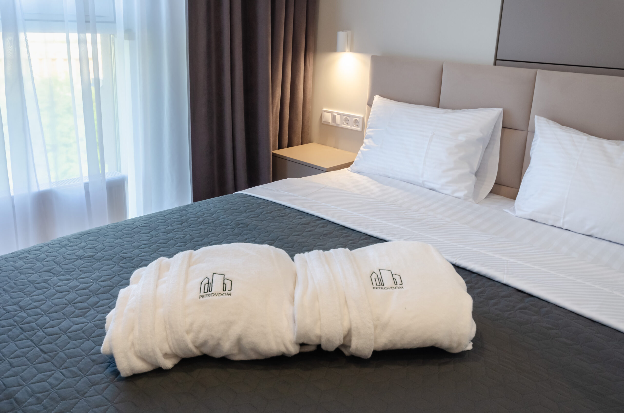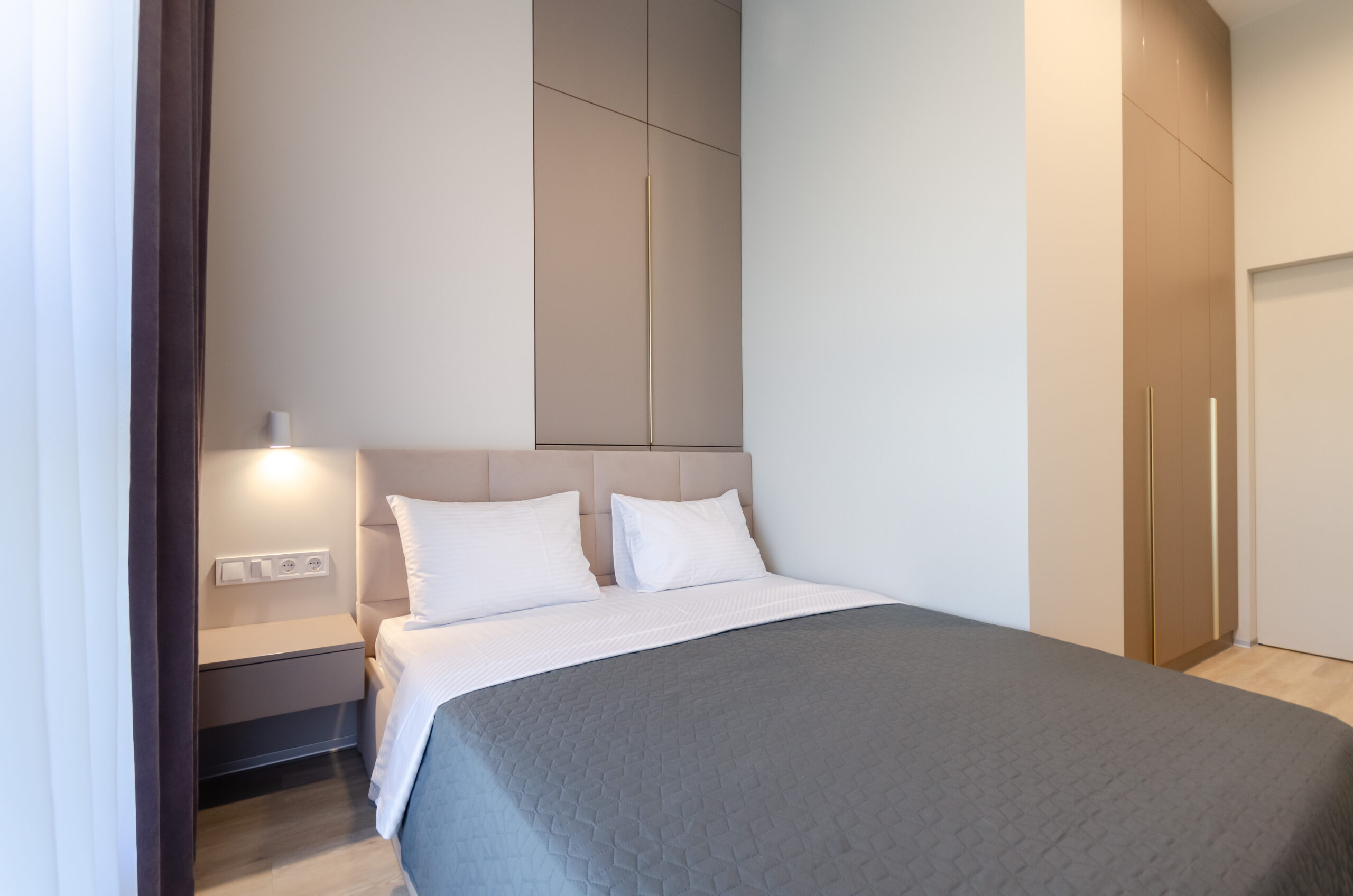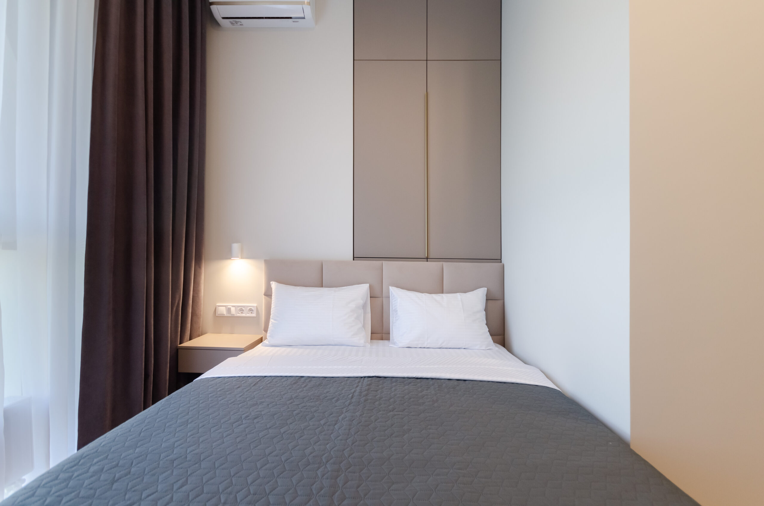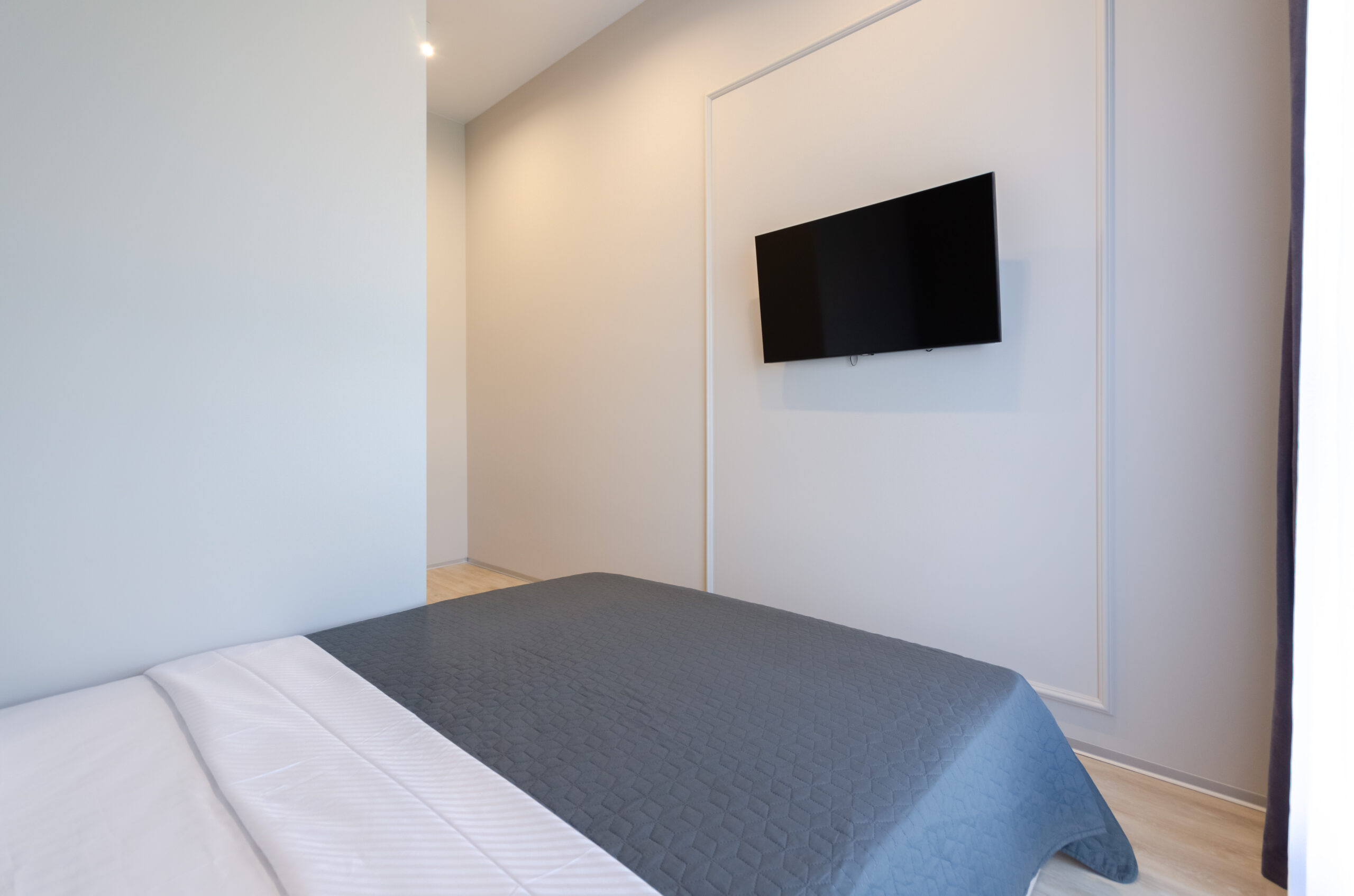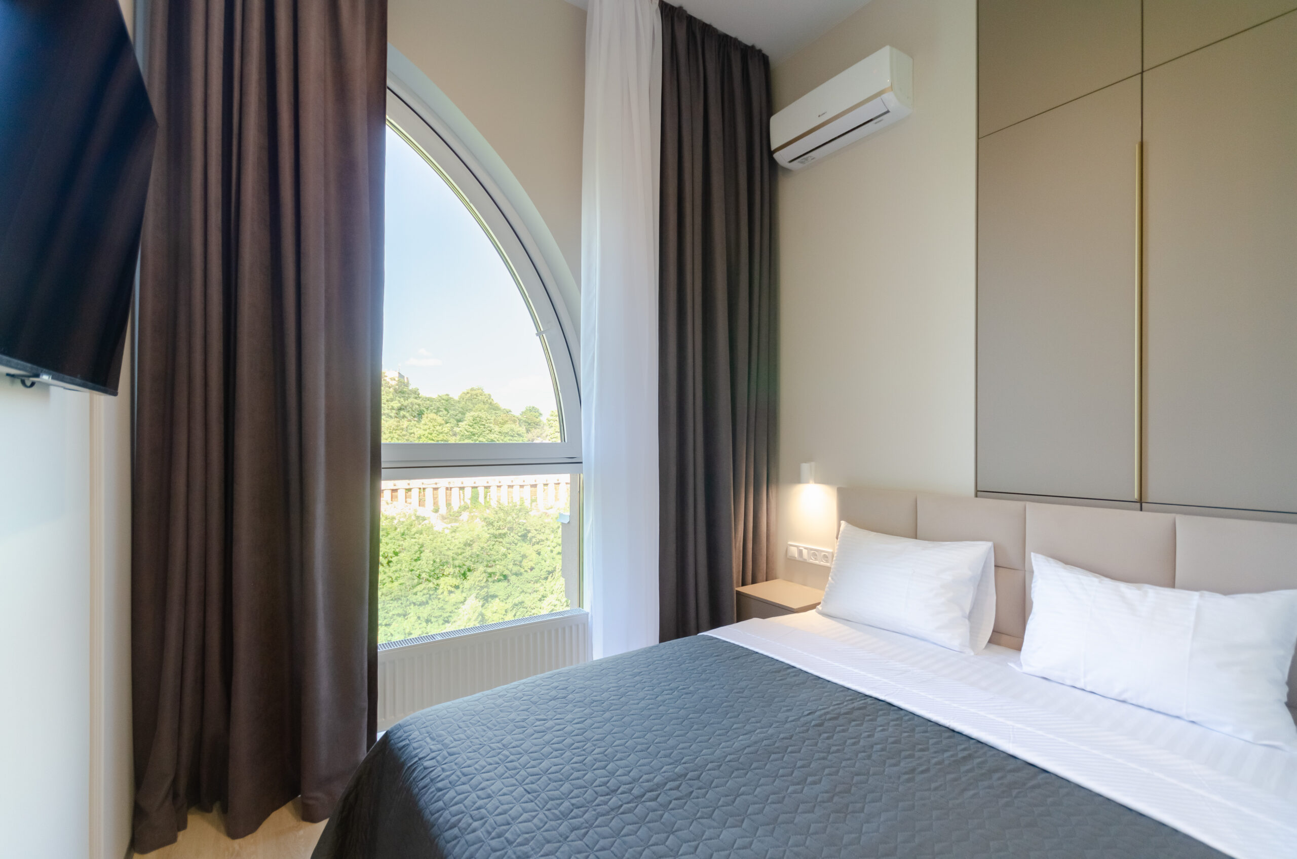 *Separate bedroom: bed 160*200 cm, wardrobe , window with roller blinds, smart – TV, air conditioning.