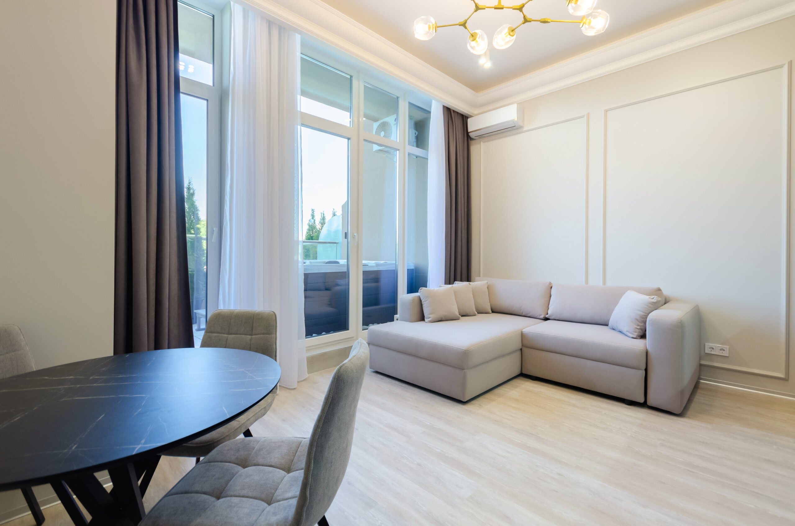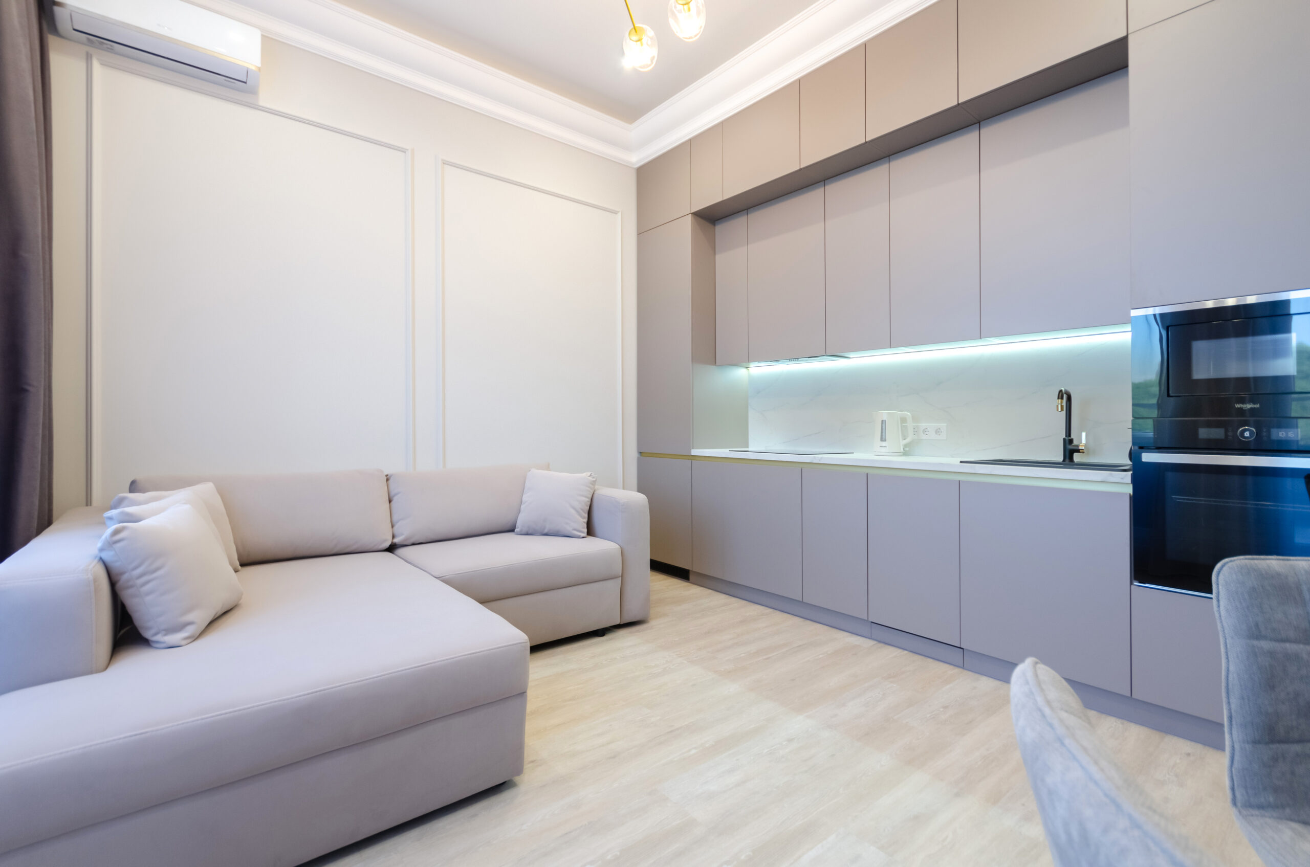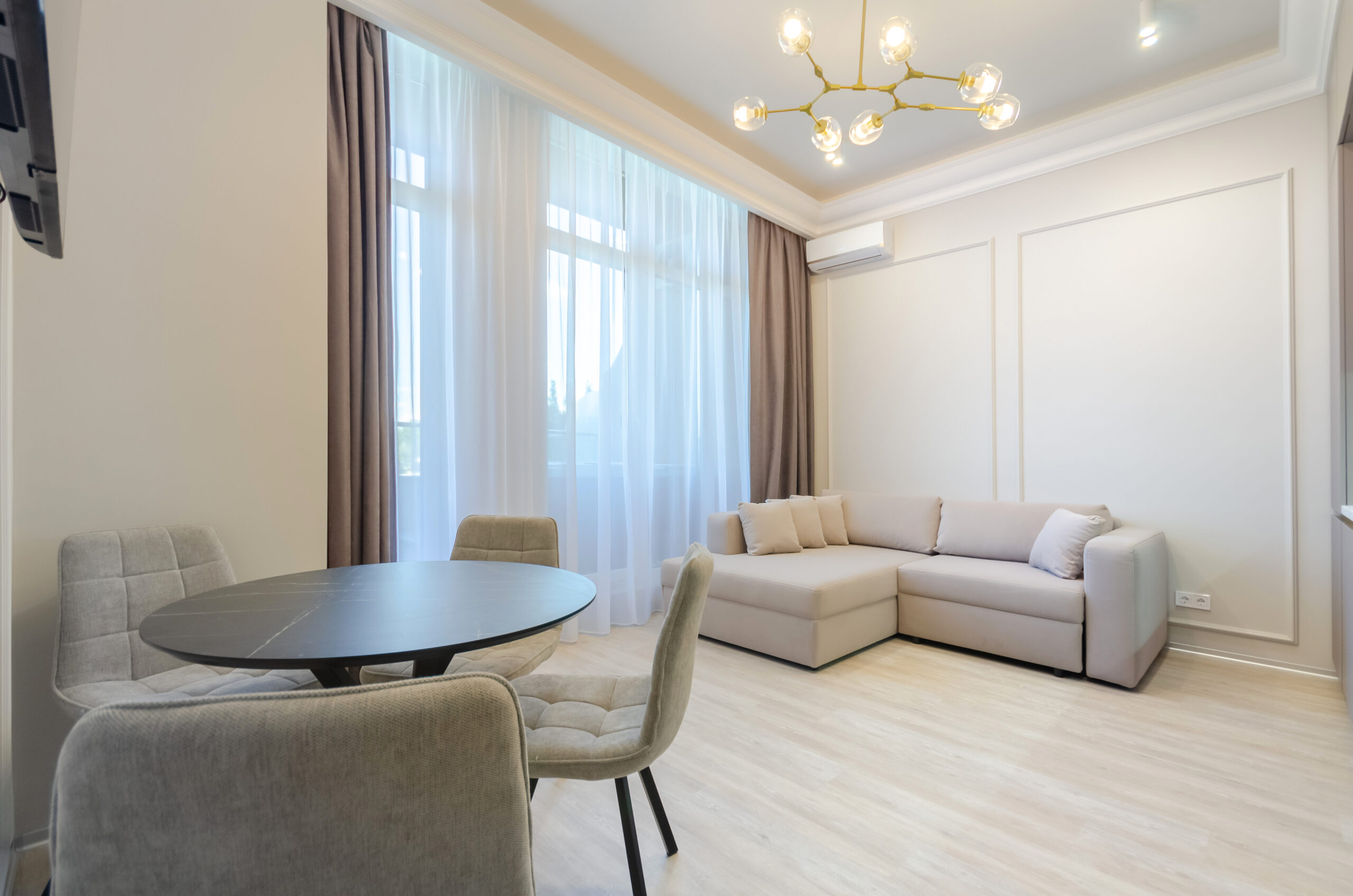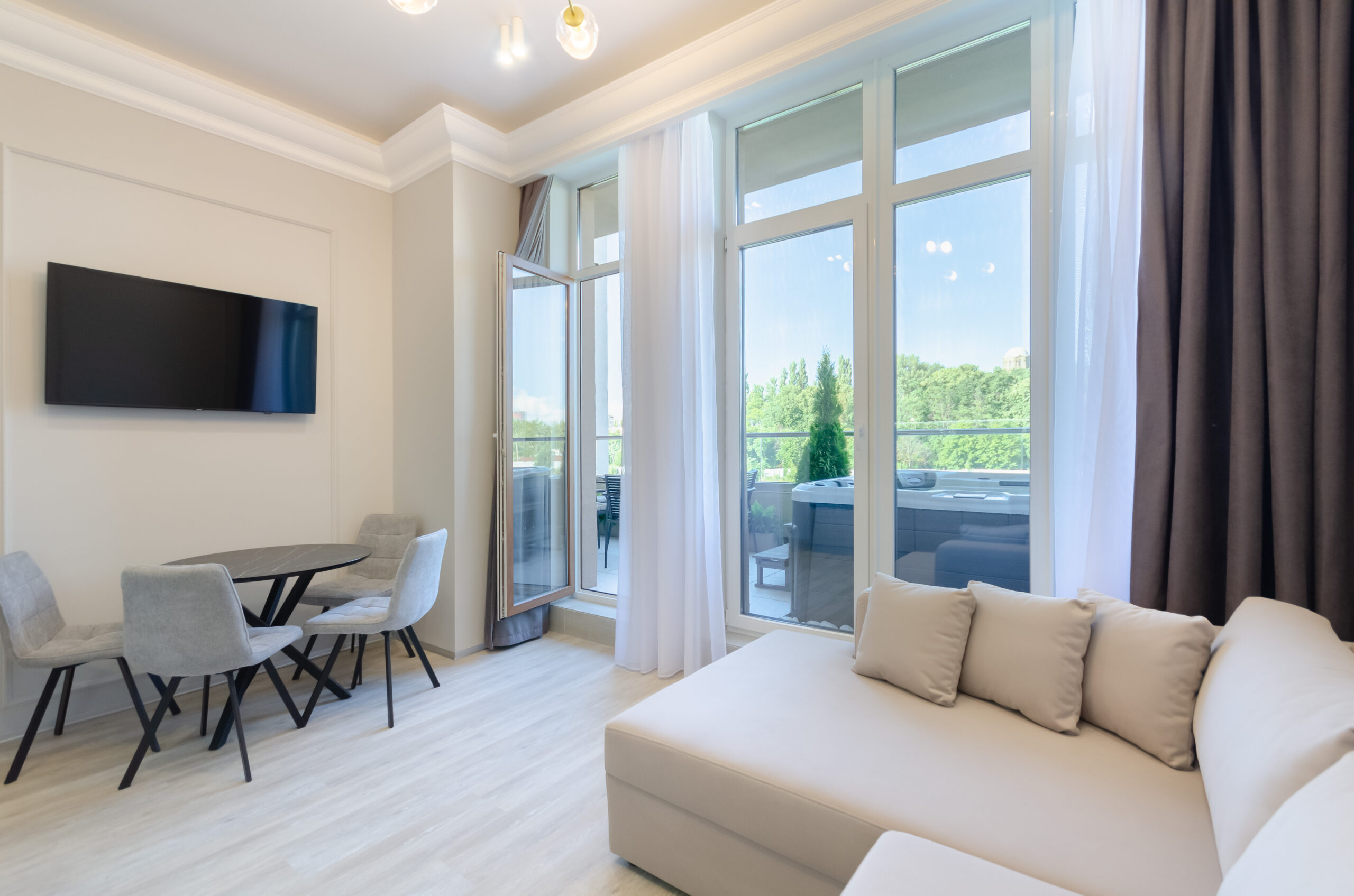 *Living room (divided into zones, including kitchen): sofa bed 160*200 cm, flat screen Smart TV, air conditioning.