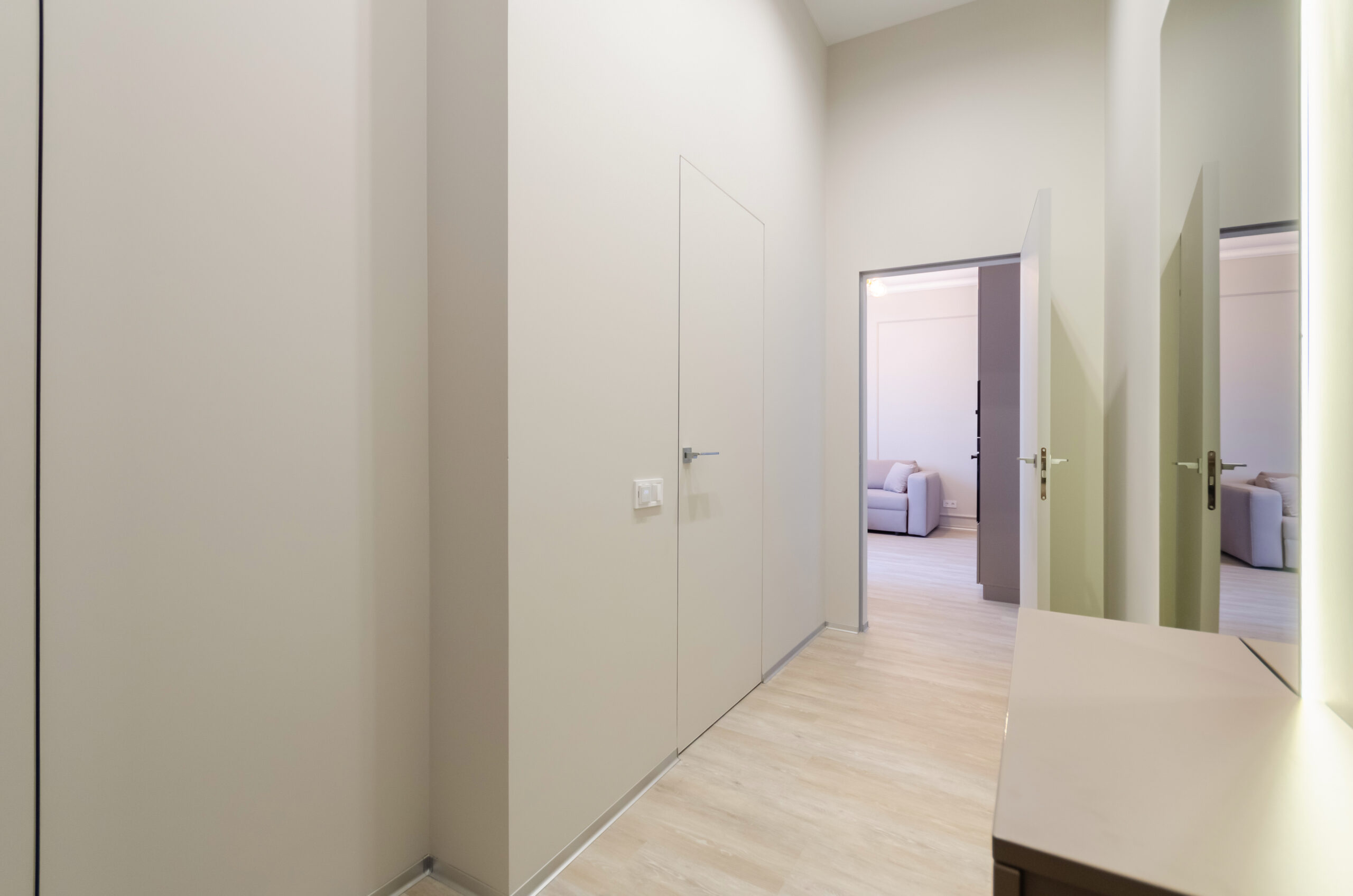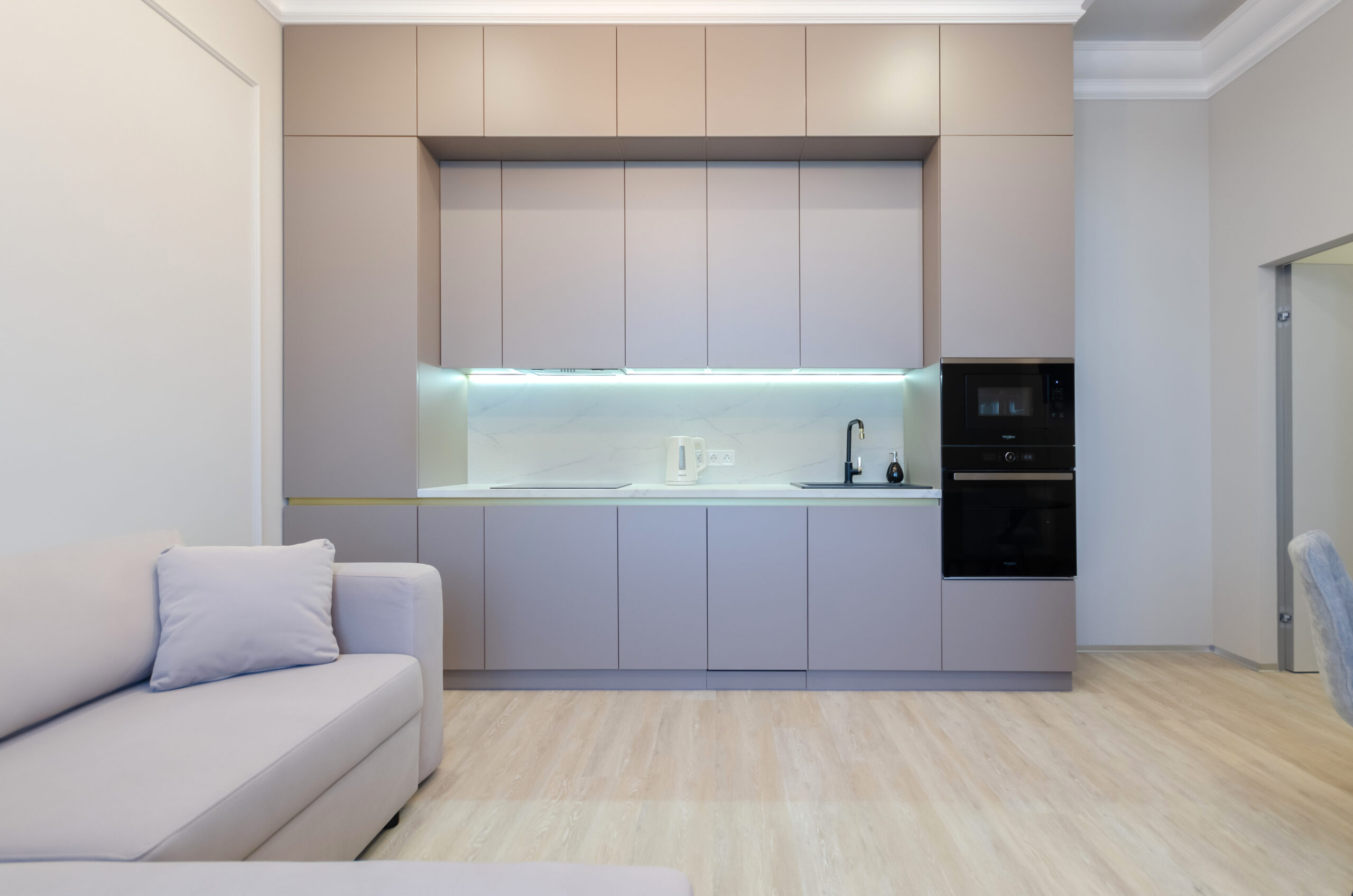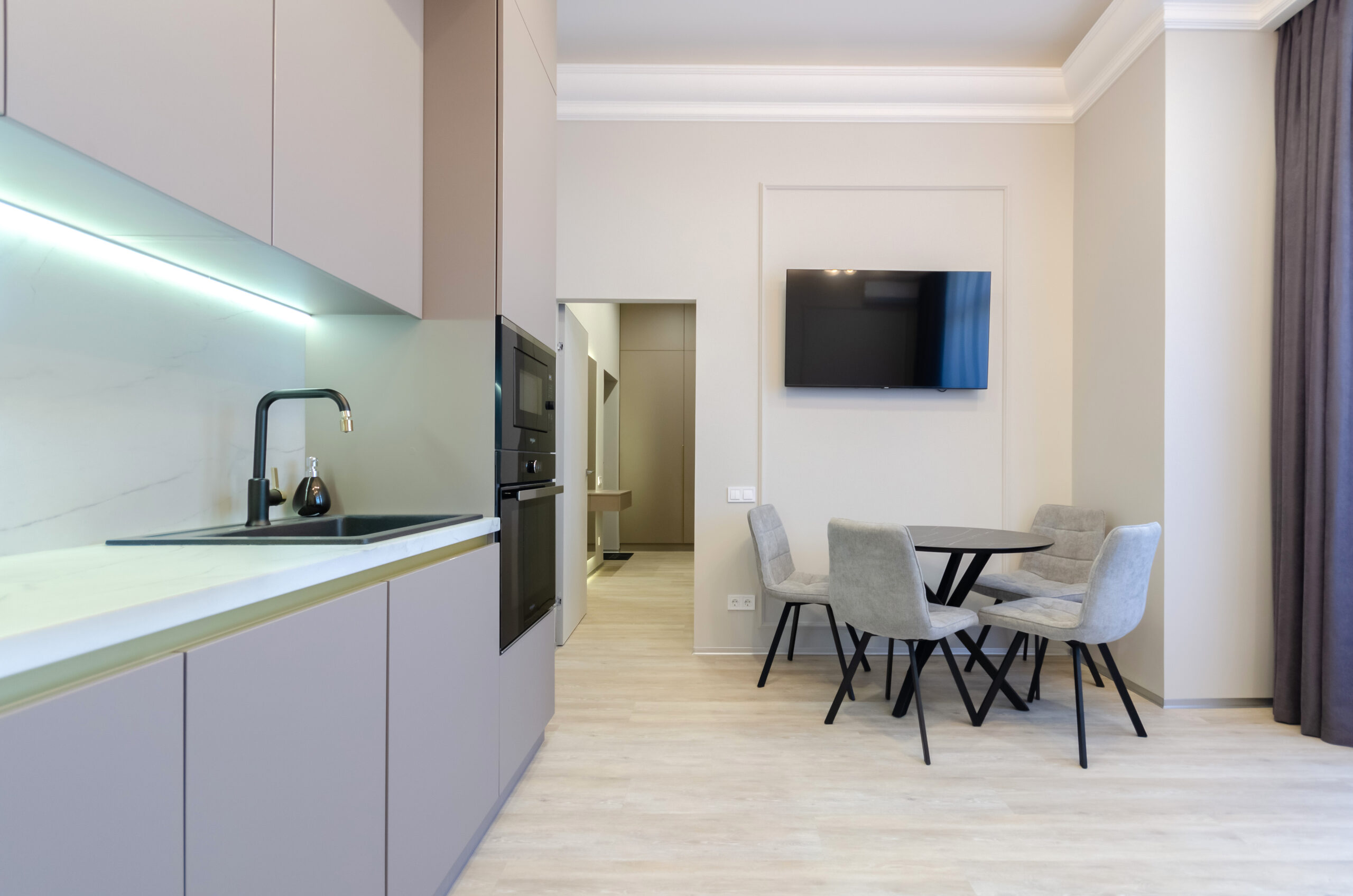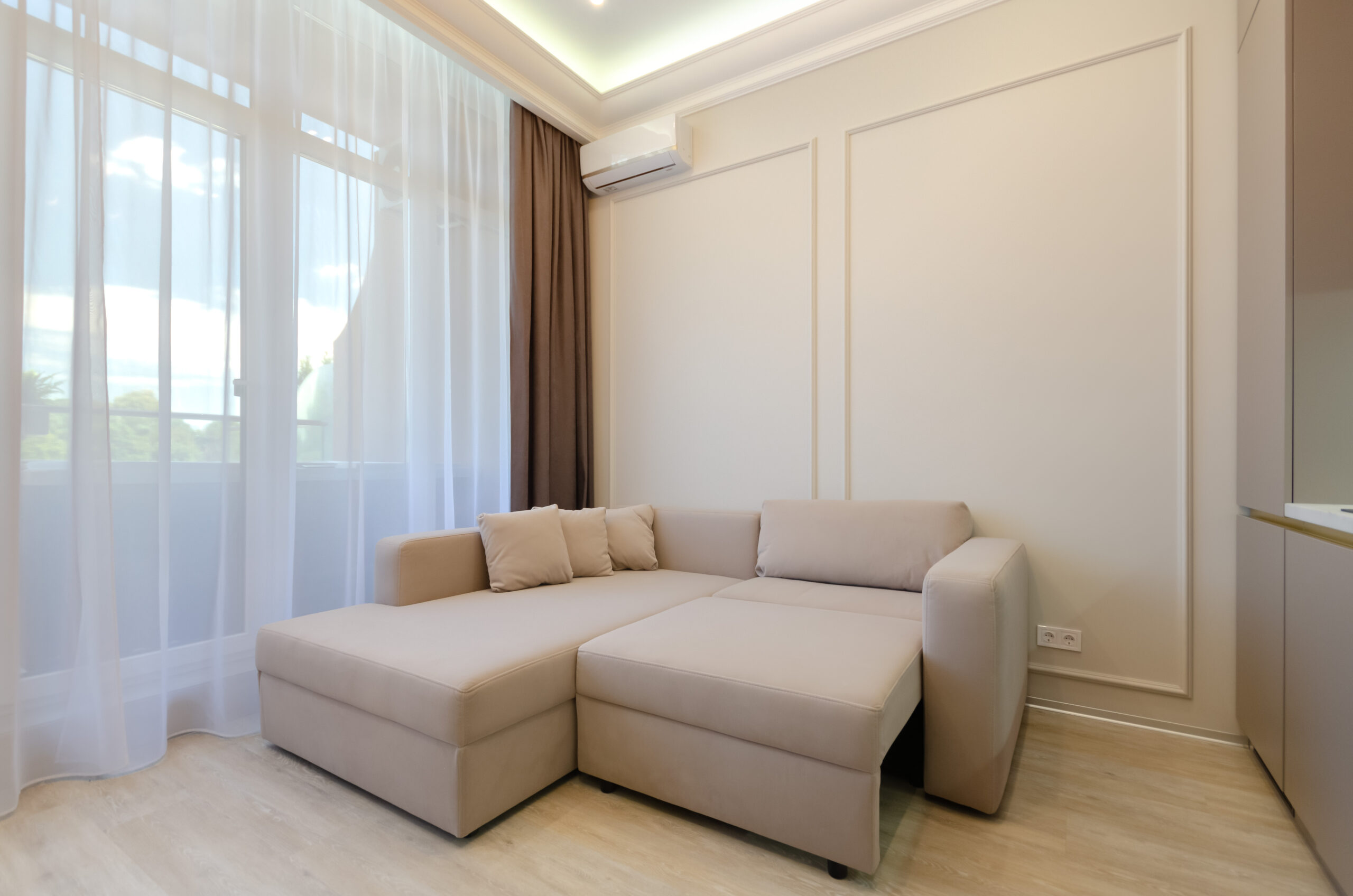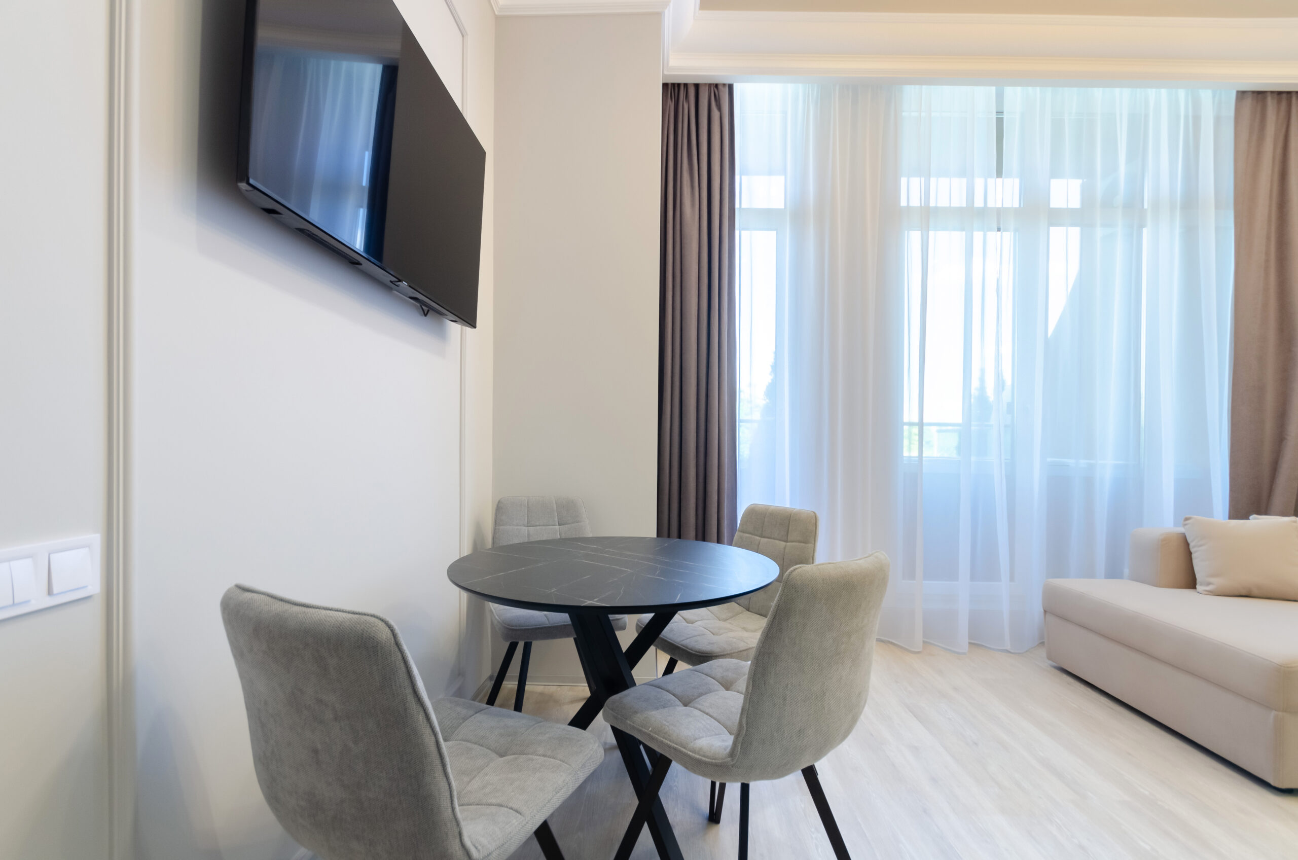 *Living room (divided into zones, including kitchen): sofa bed 160*200 cm, flat screen Smart TV, air conditioning.
