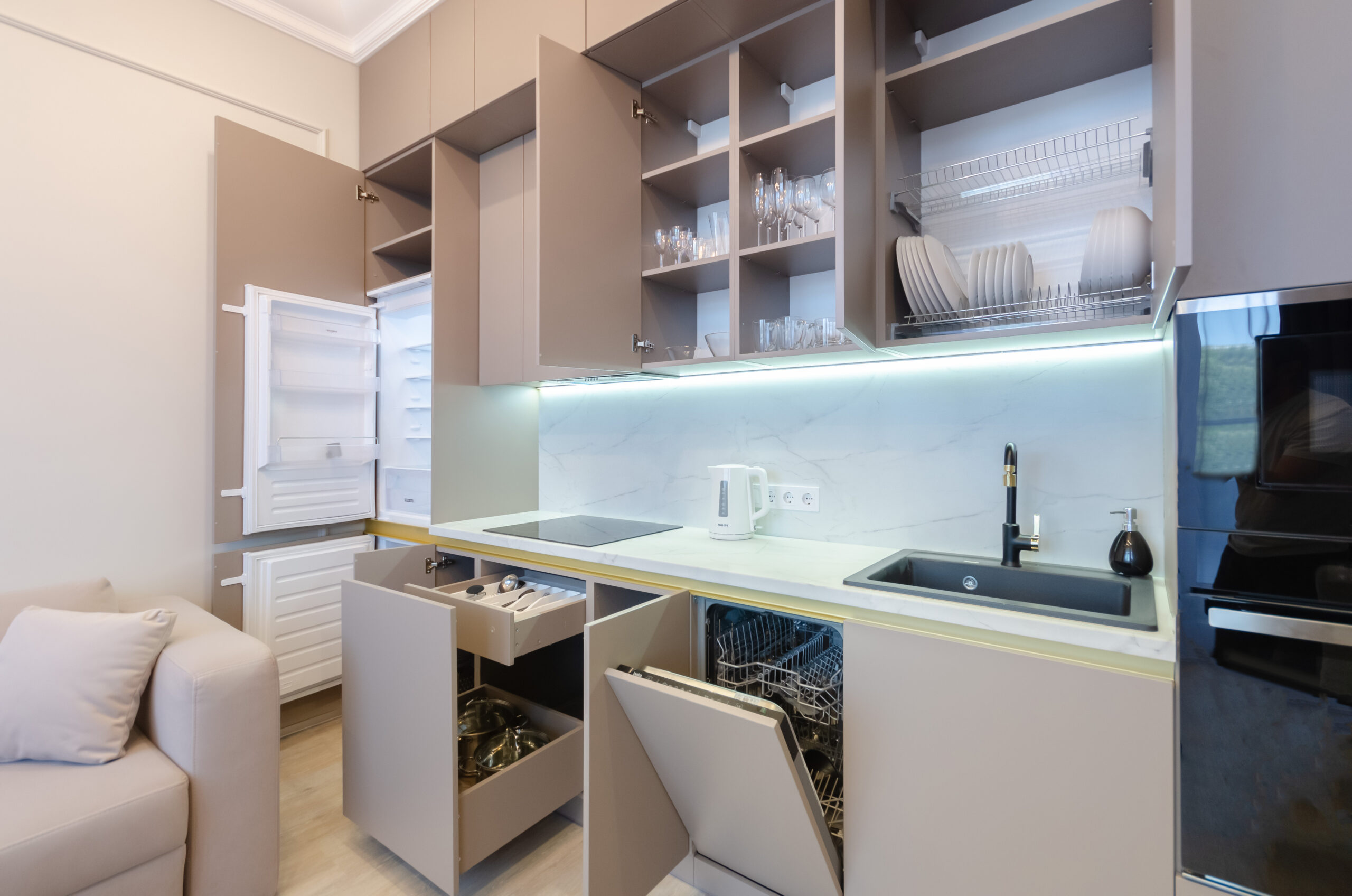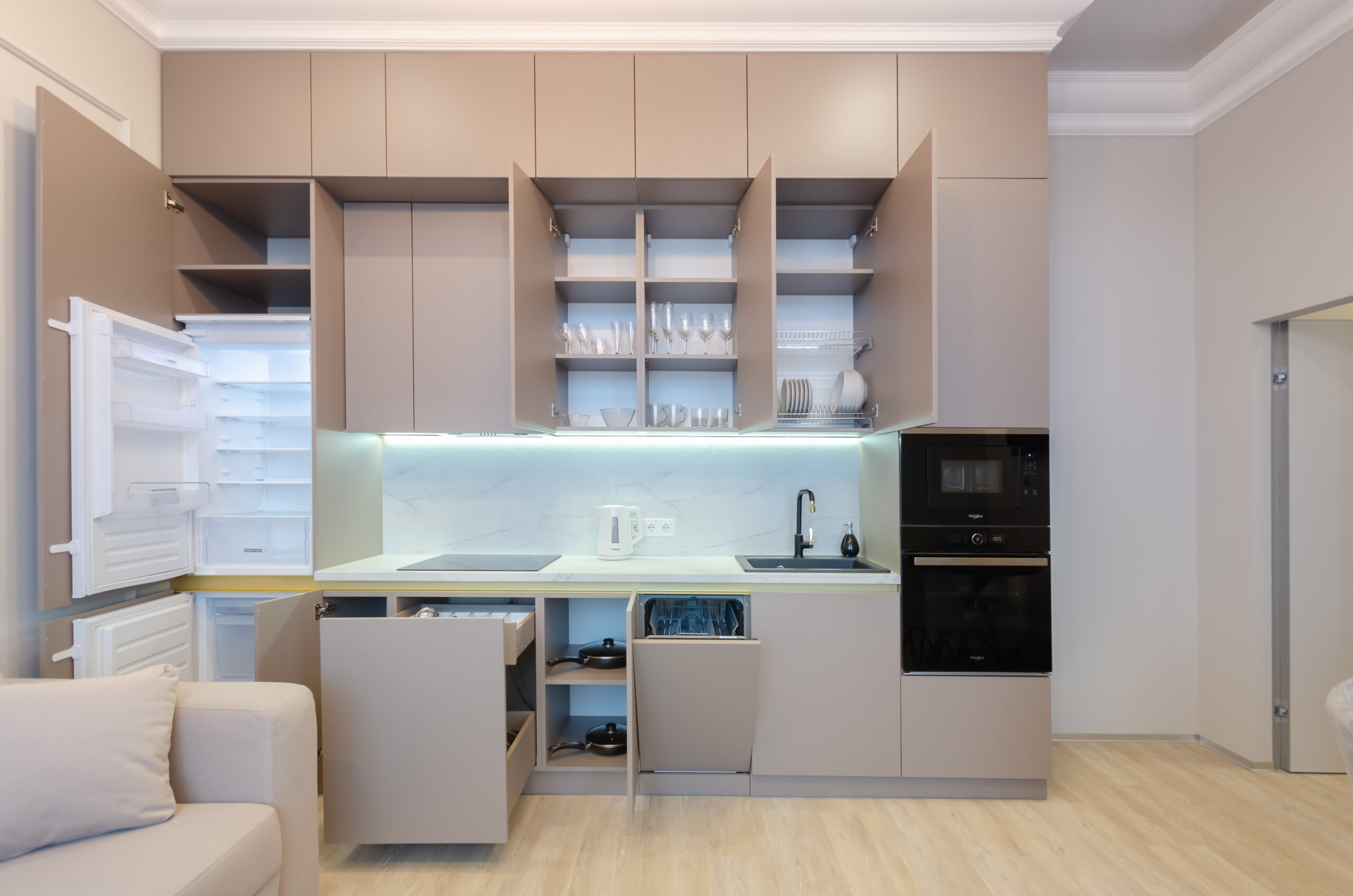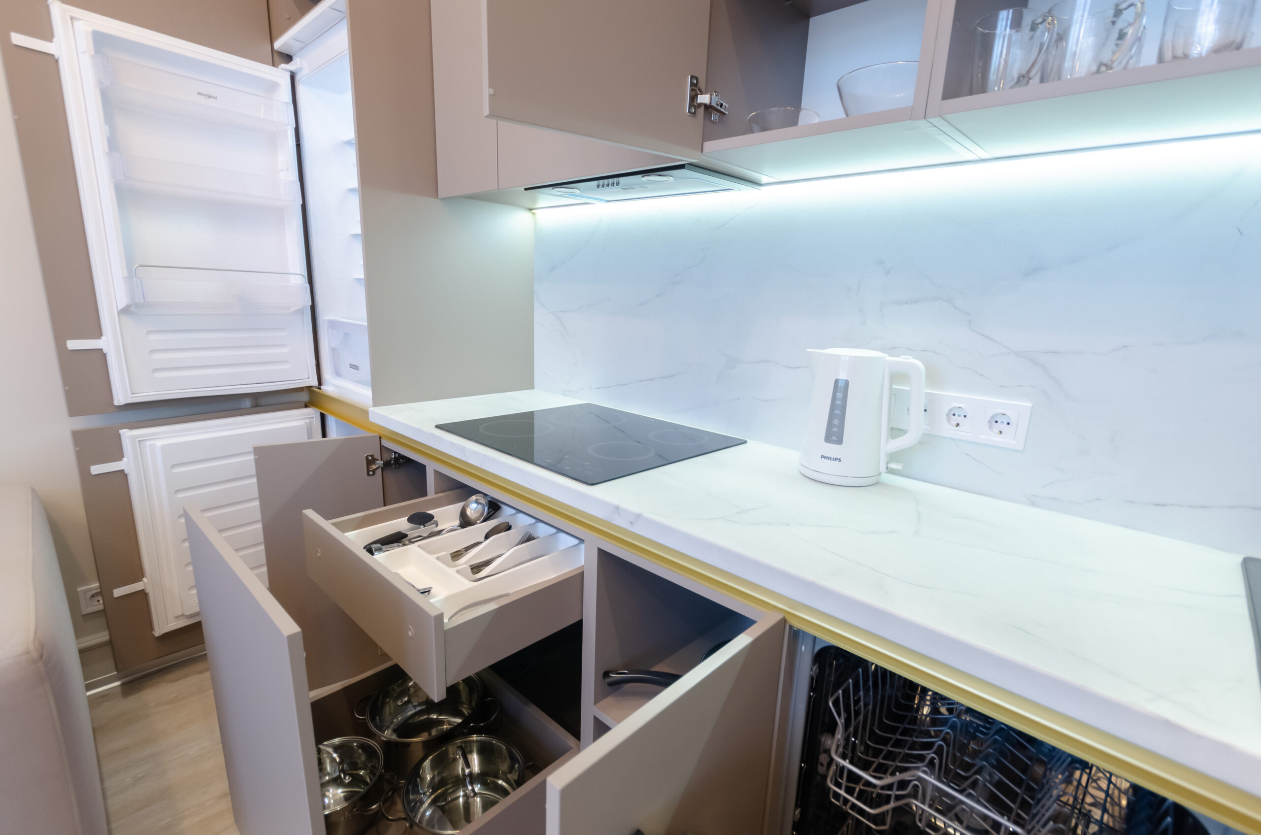 *Fully equipped kitchen (located in the living room): refrigerator, microwave, kettle, electric stove, oven, dishwasher, pots, pans, dining table and all the necessary utensils: plates, cups, glasses.