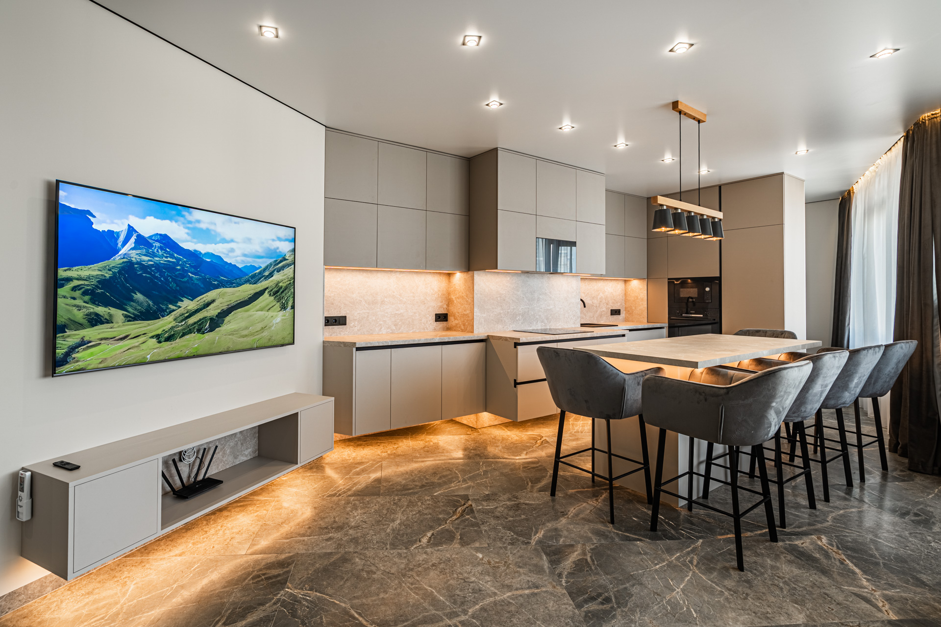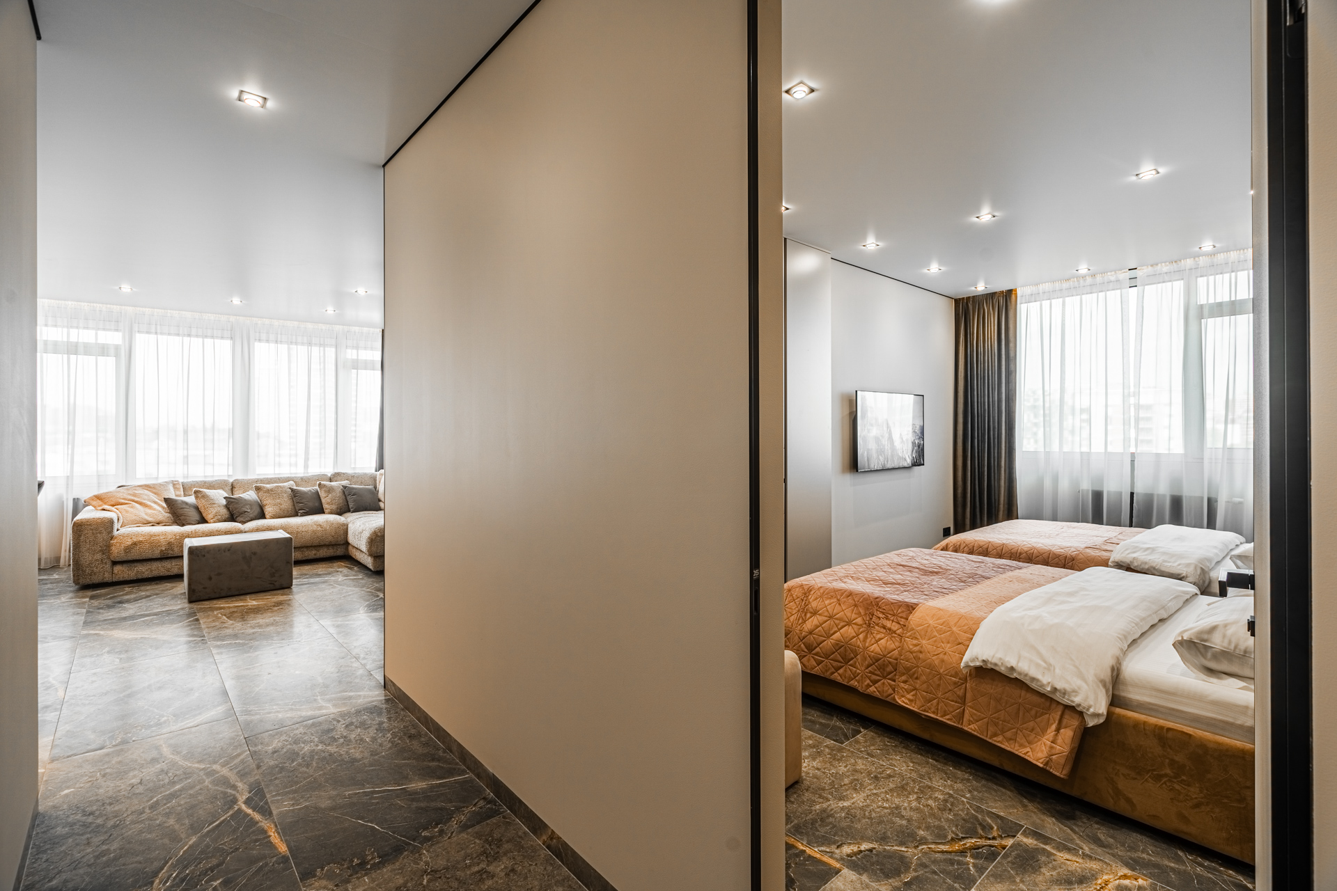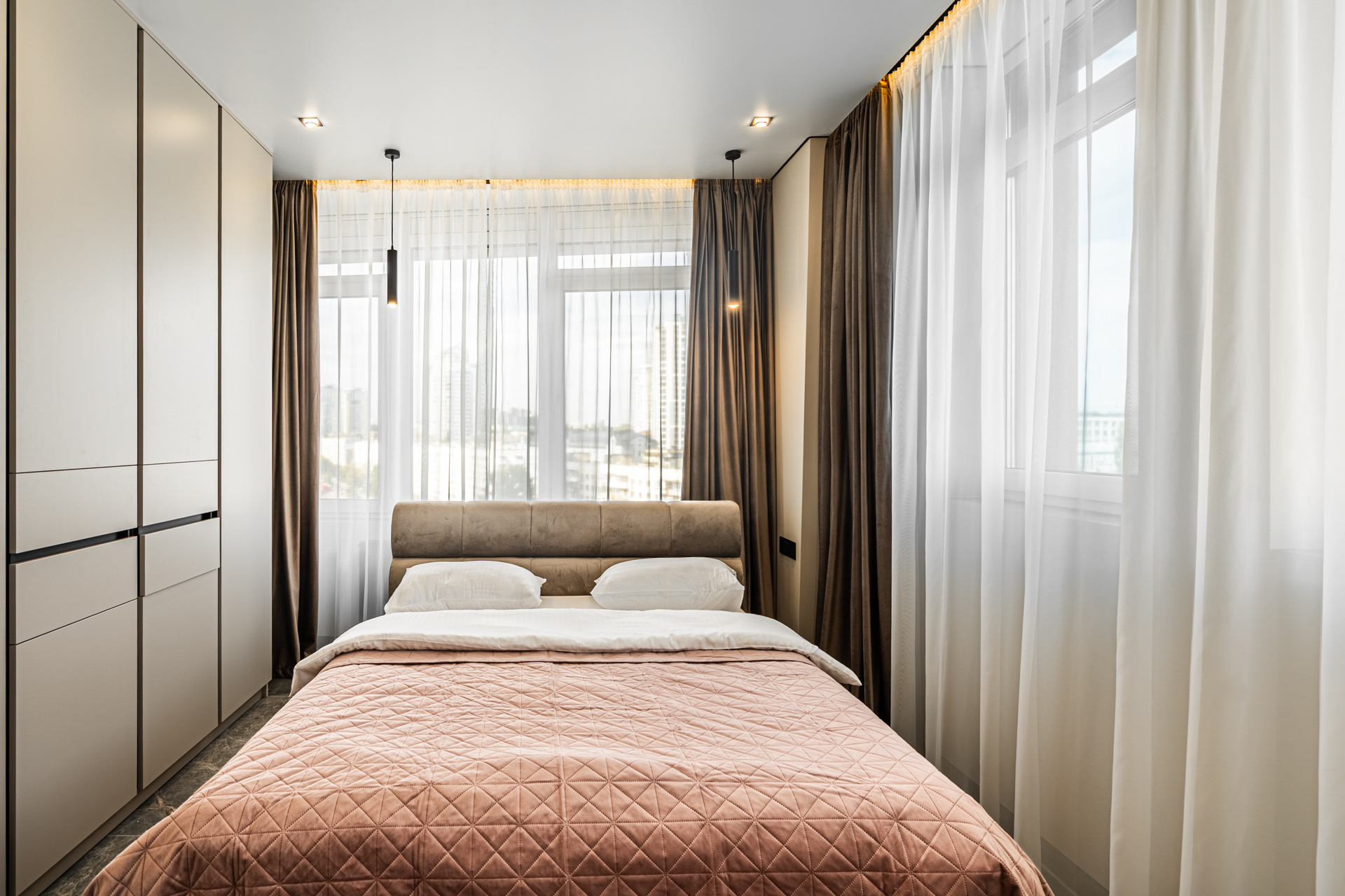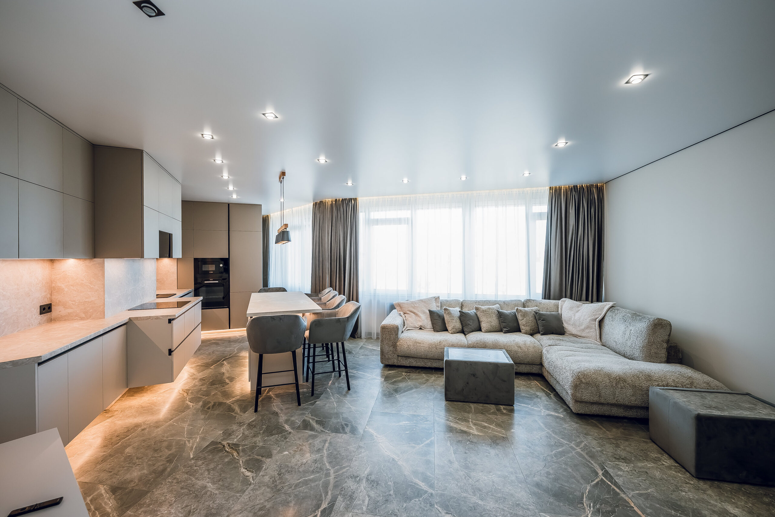 Квартира розташована на 13-му поверсі та має захопливий панорамний вид на Київ. Просторий інтер’єр виконаний у сучасному стилі з продуманим плануванням, що створює затишну та комфортну атмосферу. Квартира повністю оснащена всім необхідним для тривалого й зручного проживання.