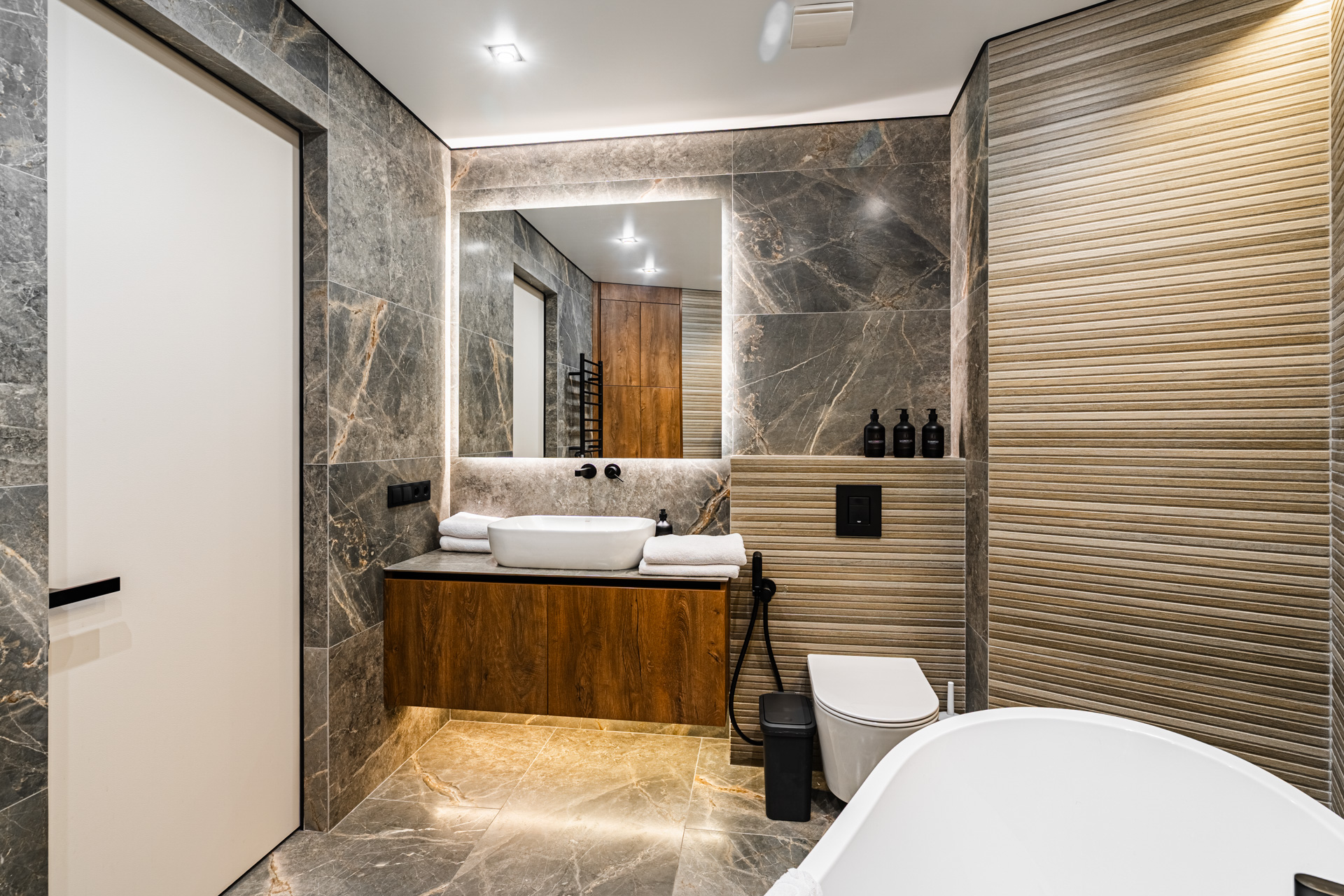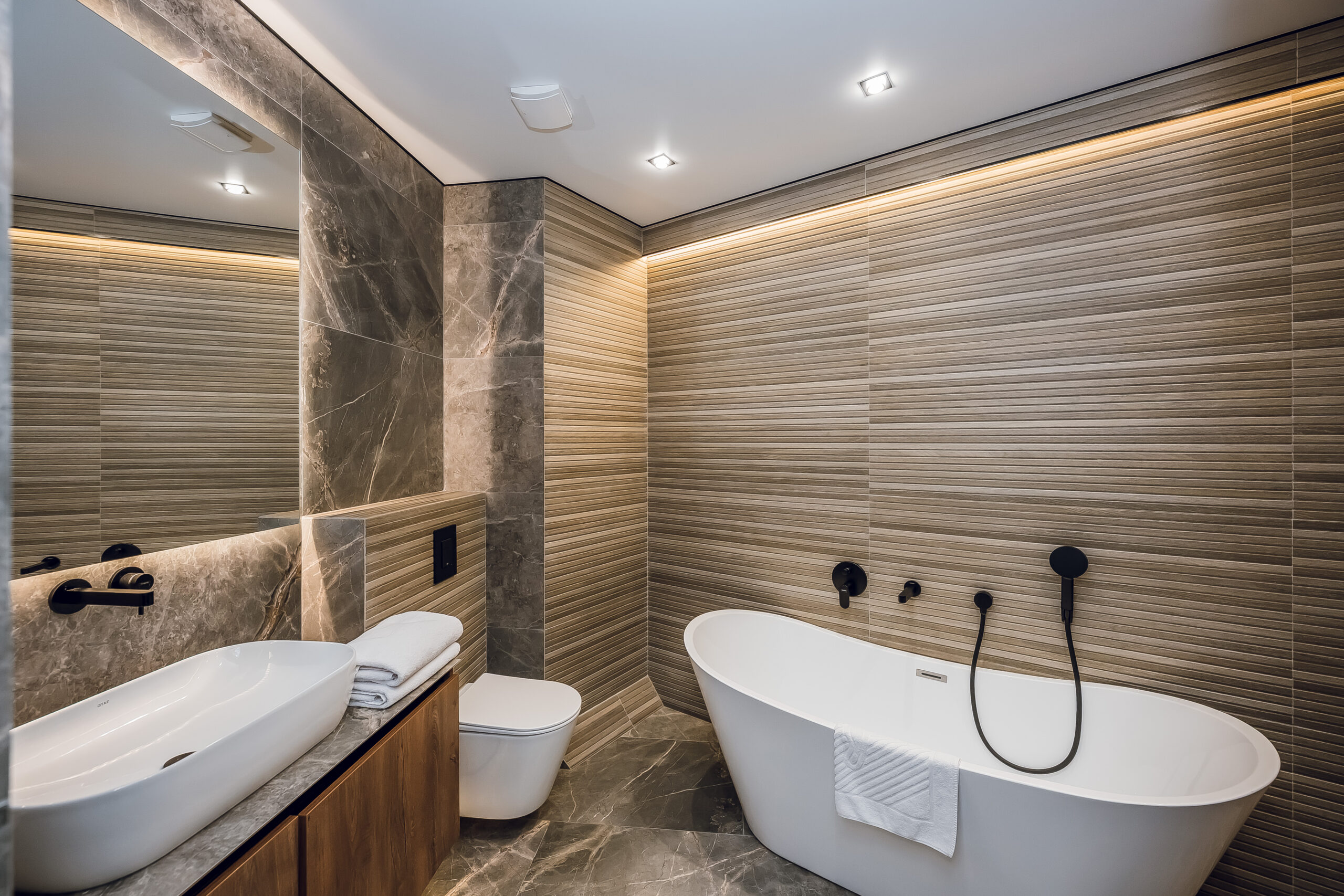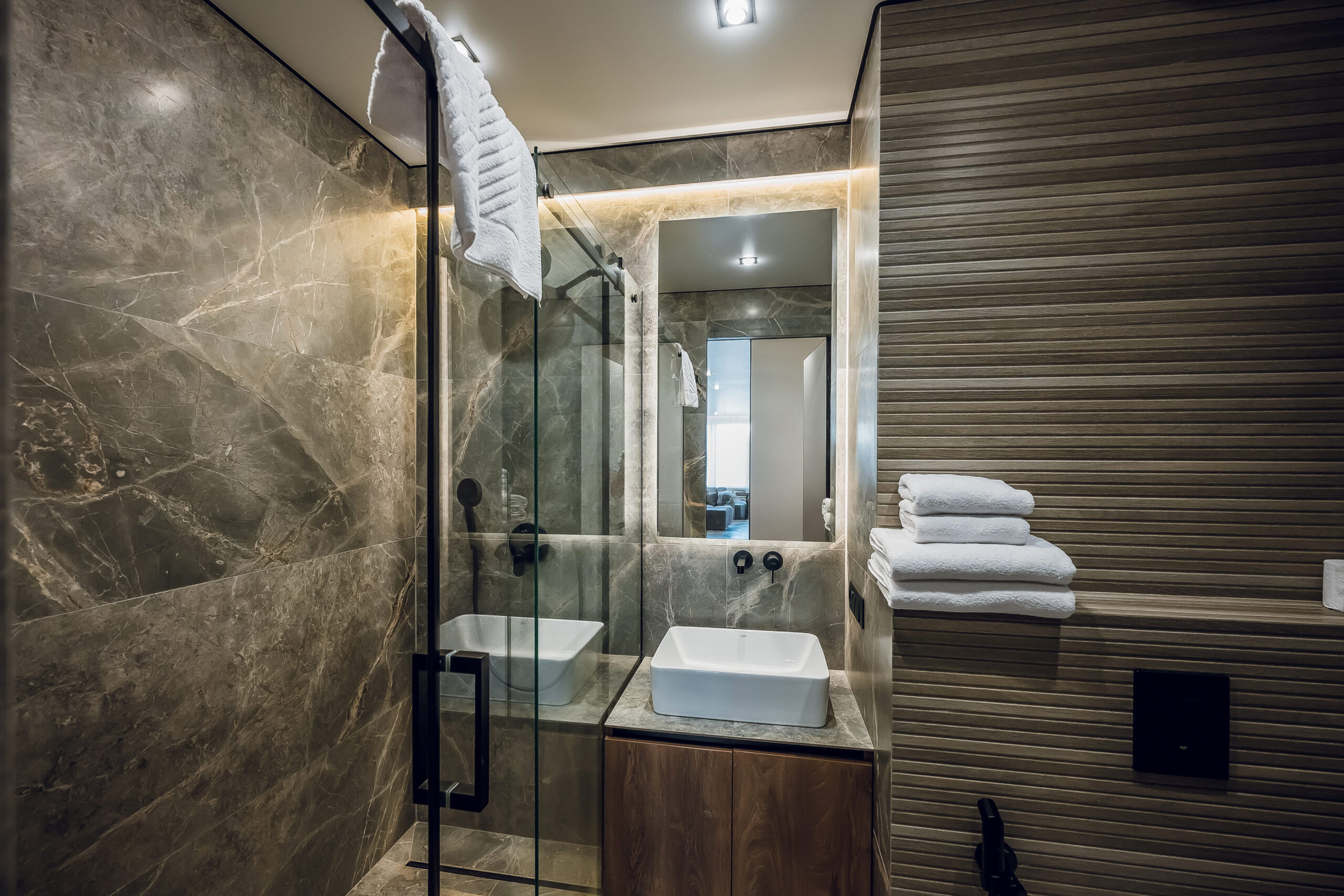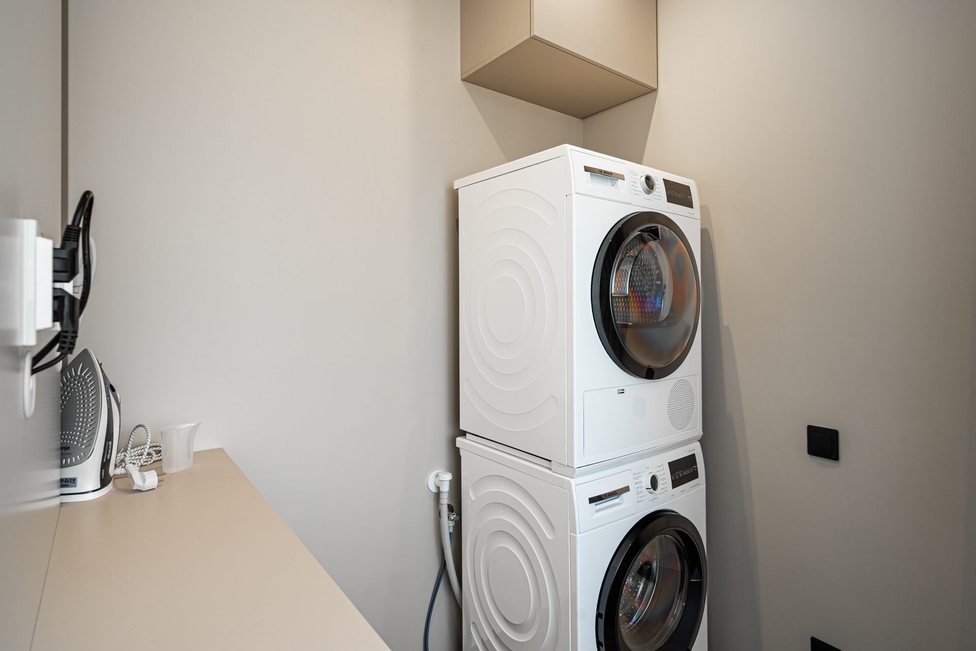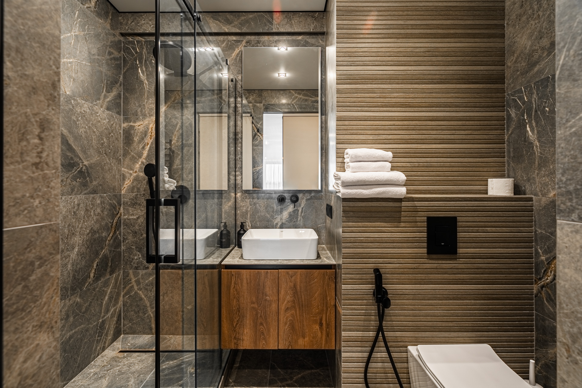 Ванні кімнати: у квартирі є дві сучасні ванні кімнати. Кожна оснащена душовою кабіною, феном, рушниками та всіма необхідними туалетними засобами для вашого комфорту. В одній із ванних кімнат також є ванна, що робить проживання ще зручнішим і приємнішим.