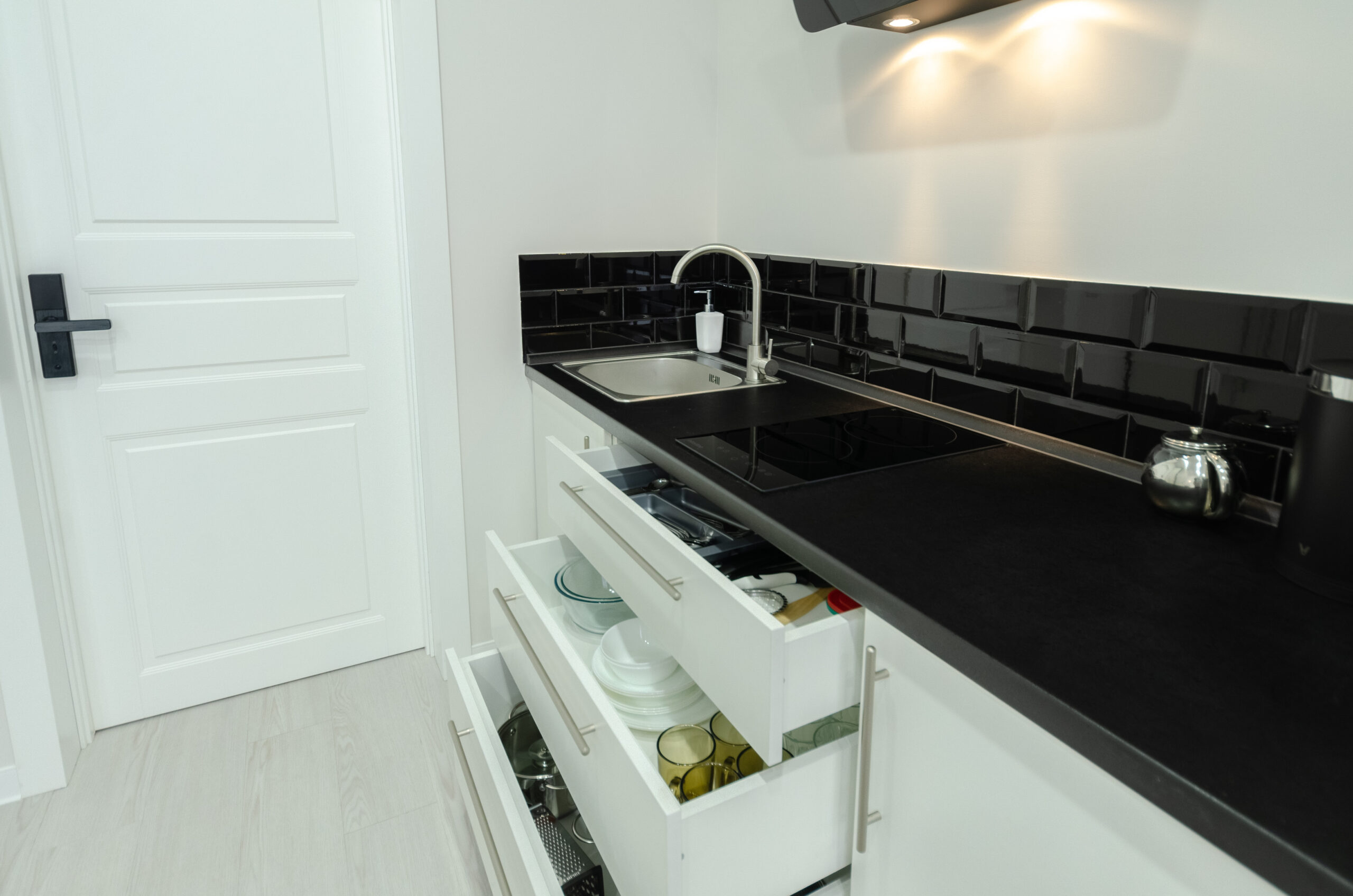 – living room (divided into zones, includes kitchen): bed 160*200 cm, flat screen TV, Smart-TV, air conditioner, kitchen (refrigerator, microwave oven, kettle, electric stove, oven, pots, pans, all necessary dishes, cups, glasses, glasses, dining table).