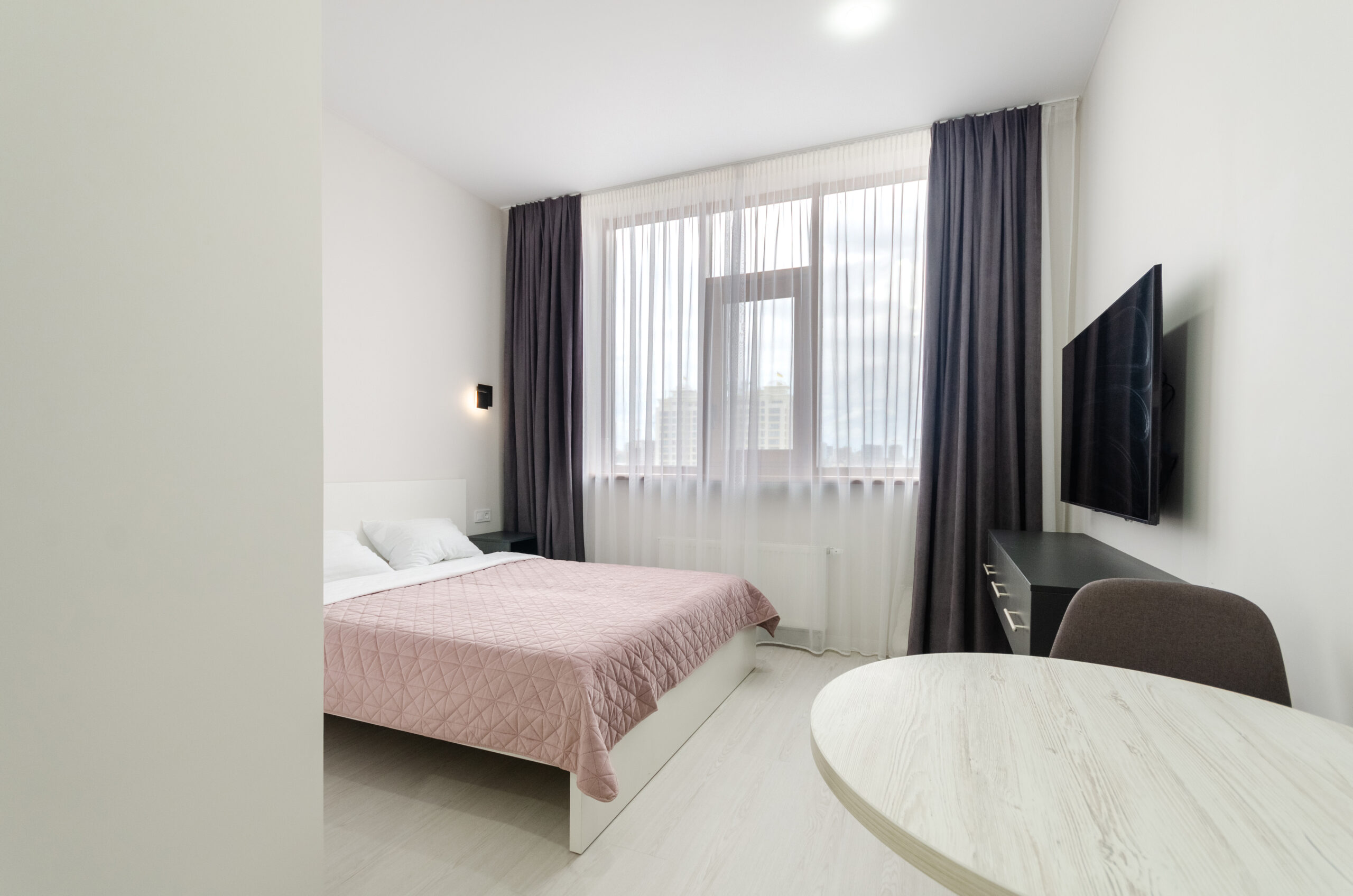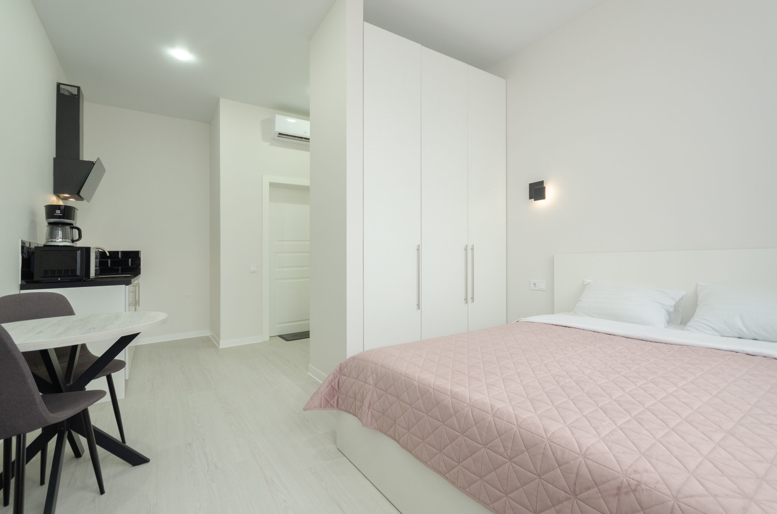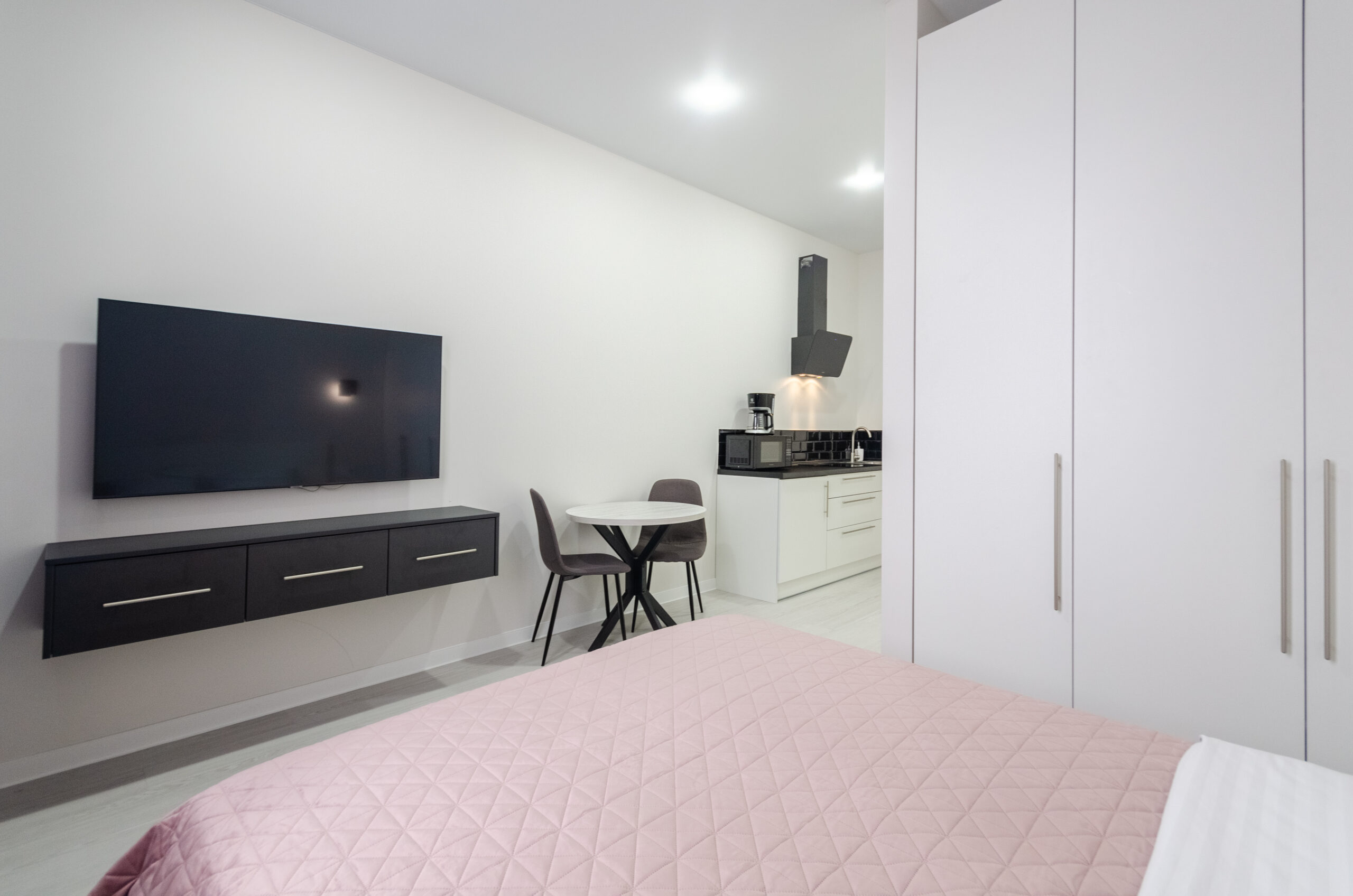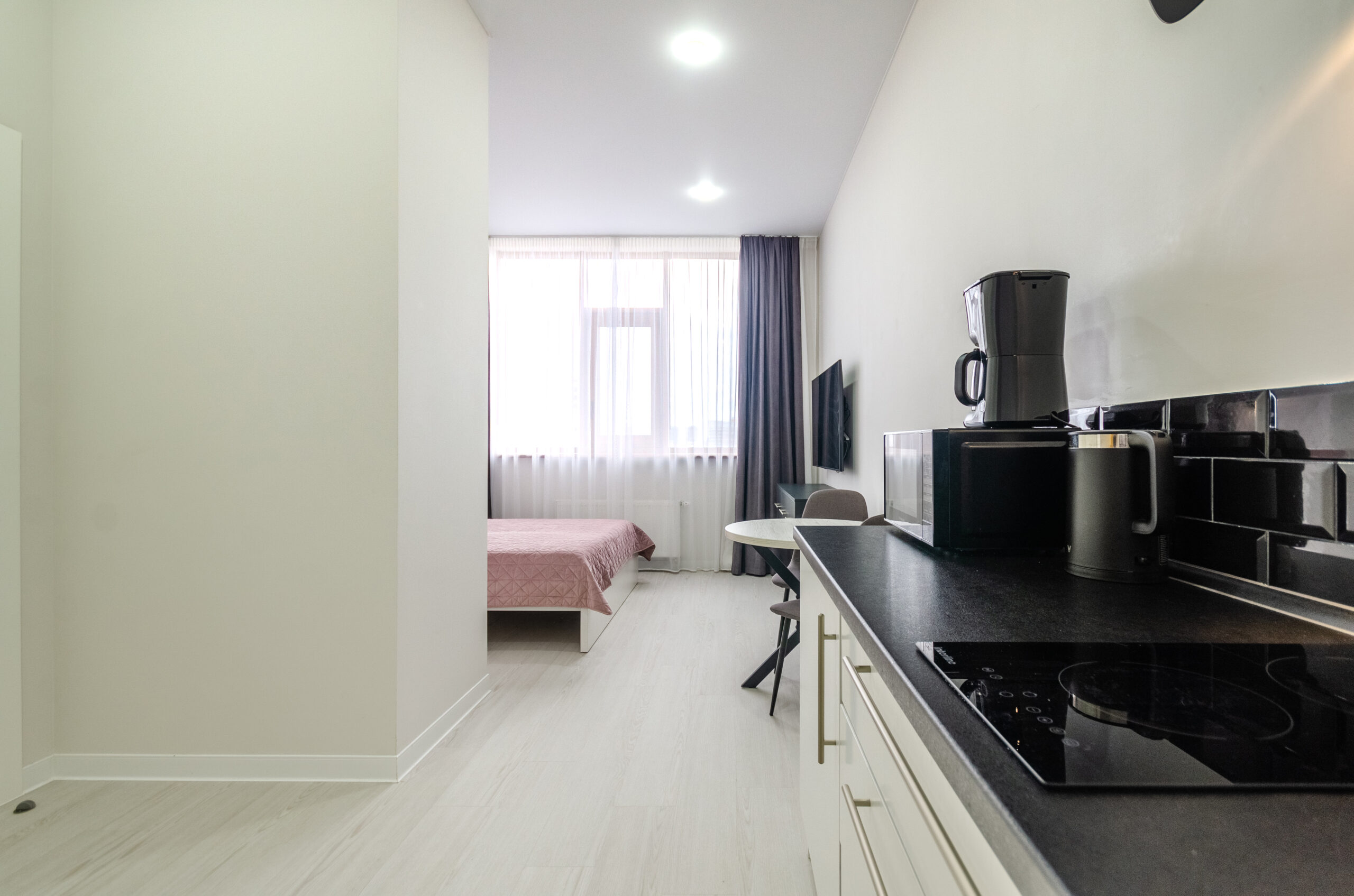 – living room (divided into zones, includes kitchen): bed 160*200 cm, flat screen TV, Smart-TV, air conditioner, kitchen (refrigerator, microwave oven, kettle, electric stove, oven, pots, pans, all necessary dishes, cups, glasses, glasses, dining table).