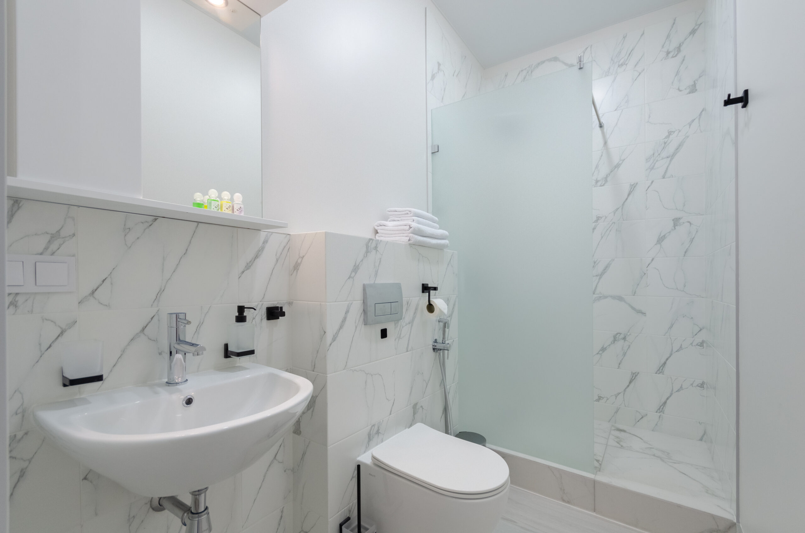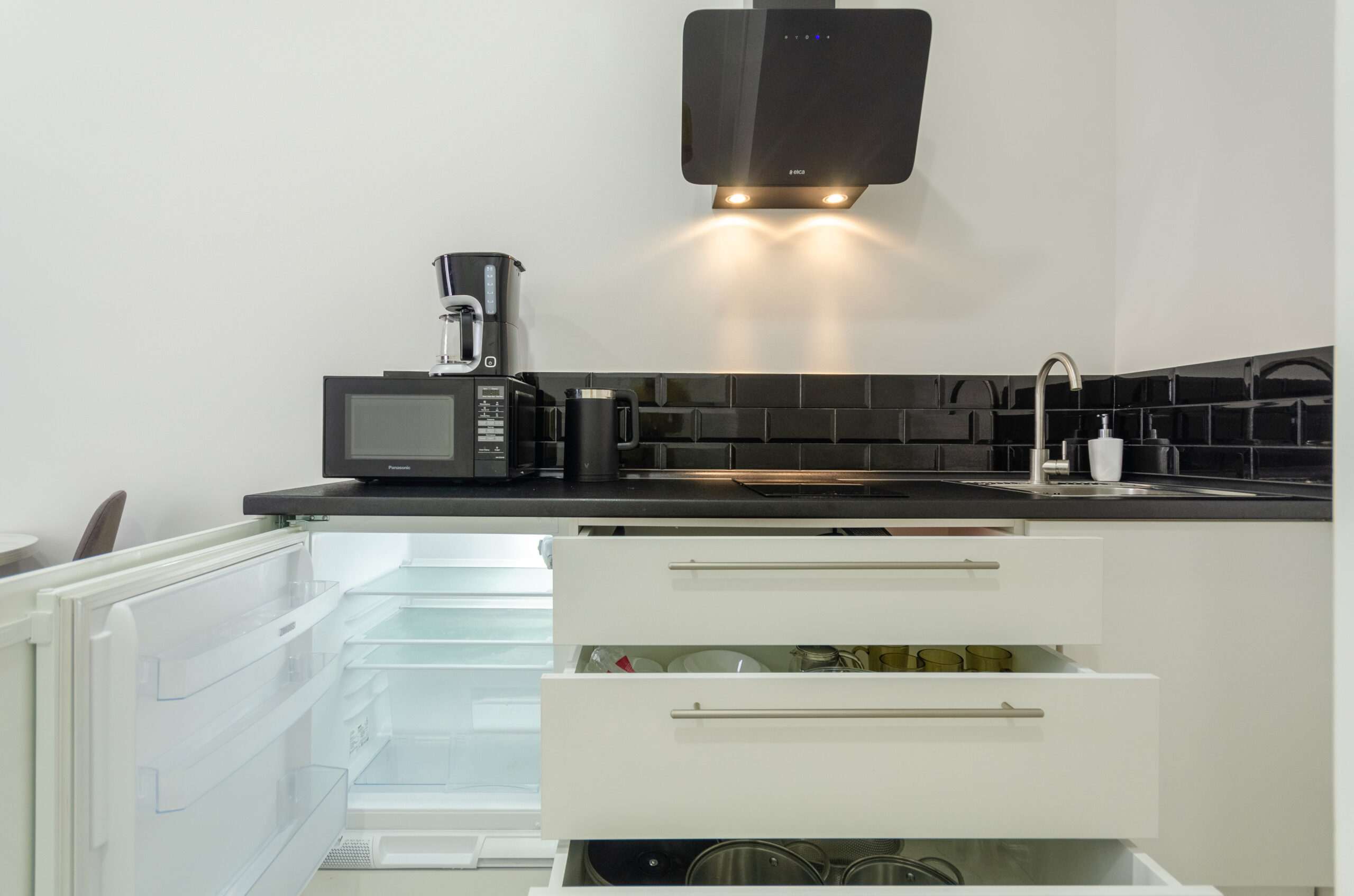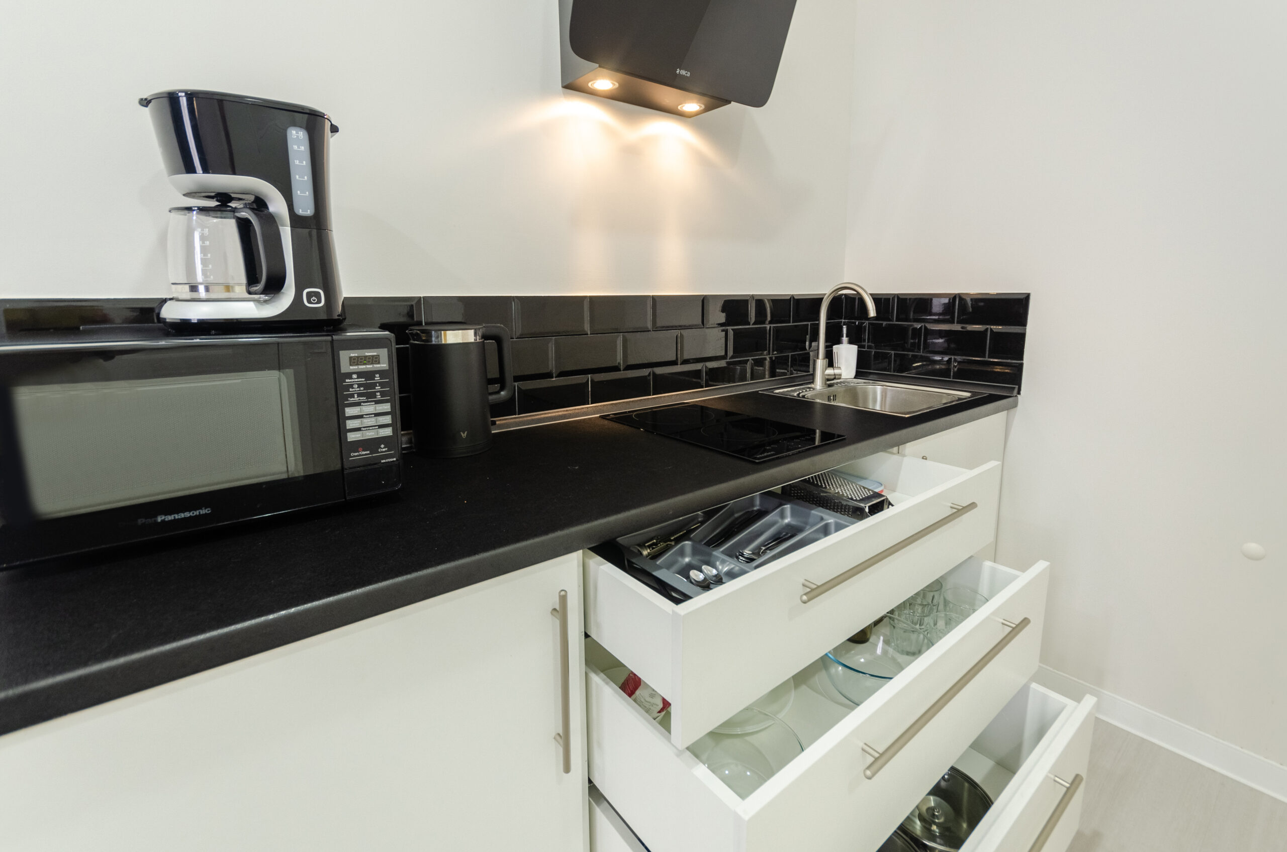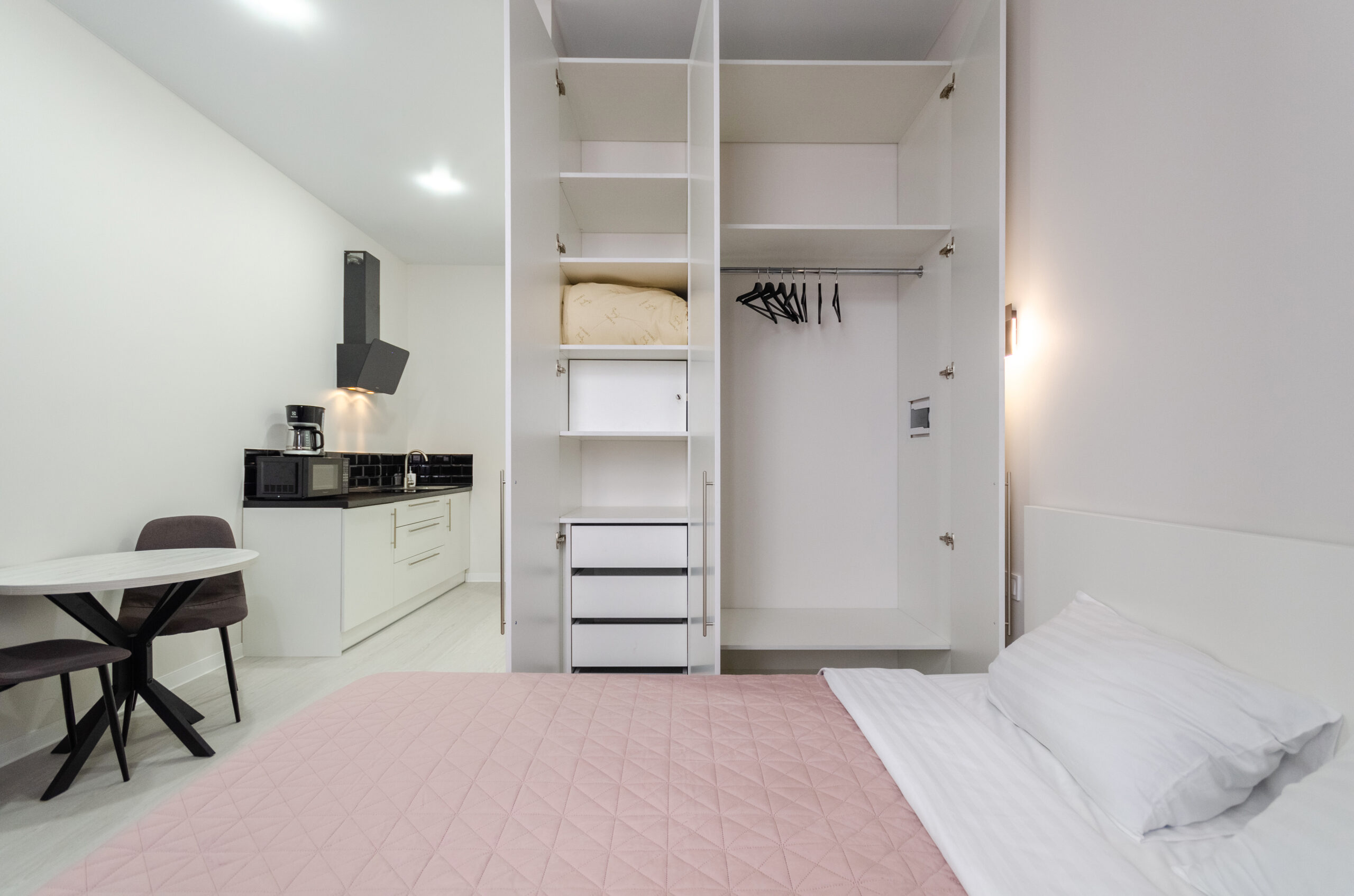 – living room (divided into zones, includes kitchen): bed 160*200 cm, flat screen TV, Smart-TV, air conditioner, kitchen (refrigerator, microwave oven, kettle, electric stove, oven, pots, pans, all necessary dishes, cups, glasses, glasses, dining table).