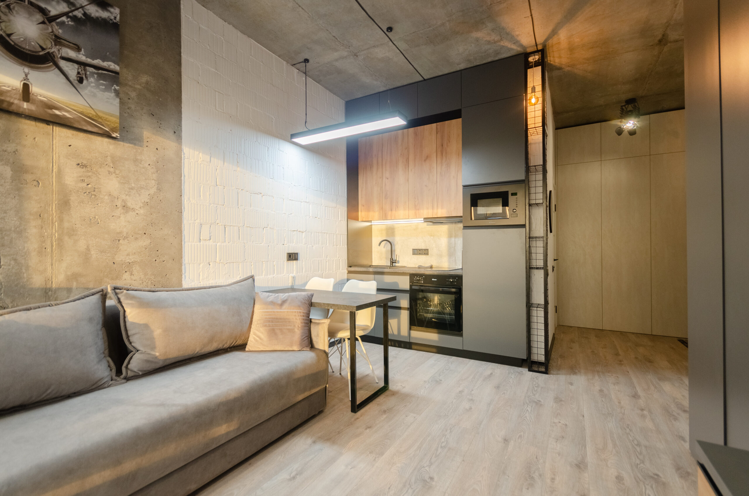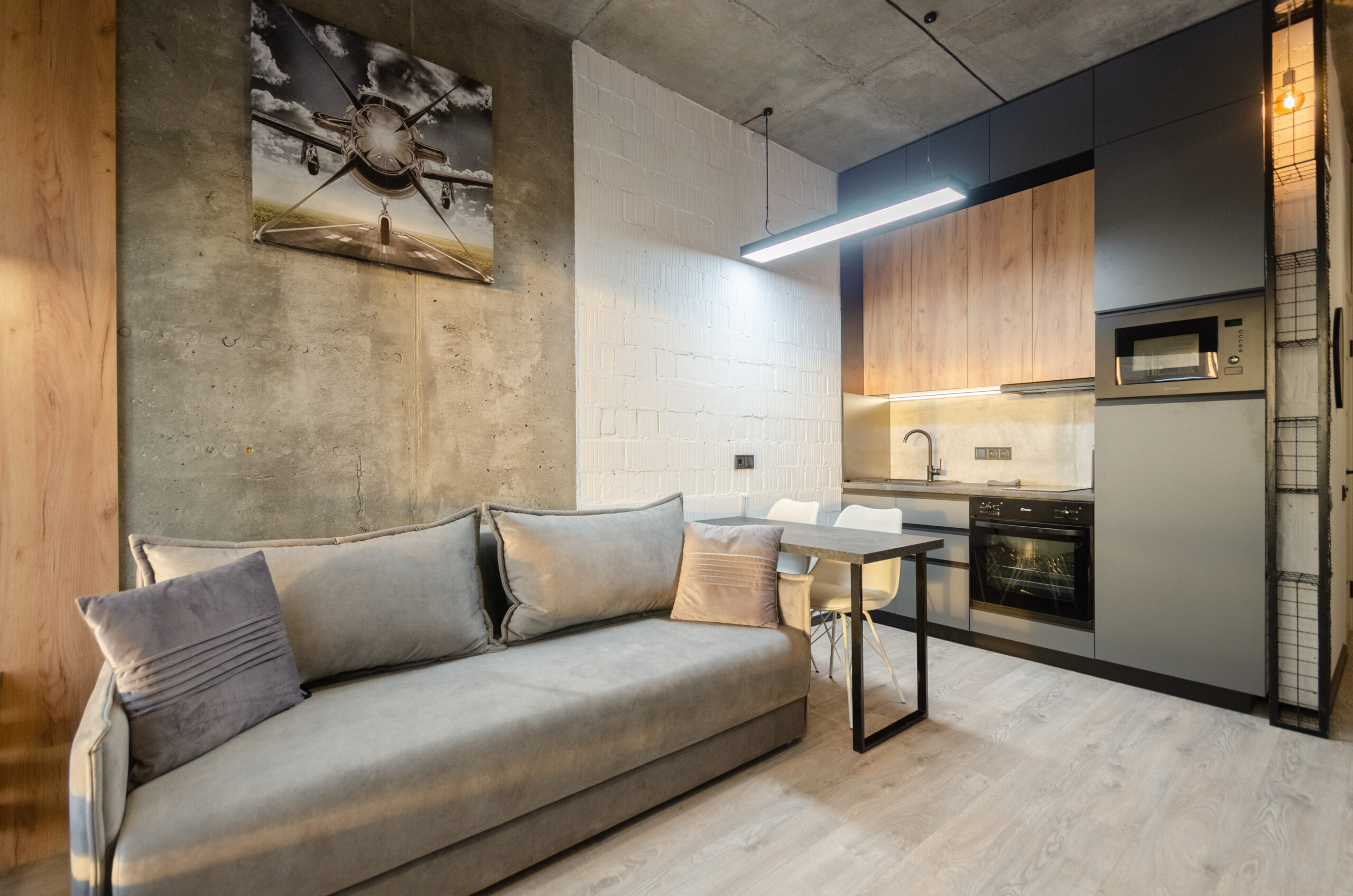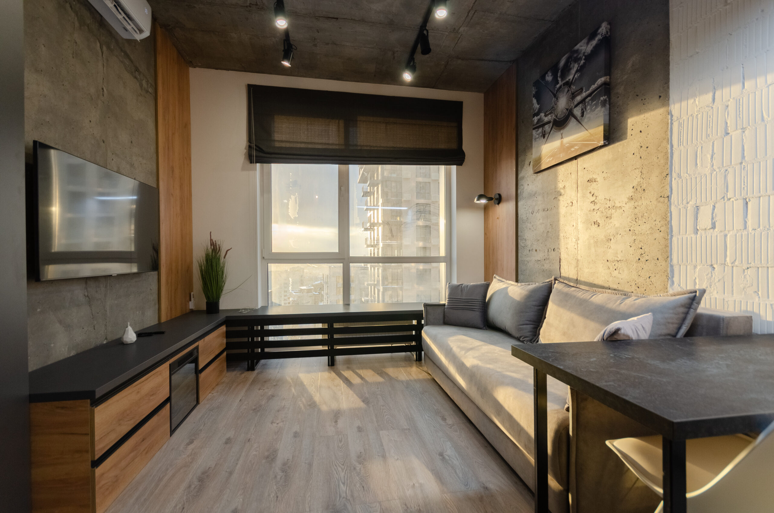 The apartment is located on the 12th floor with an area of 25 m2, designed for 2 guests, has a living room-kitchen with a panoramic view of Kyiv and a bathroom.