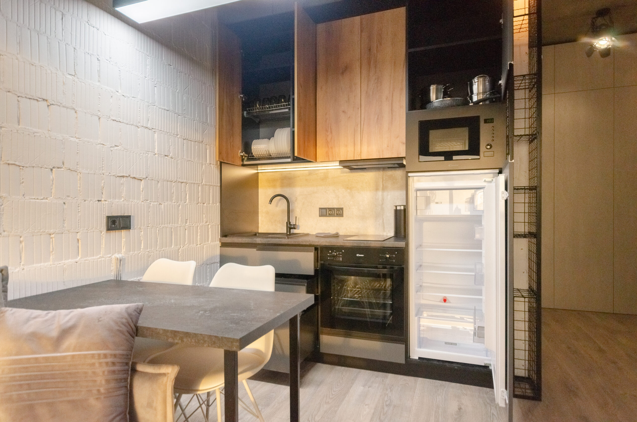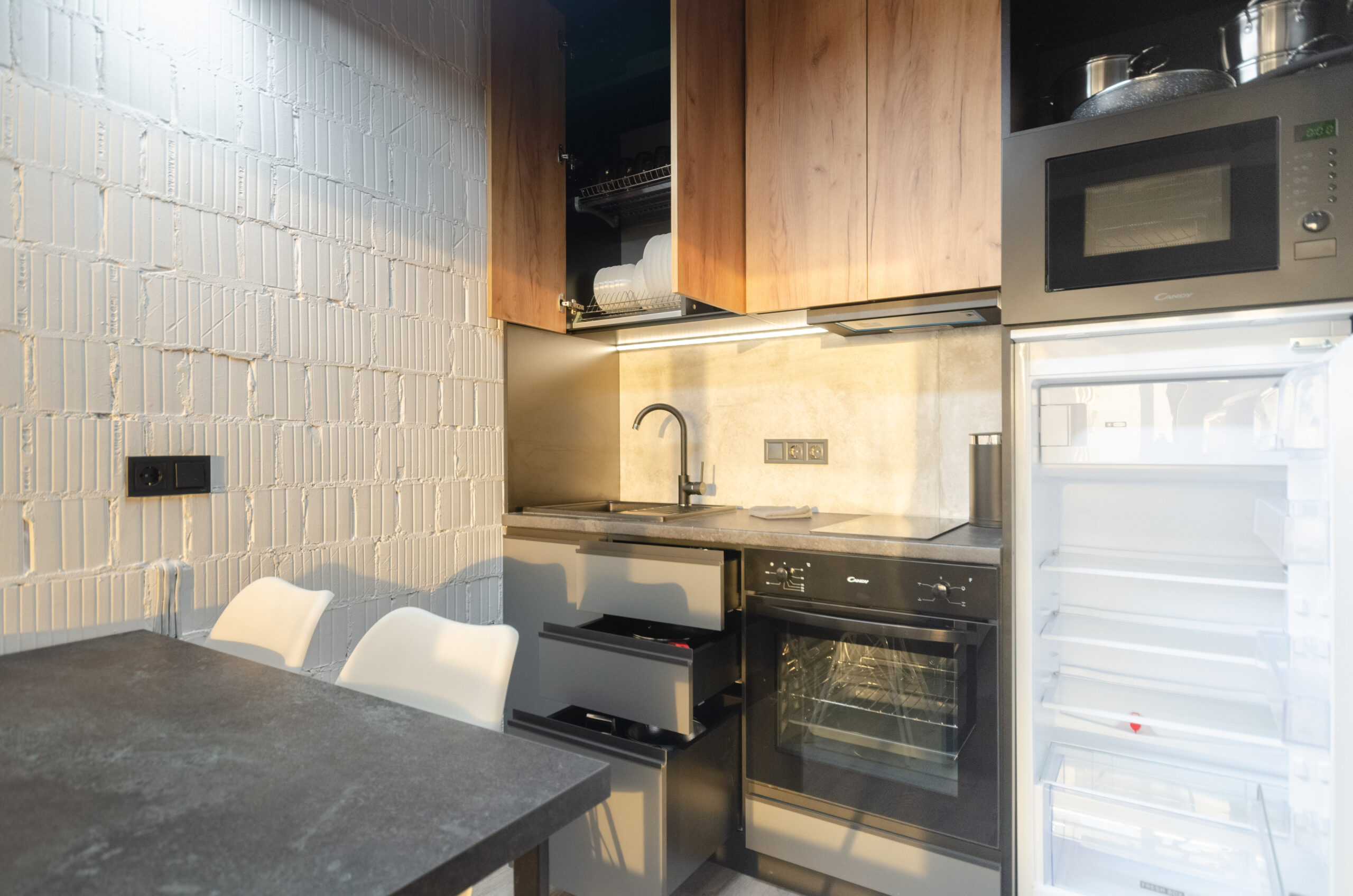 The apartment has bedding, all the necessary dishes, small household appliances – everything for a comfortable stay for any period.