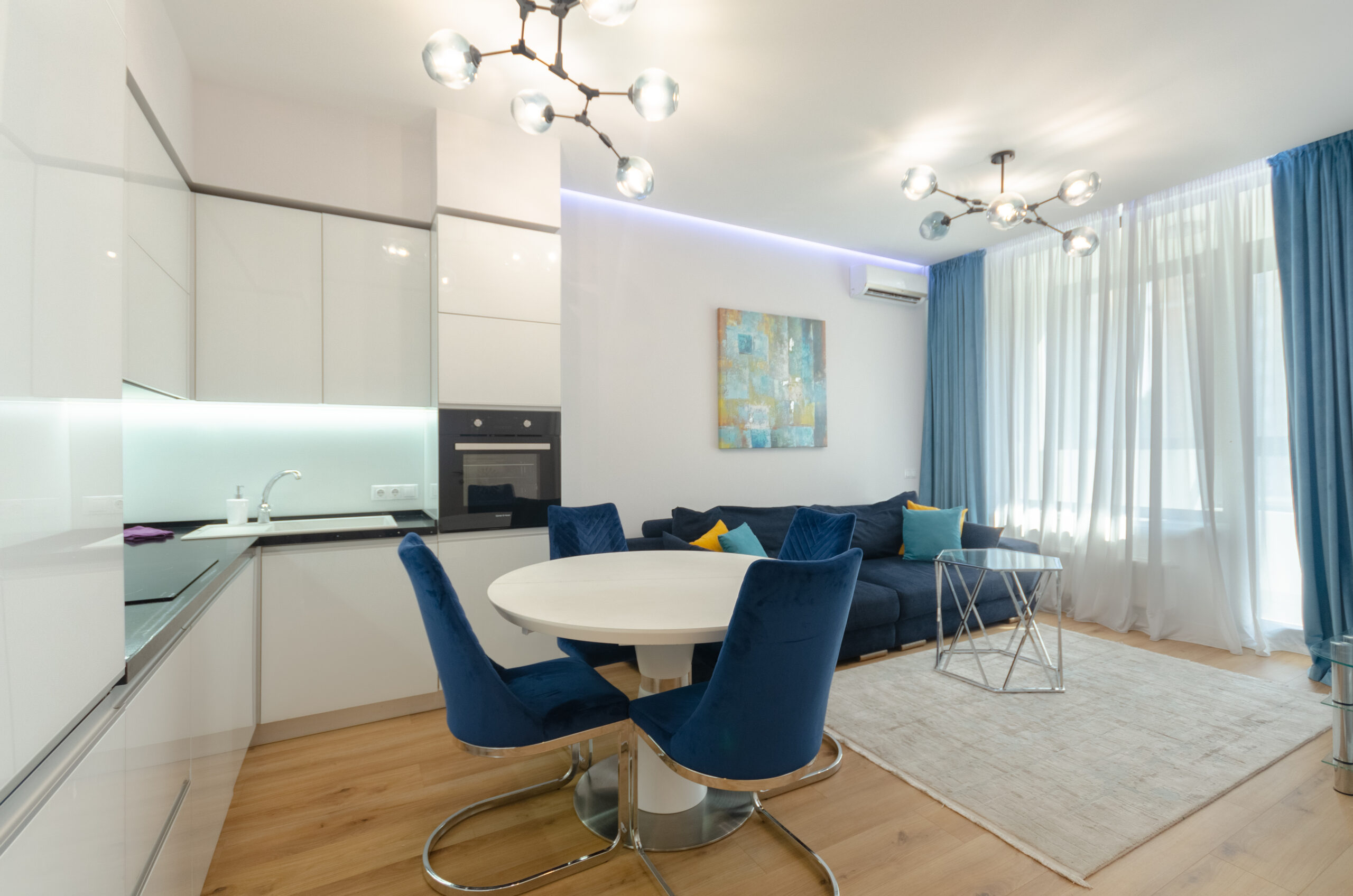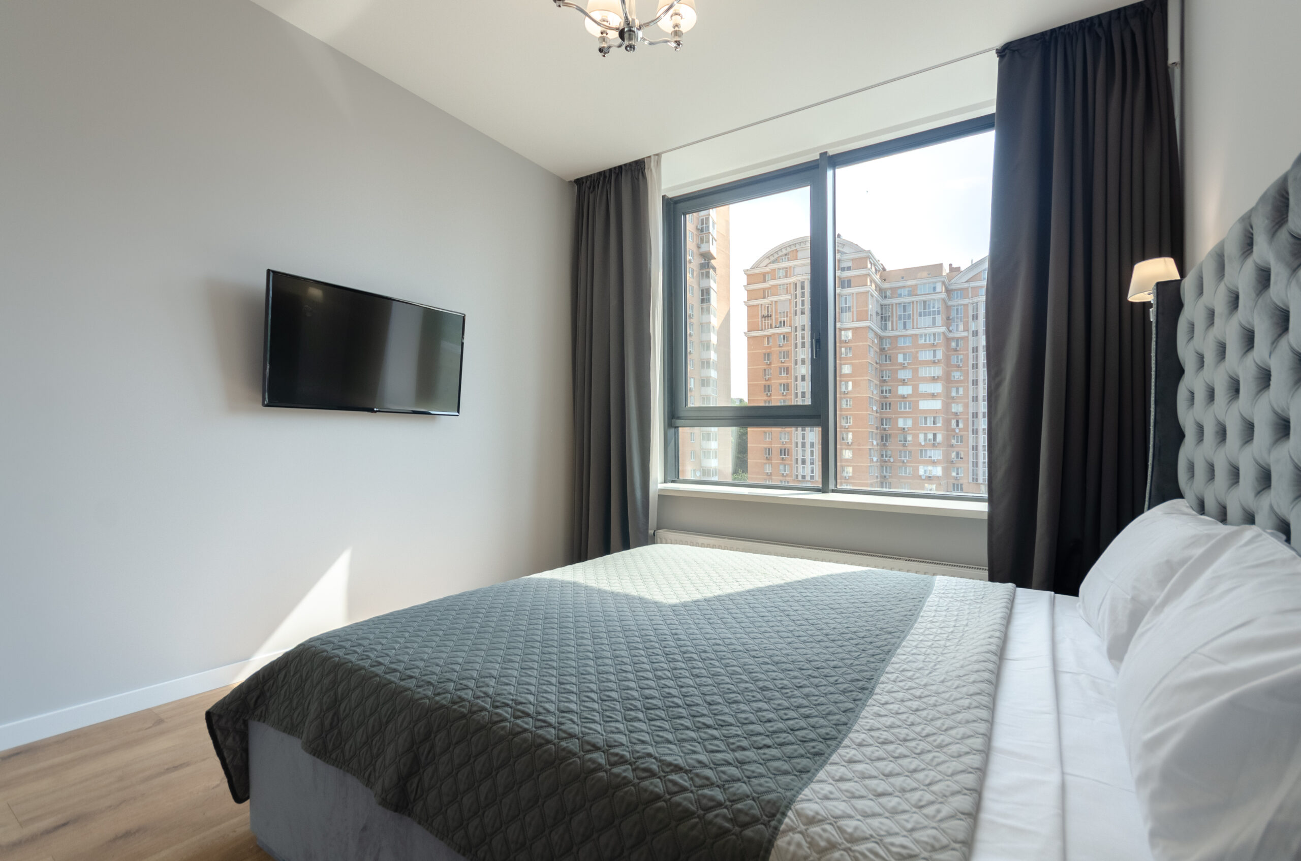 The apartment is located on the 10th floor with an area of 60 m, has a separate elegant bedroom, living room – kitchen with access to the loggia and a bathroom.