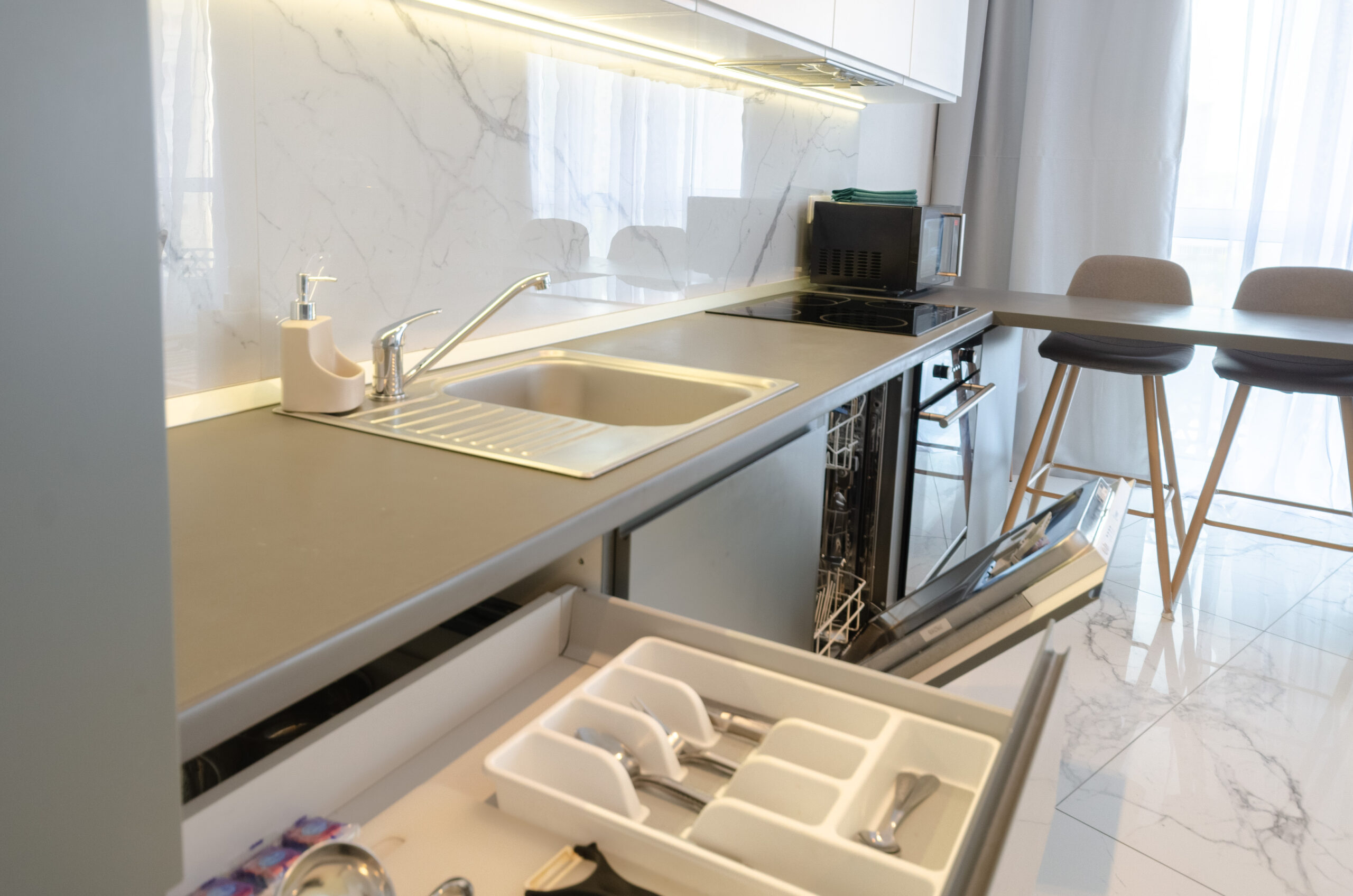 The apartment is fully equipped with everything necessary for a comfortable stay for any period.
